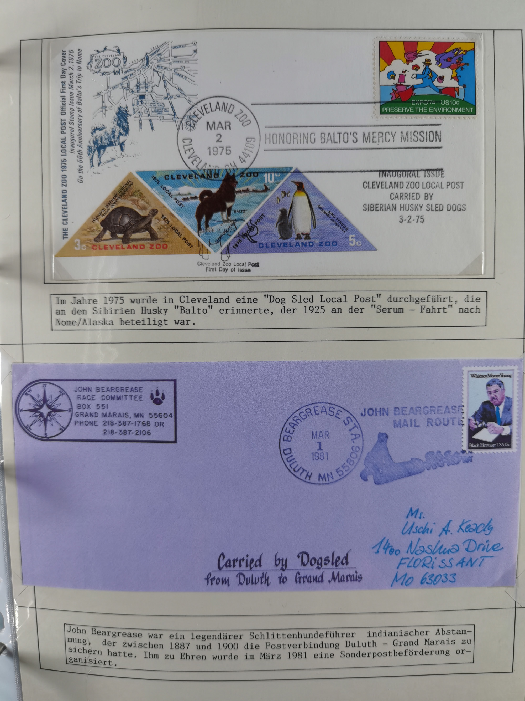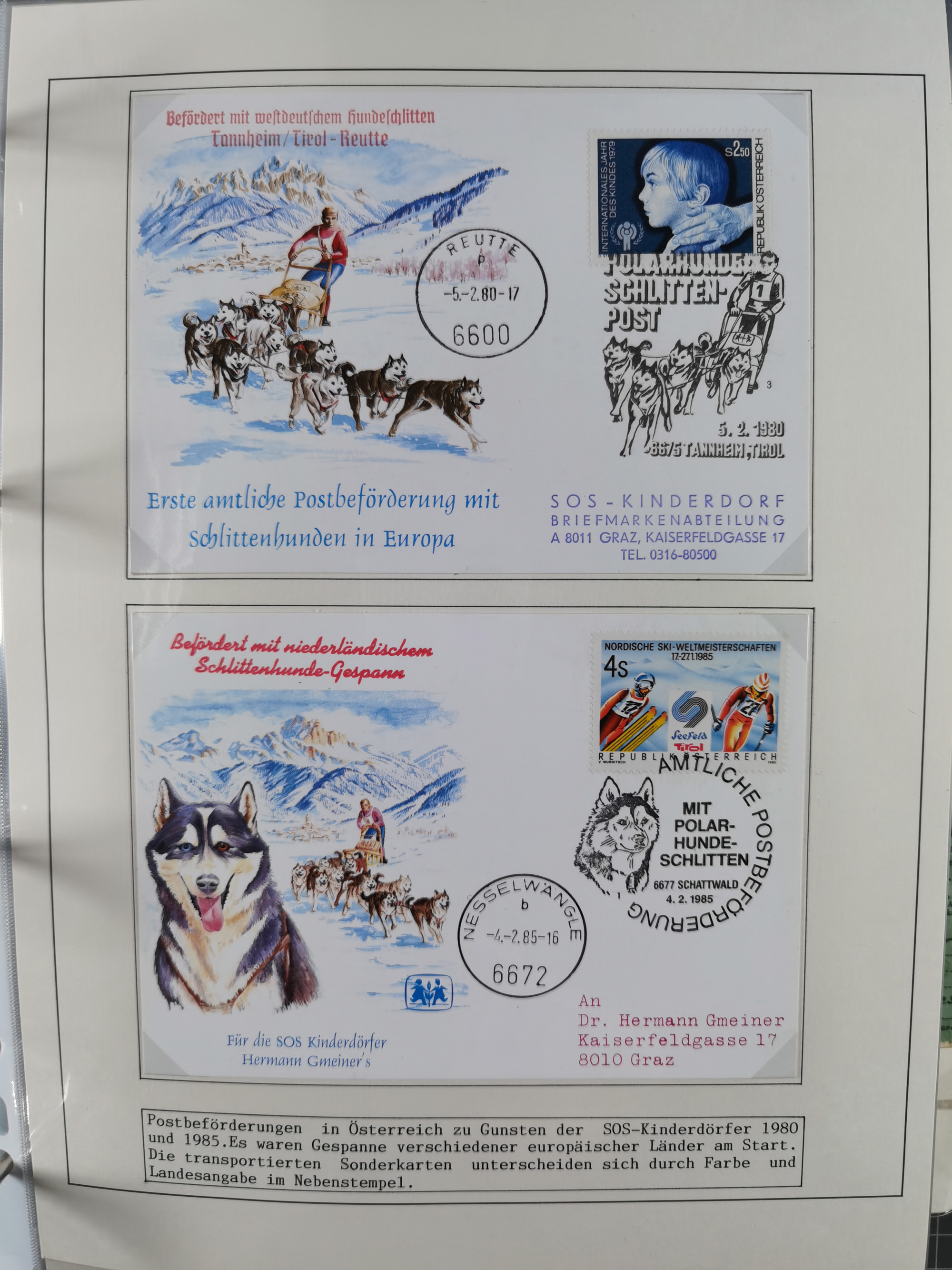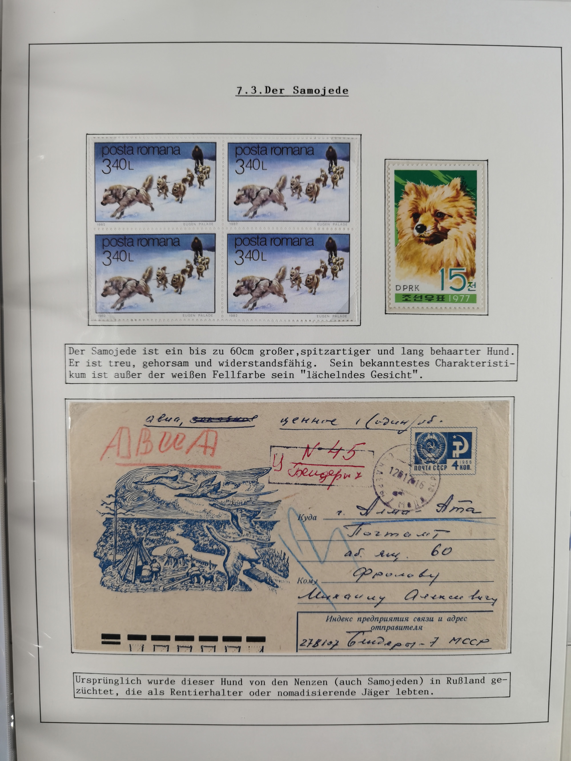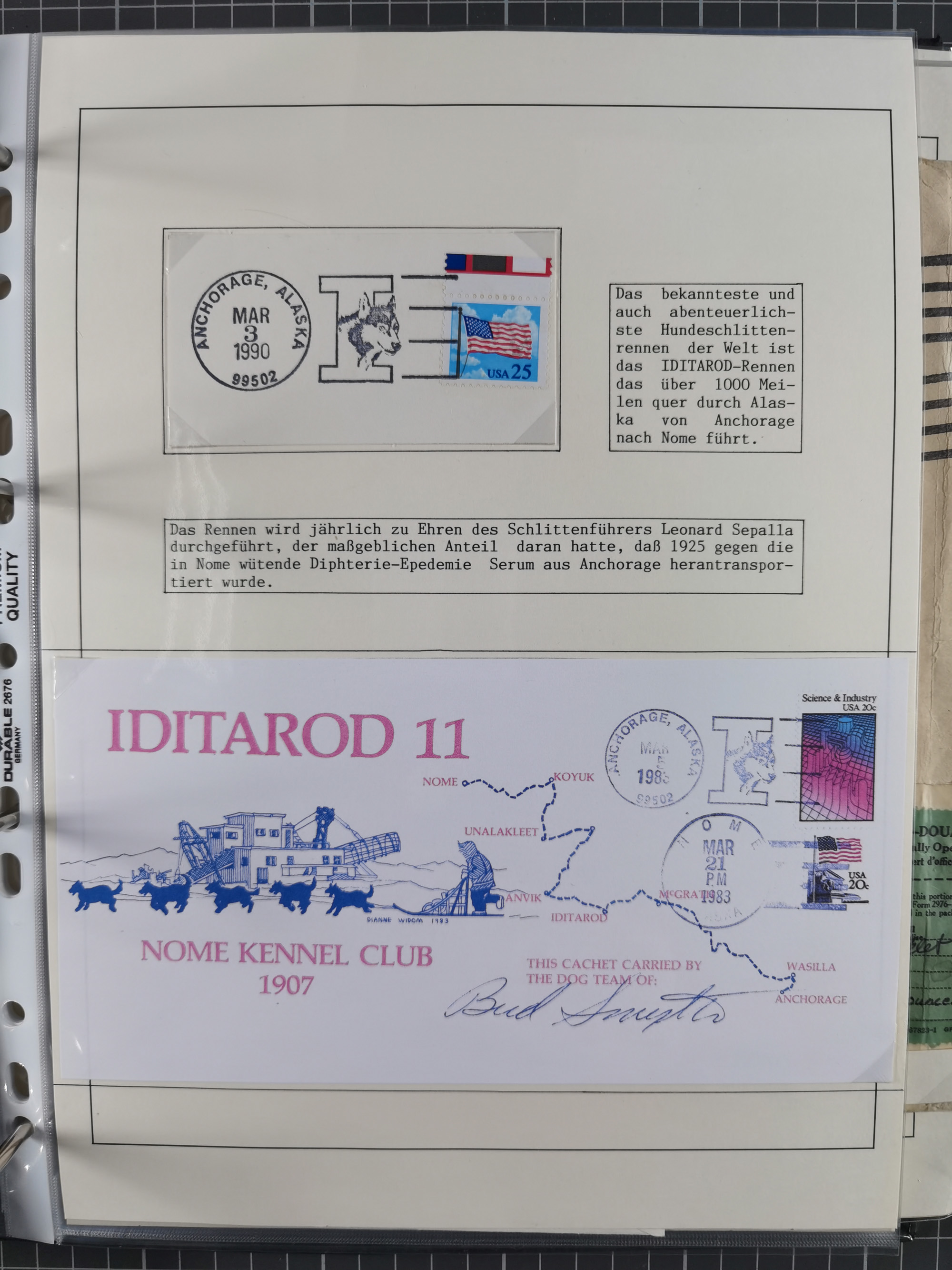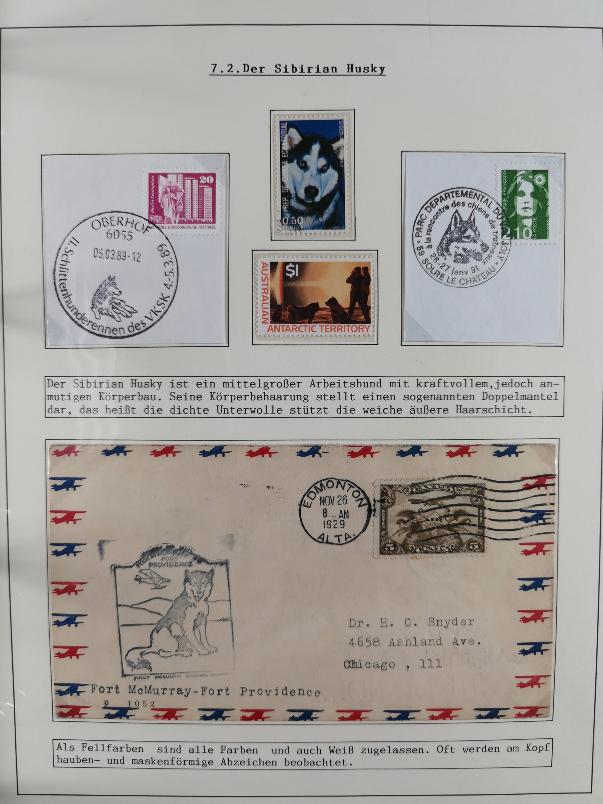 HUNDE: 1894/1992 (ca.), interessante Ausstellungssammlung “Schlittenhunde im Einsatz”, mit vielen Marken, FDCs, Schmuckbriefen, Telefonkarten, dabei frühes und besseres Material, ferner etwas Literatur, in zwei Ordnern