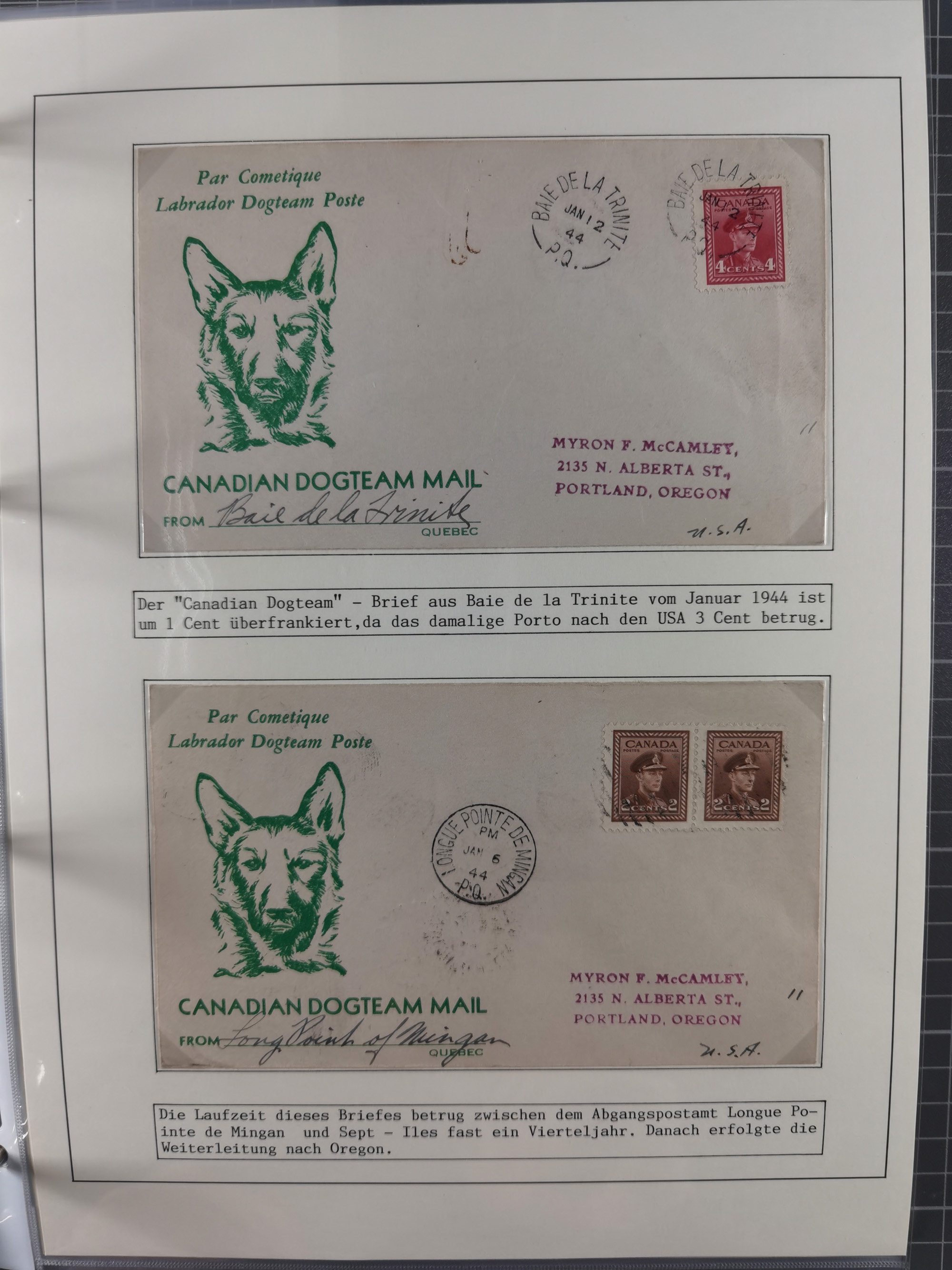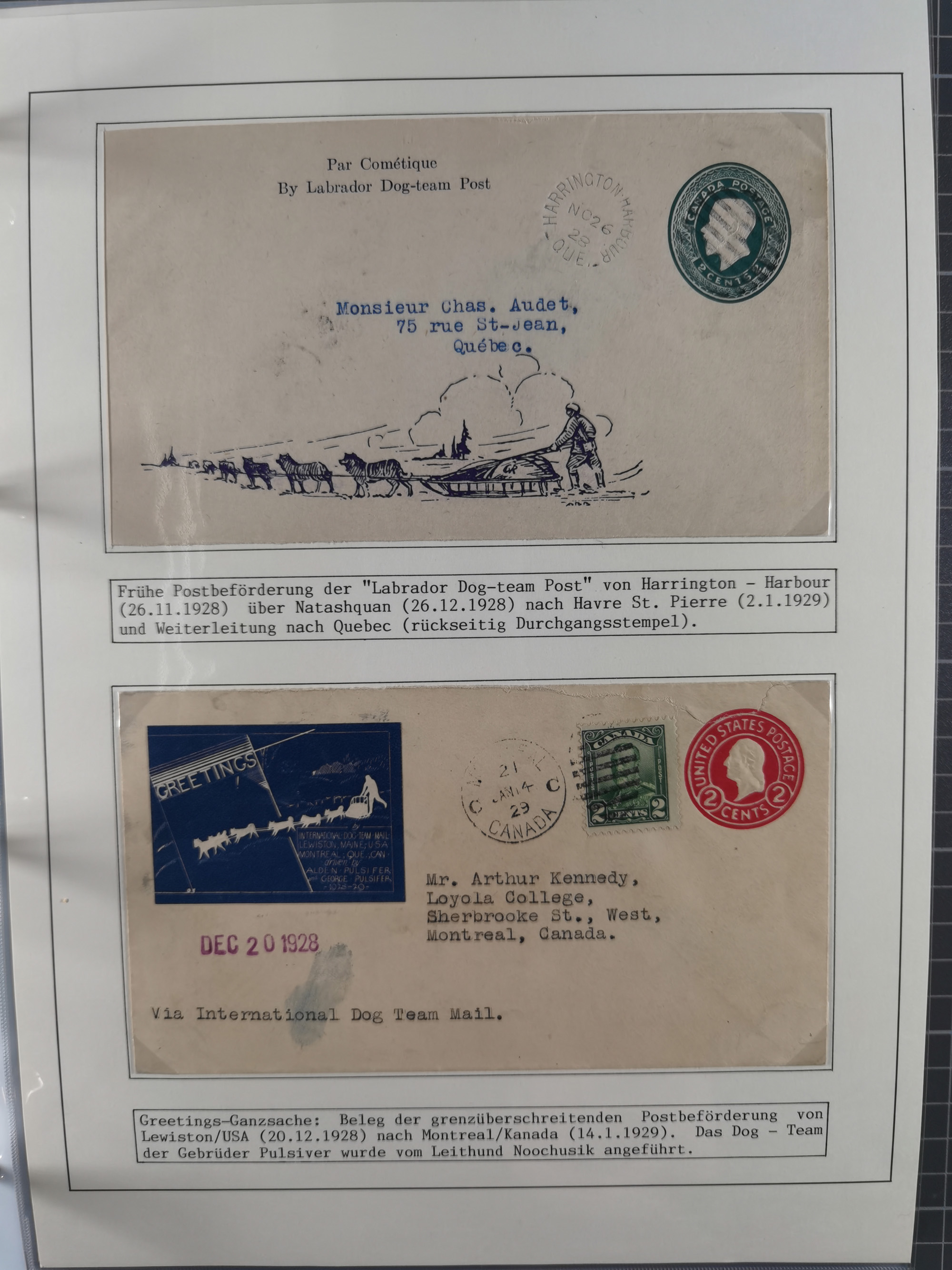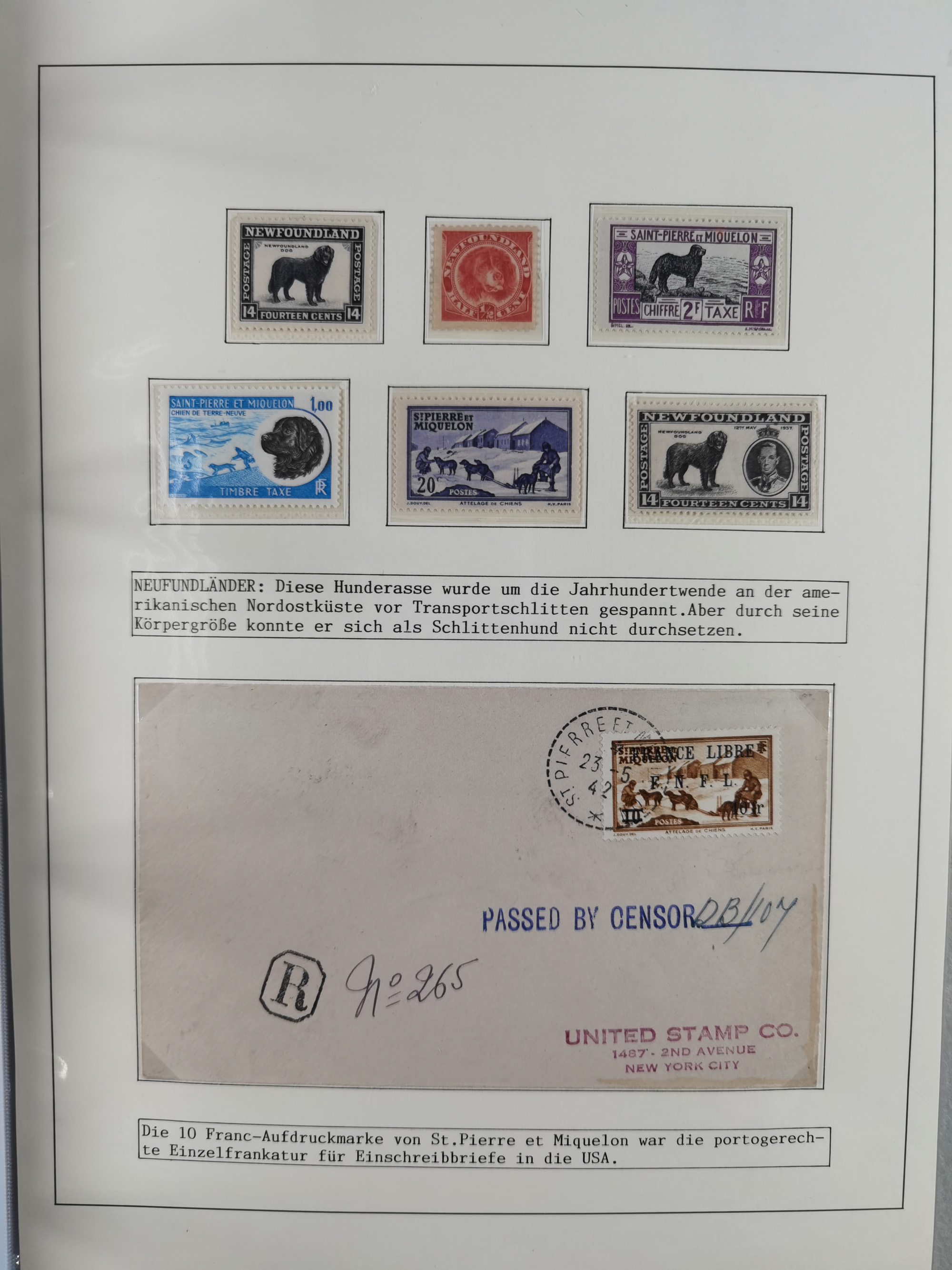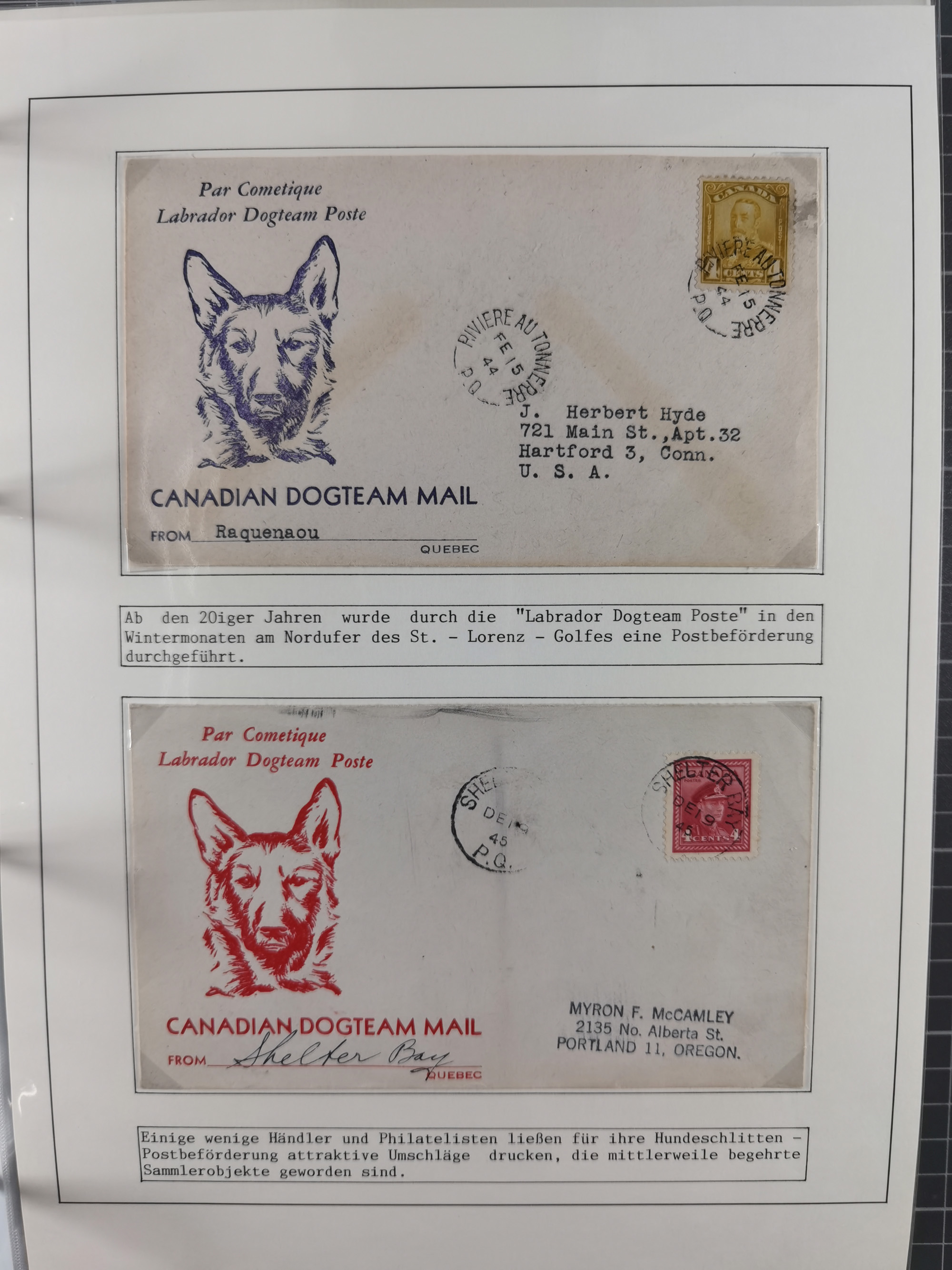 HUNDE: 1893/2010 (ca.), interessante Sammlung mit Schwerpunkt Schlittenhunde, dabei ca. 500 Briefe und Karten, mit u.a. Neufundland Mi.-Nr. 35 im 4er-Block auf Ganzsachenumschlag, 115 FDC, 193II auf Brief, 193 (25), ferner Kanada, USA, Grönland mit u.a. Mi.-Nr. 13 4er-Block auf Brief und Belgien mit u.a. Werbestempeln, Flugpost-Cachets, “By labrador dog team post”, Dogteam-Mail, etc., viele bessere, ferner etwas Literatur, gute Erhaltung