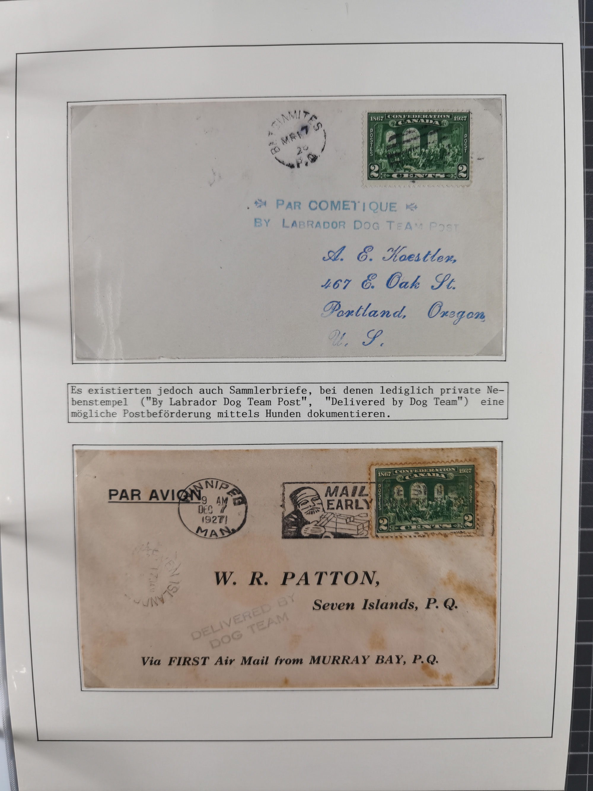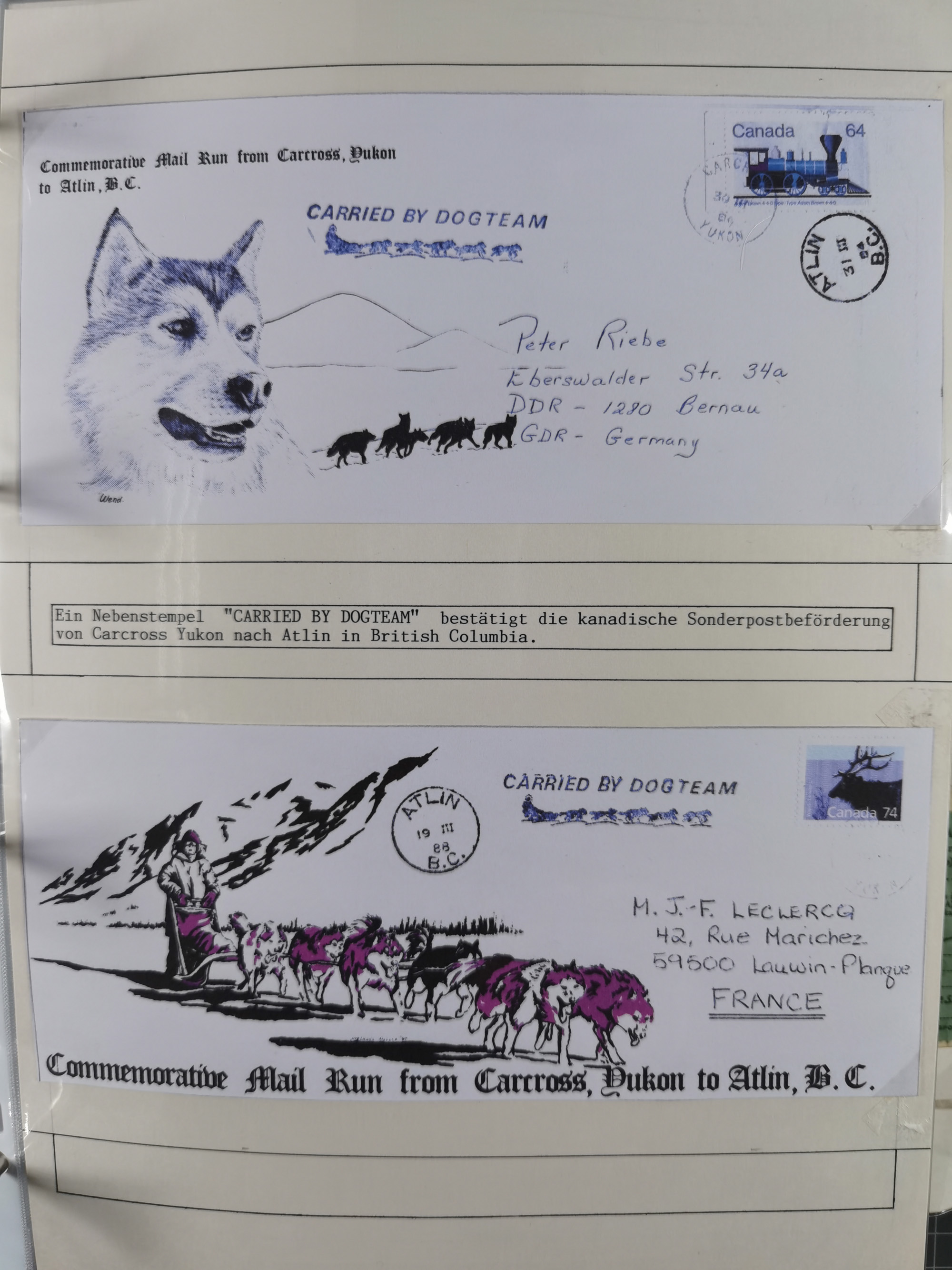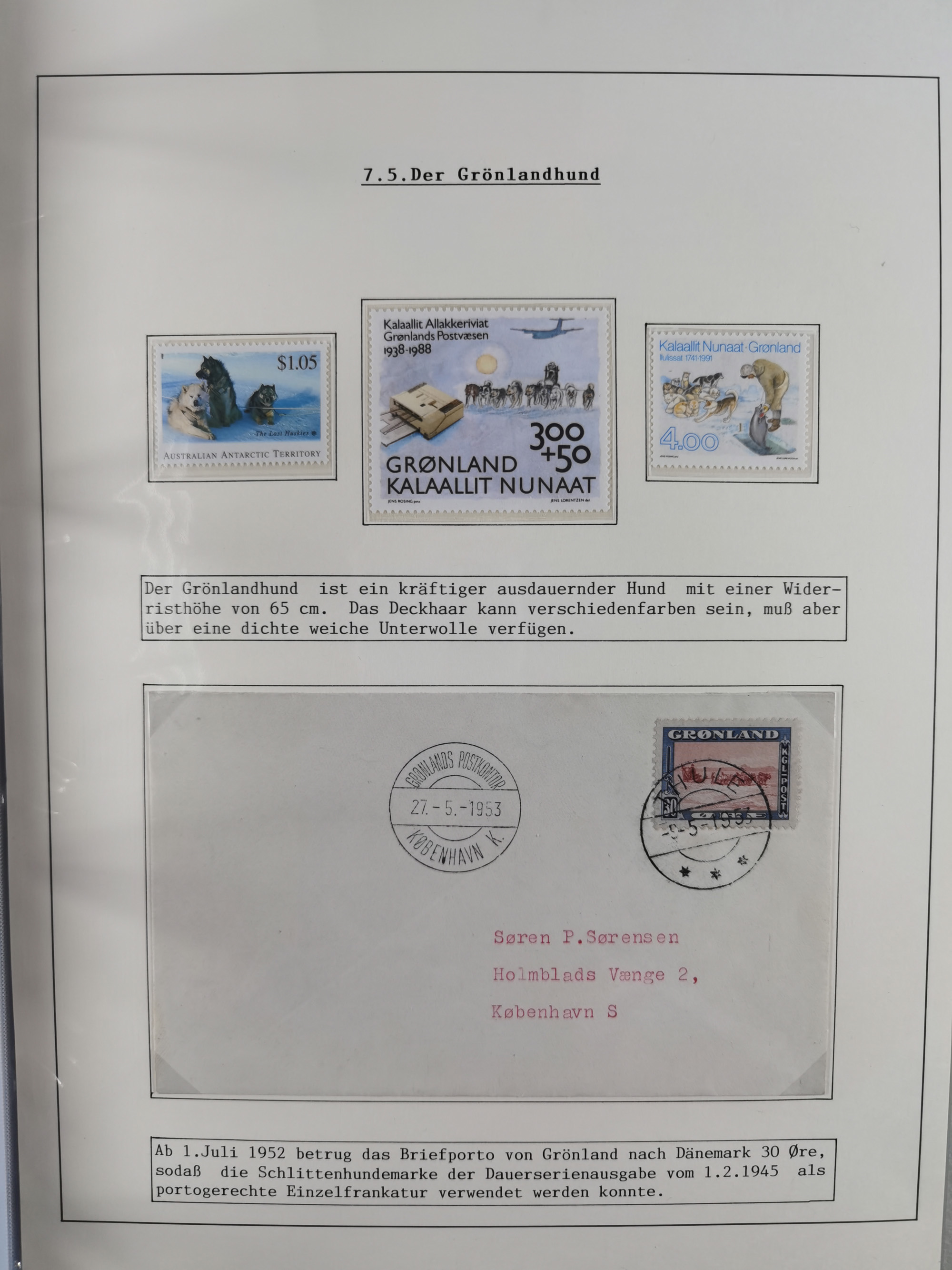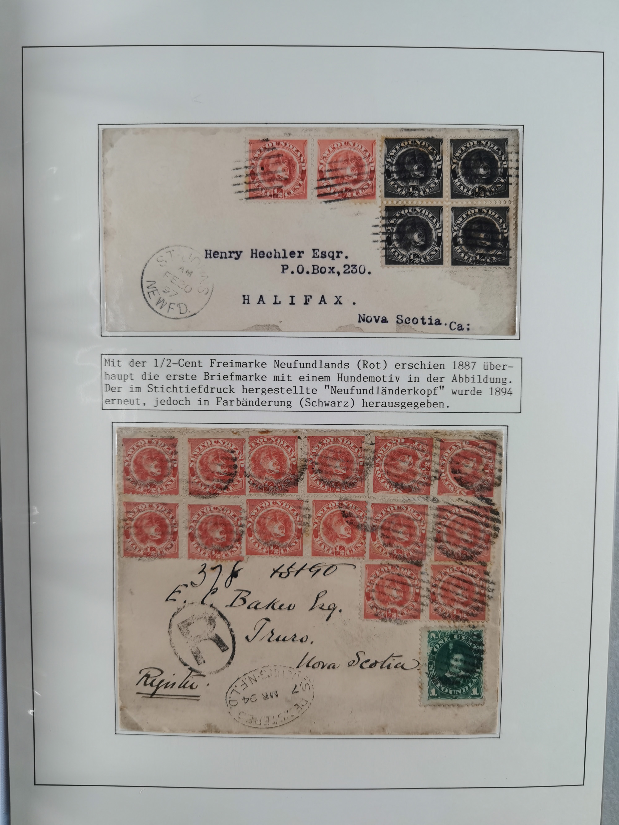 HUNDE: 1893/2010 (ca.), interessante Sammlung mit Schwerpunkt Schlittenhunde, dabei ca. 500 Briefe und Karten, mit u.a. Neufundland Mi.-Nr. 35 im 4er-Block auf Ganzsachenumschlag, 115 FDC, 193II auf Brief, 193 (25), ferner Kanada, USA, Grönland mit u.a. Mi.-Nr. 13 4er-Block auf Brief und Belgien mit u.a. Werbestempeln, Flugpost-Cachets, “By labrador dog team post”, Dogteam-Mail, etc., viele bessere, ferner etwas Literatur, gute Erhaltung