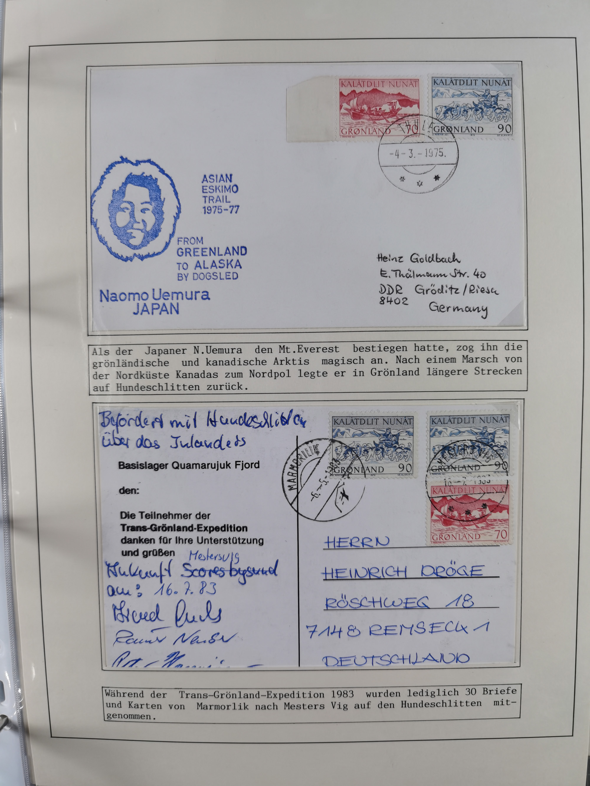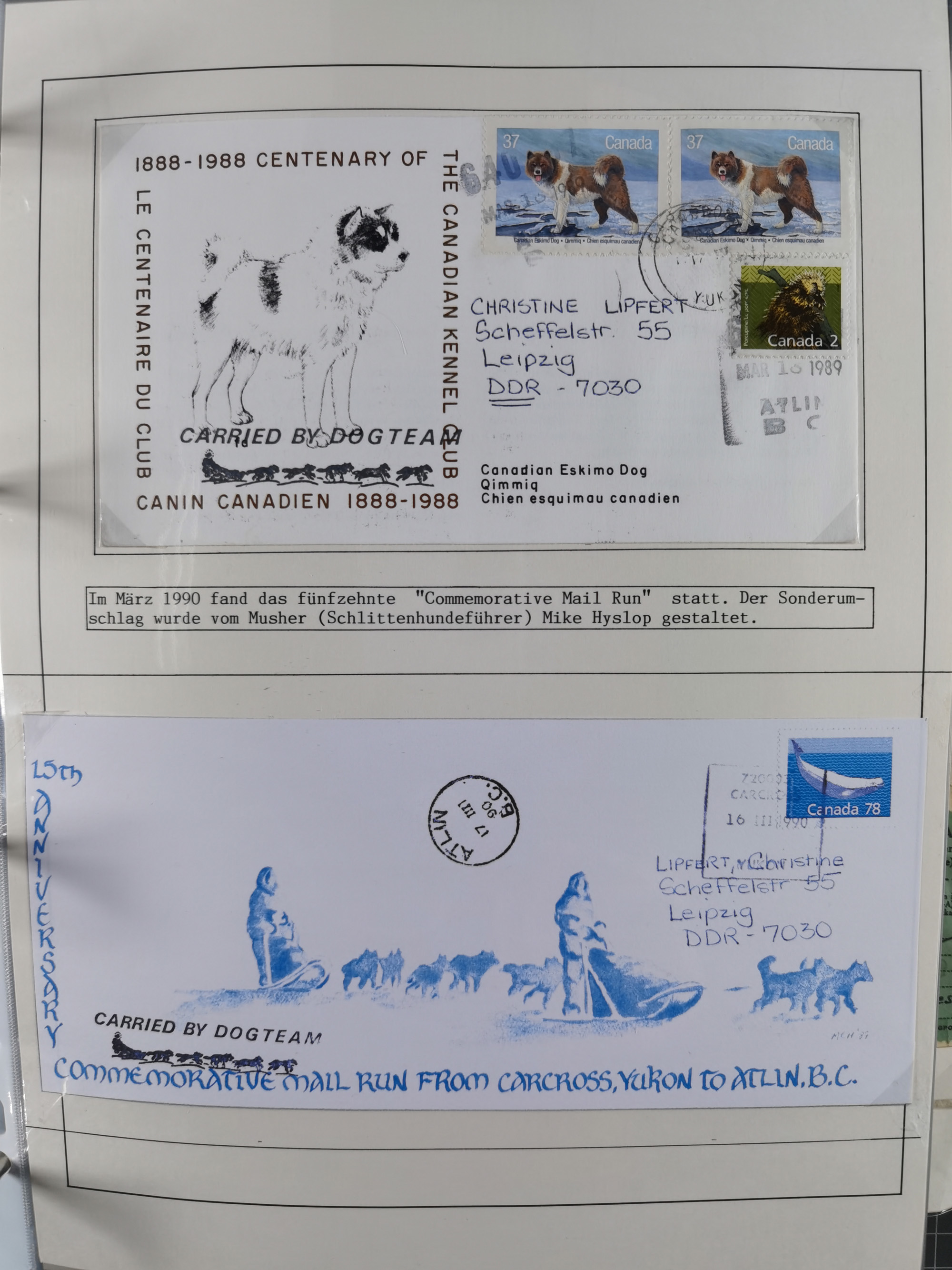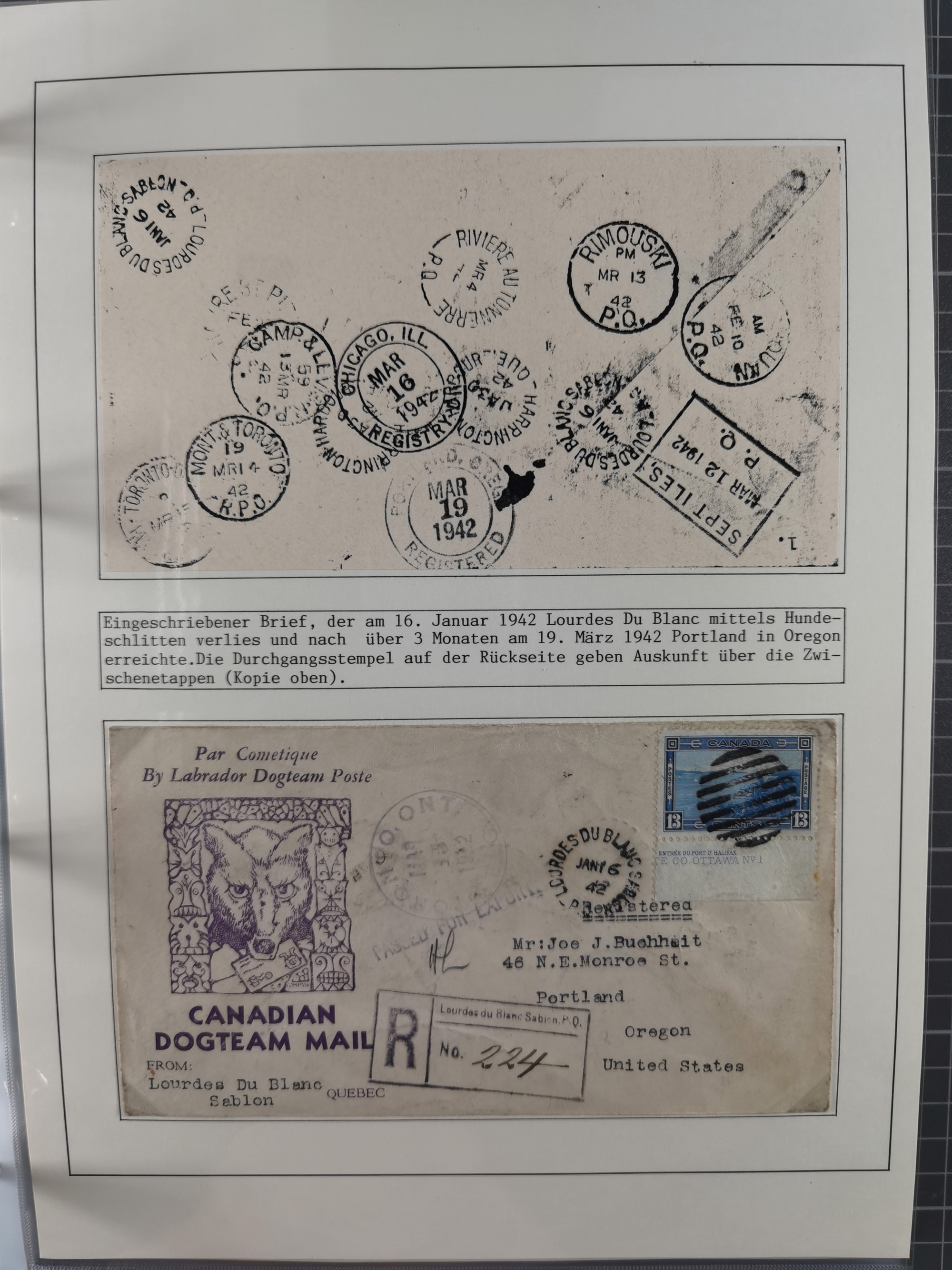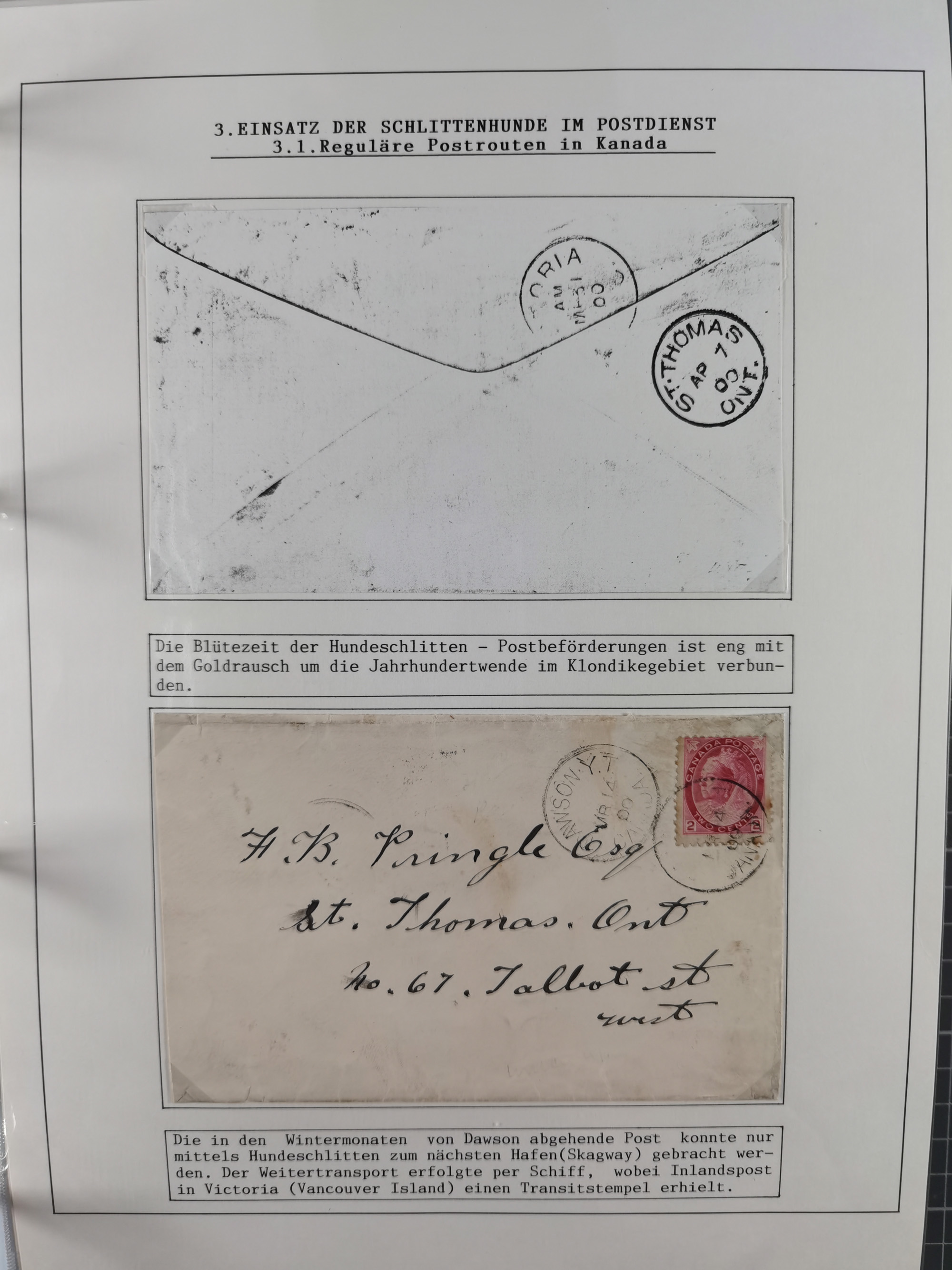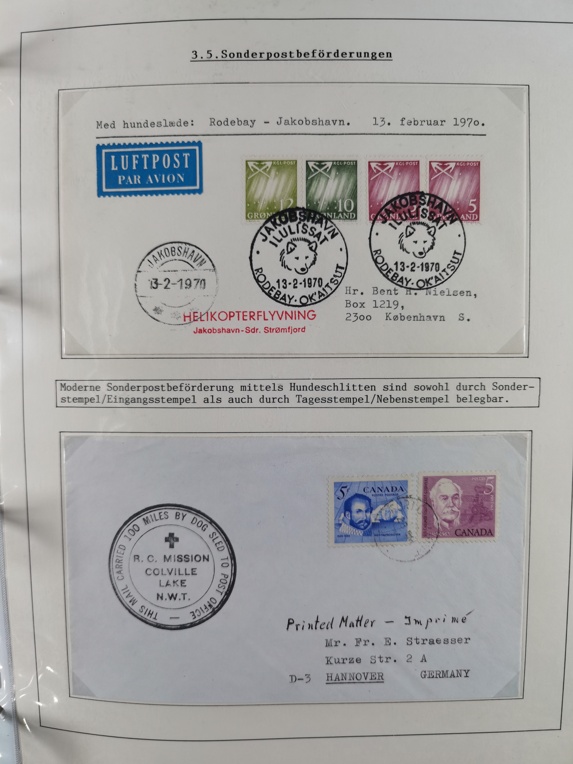 HUNDE: 1893/2010 (ca.), interessante Sammlung mit Schwerpunkt Schlittenhunde, dabei ca. 500 Briefe und Karten, mit u.a. Neufundland Mi.-Nr. 35 im 4er-Block auf Ganzsachenumschlag, 115 FDC, 193II auf Brief, 193 (25), ferner Kanada, USA, Grönland mit u.a. Mi.-Nr. 13 4er-Block auf Brief und Belgien mit u.a. Werbestempeln, Flugpost-Cachets, “By labrador dog team post”, Dogteam-Mail, etc., viele bessere, ferner etwas Literatur, gute Erhaltung