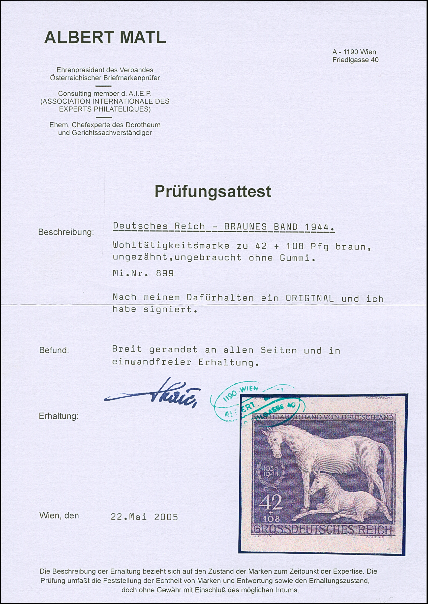 1944, Braunes Band 42 Pfg. ungezähnt, ungebraucht ohne Gummierung mit leichten Farbspuren, signiert Matl mit Befund (2005)