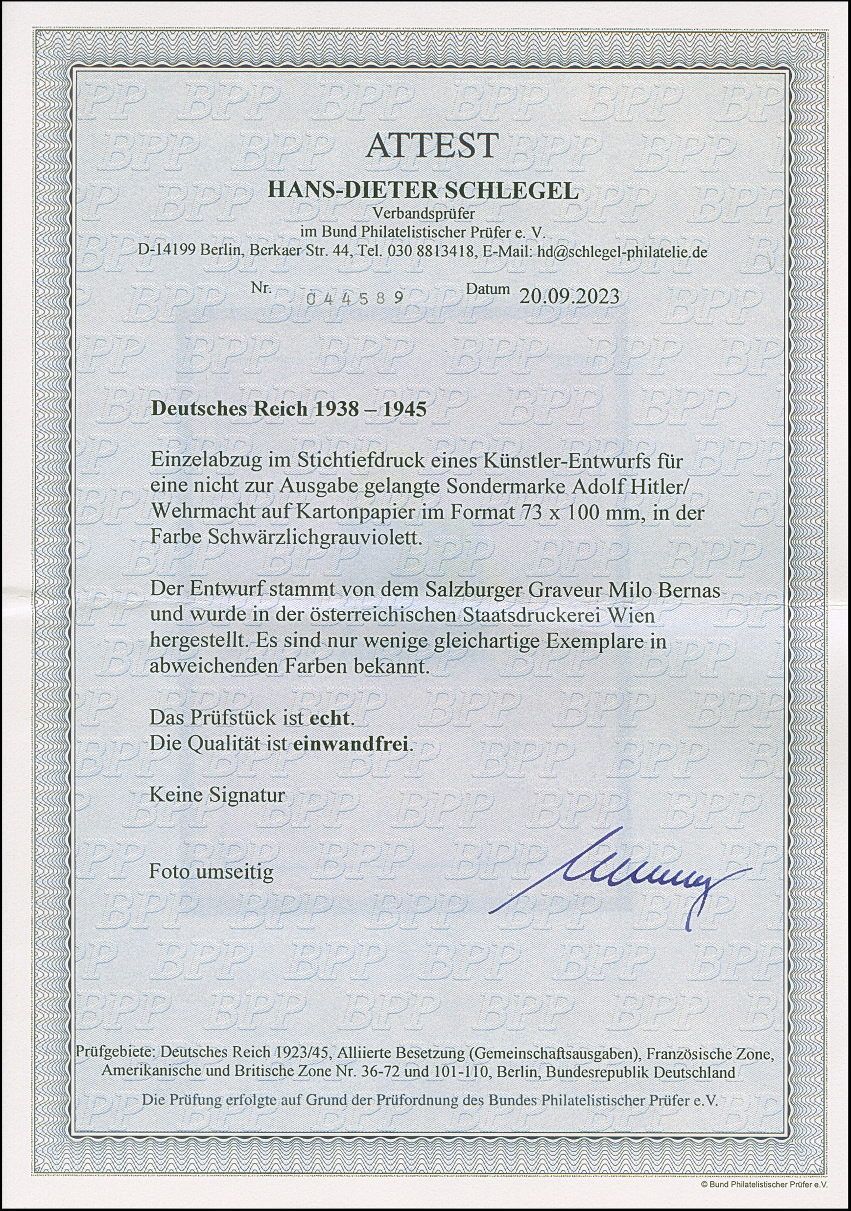1945, Einzelabzug eines Künstler-Entwurfs im Stichtiefdruck für eine nicht zur Ausgabe gelangte Sondermarke Adolf Hitler und Wehrmacht in der Farbe Schwärzlichgrauviolett im Format 73 x 100 mm. Der Entwurf stammt von dem Salzburger Graveur Milo Bernas und wurde von der Staatsdruckerei Wien hergestellt. Bisher sind nur ganz wenige gleichartige Exemplare in abweichenden Farben bekannt, Fotoattest D. Schlegel BPP (2023)