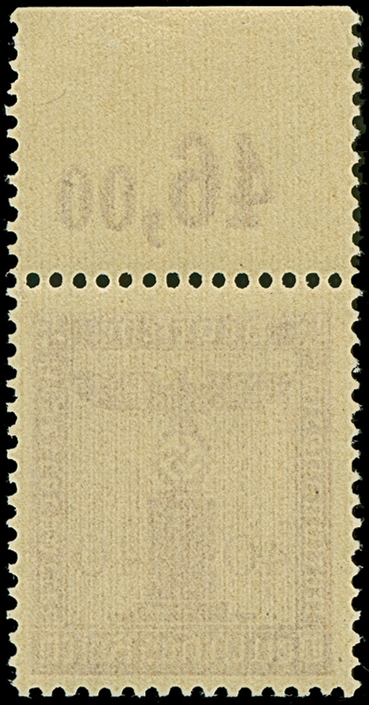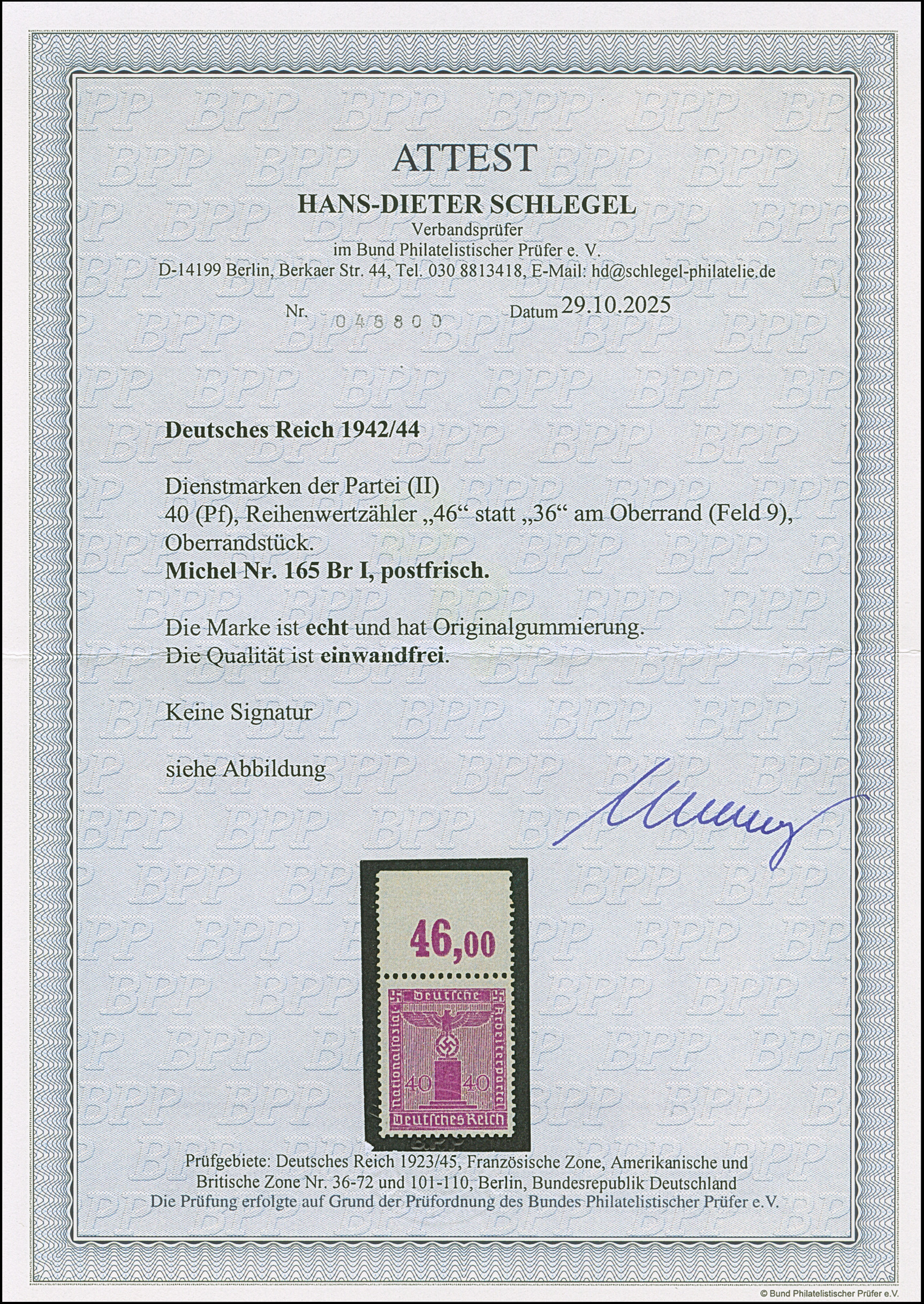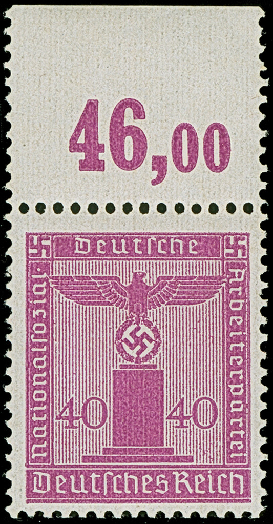1942/44, Partei-Dienstmarke 40 Pfg. mit Plattendruck-Oberrand mit Reihenwertzahl-Abart “46” statt “36”. Die postfrische Marke und der Oberrand ist in tadelloser Erhaltung, unsigniert mit Fotoattest D. Schlegel BPP (2025)