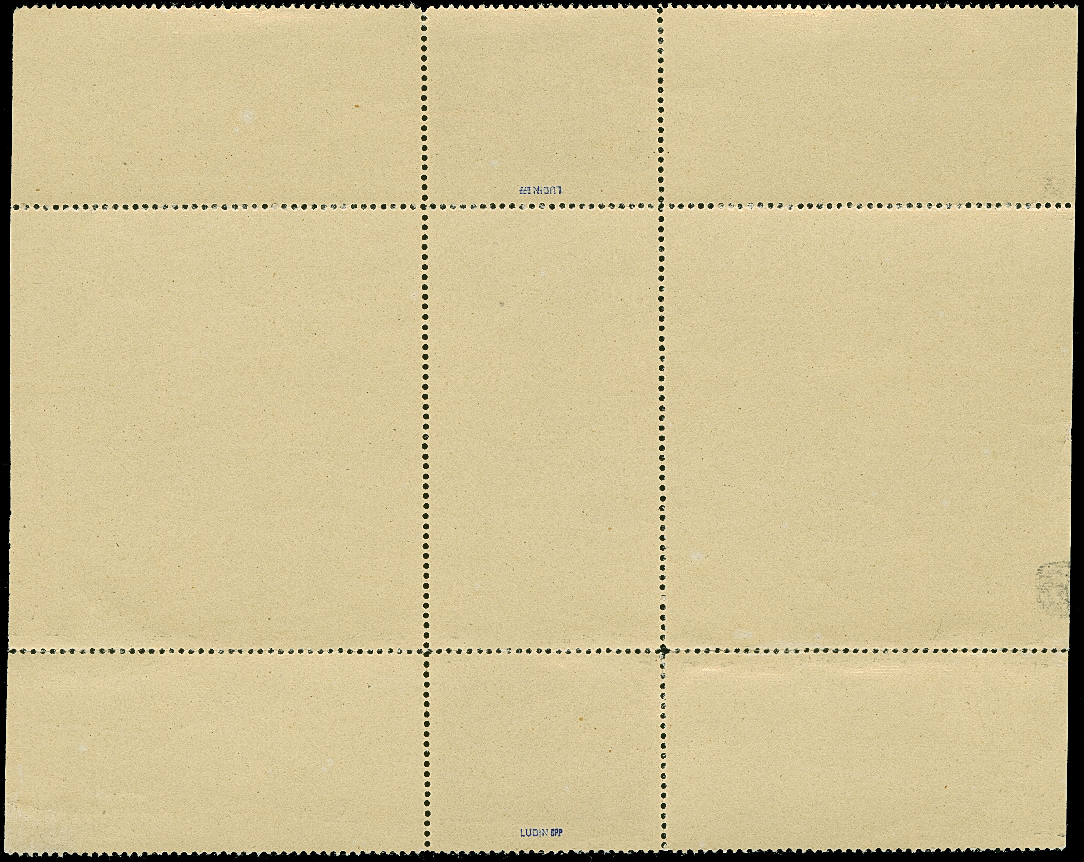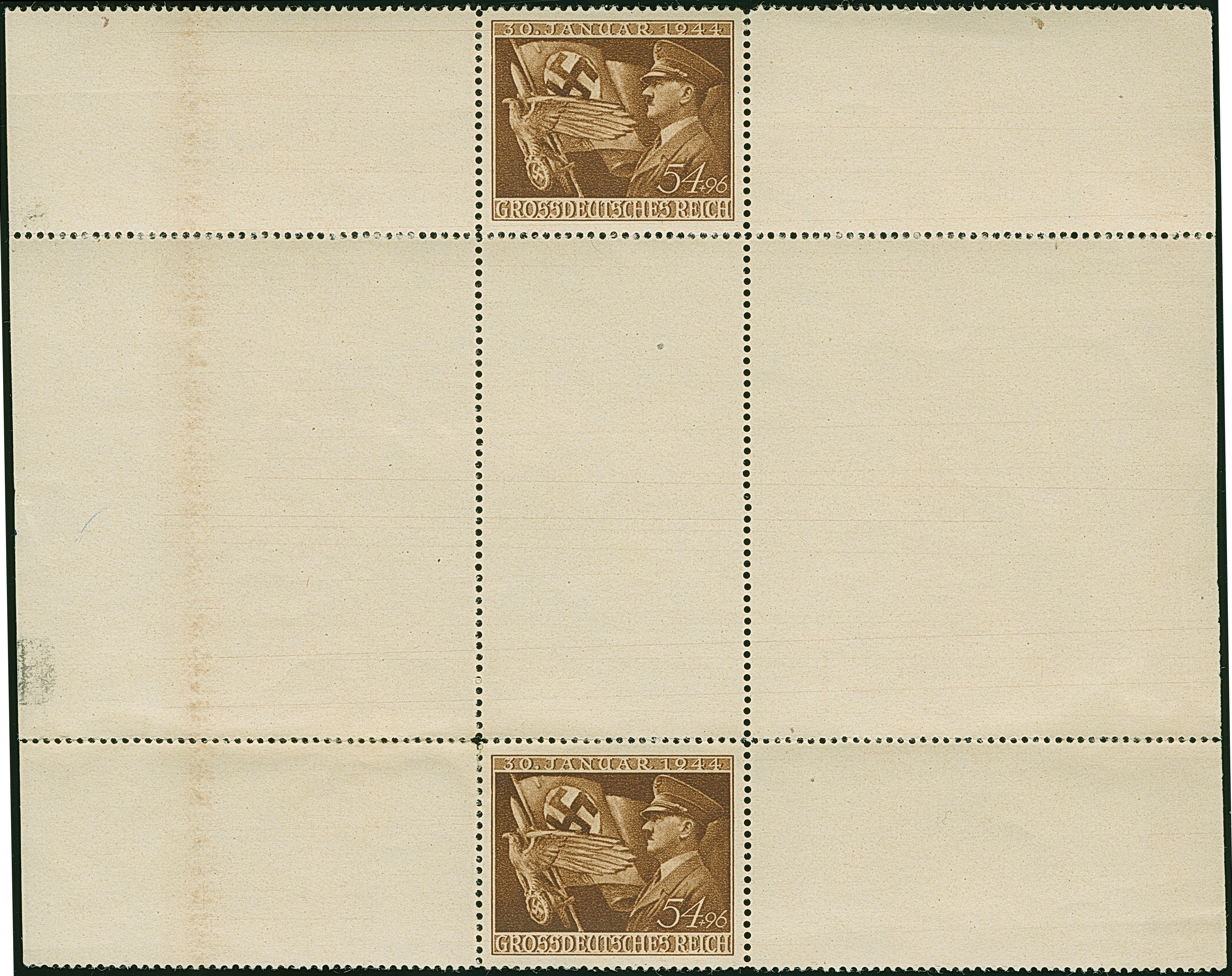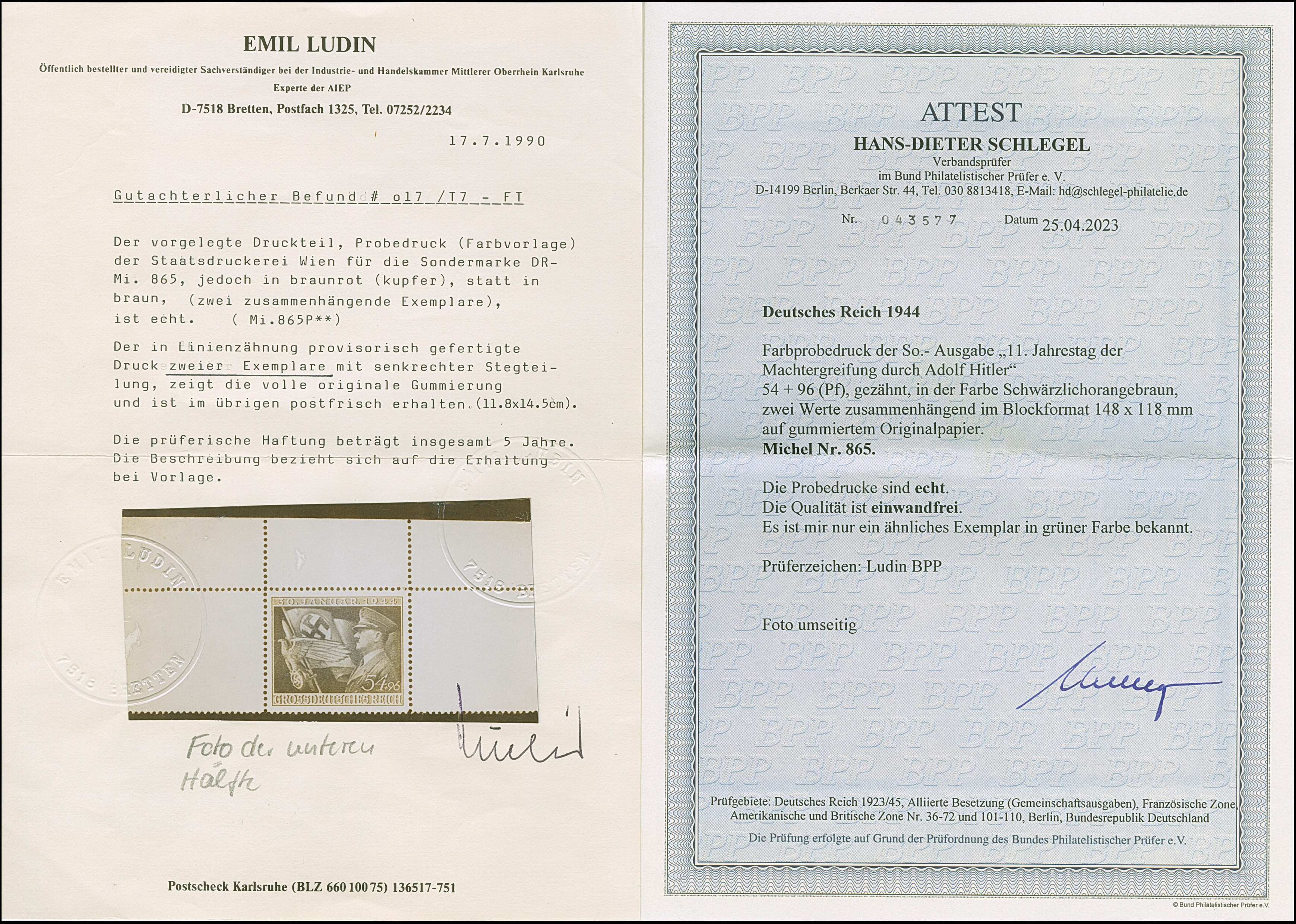 1944, 11. Jahrestag der Machtergreifung durch Adolf Hitler 54+96 Pfg. als gezähnter Probedruck in Schwärzlichorangebraun, zwei Werte zusammenhängend im Blockformat 148 x 118 mm mit durchgezähnten Rändern. Die postfrische Einheit mit gummifreien Stellen in den Rändern ist in einwandfreier Erhaltung. In dieser Kombination außerordentlich seltener und dekorativer Probedruck, ProFI hat kein weiteres Exemplar in dieser Farbe registriert, signiert Ludin BPP mit Fotoattest (1990) und Fotoattest D. Schlegel BPP (2023)