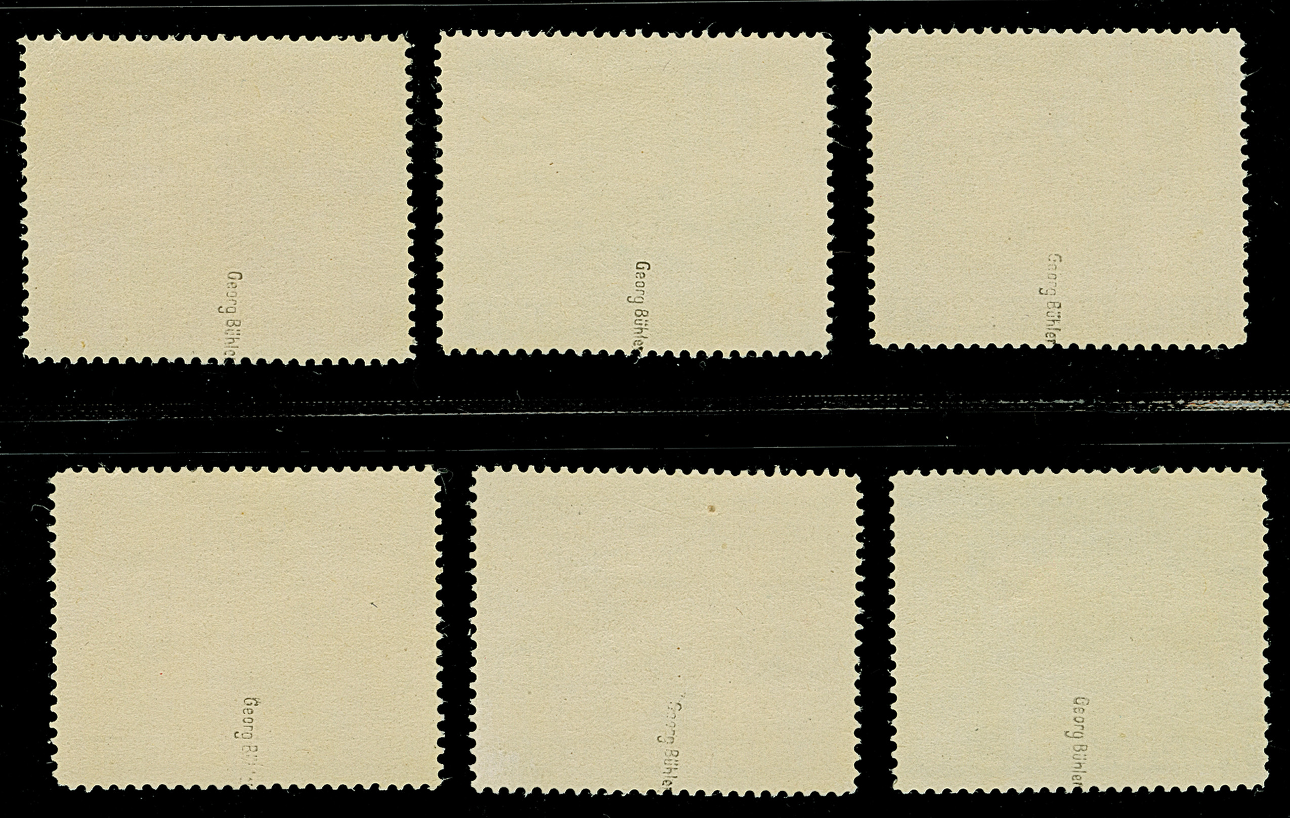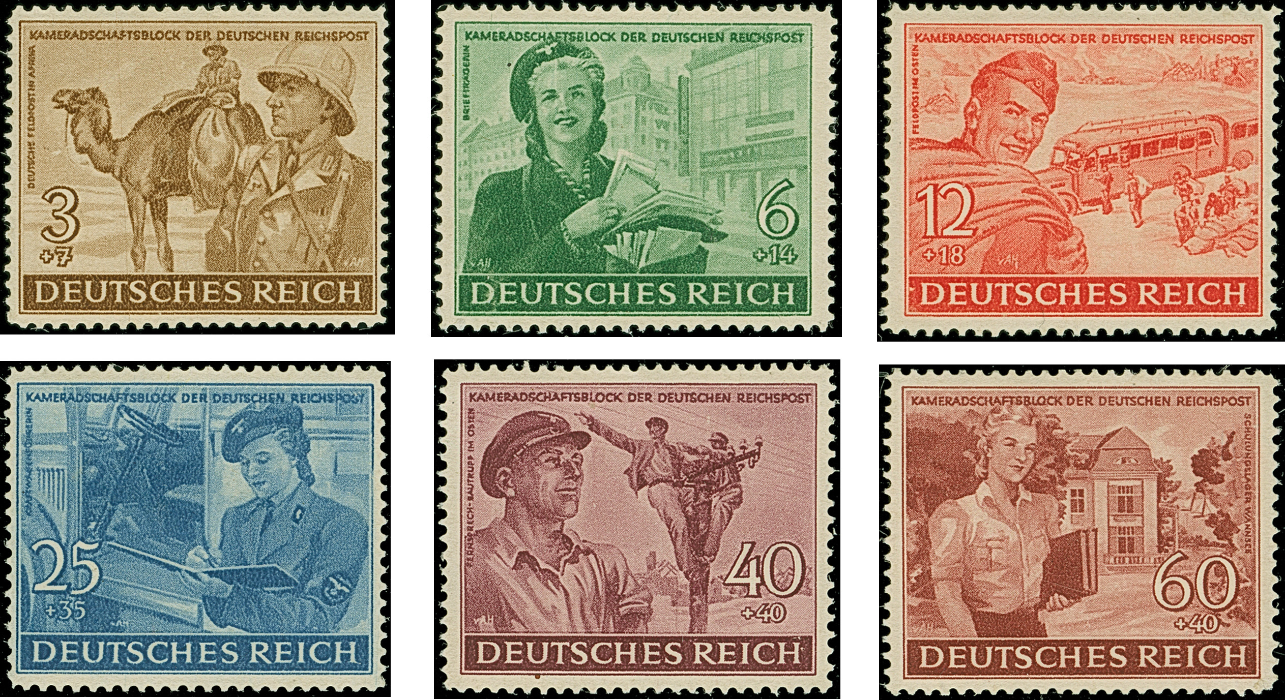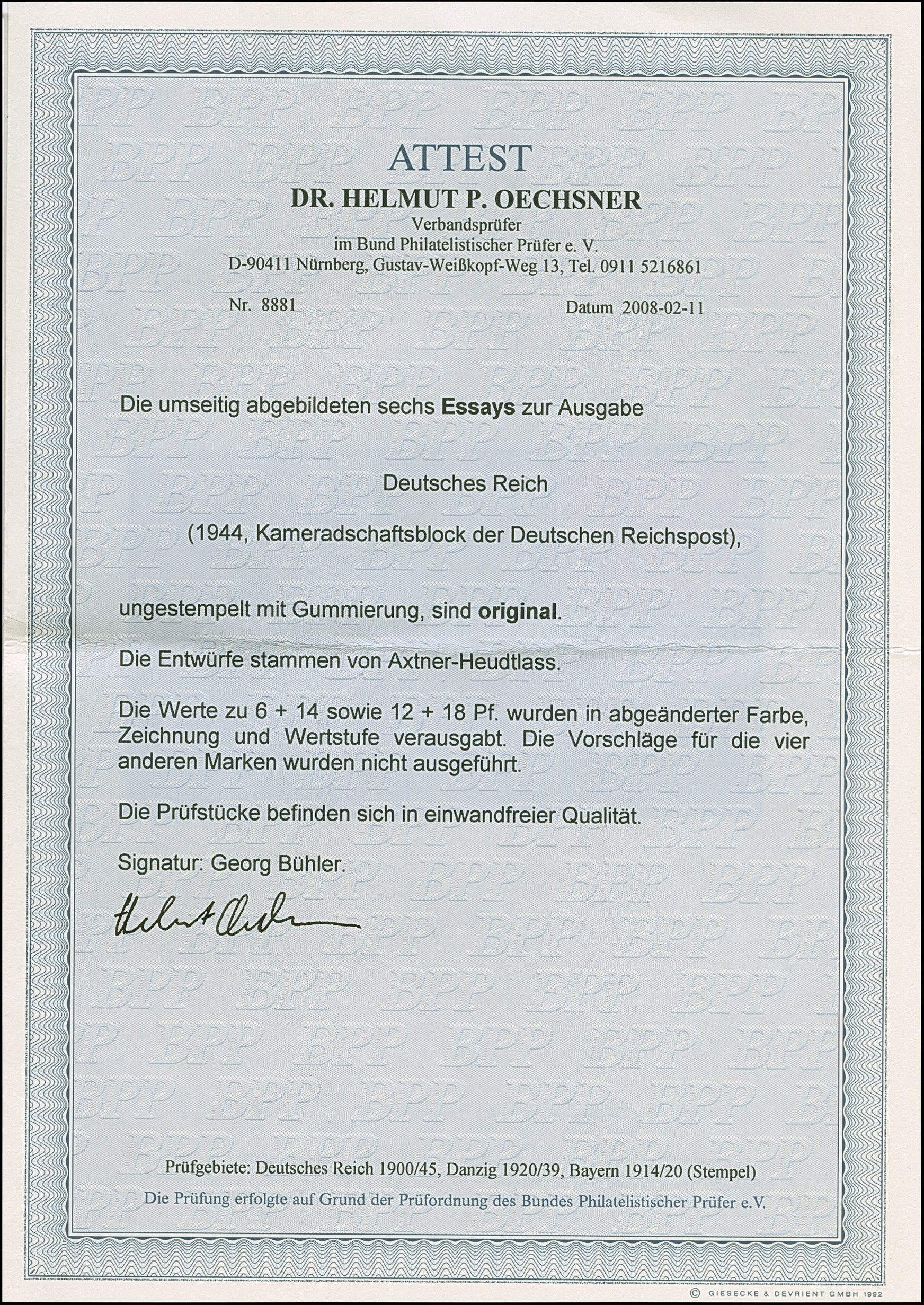 1944, Kameradschaftsblock der Deutschen Reichspost 3-60 Pfg. komplett als gezähnte Entwürfe von Axtner-Heudlass in anderen Farben bzw. anderen Wertstufen und vier später nicht ausgeführten Vorlagen. Die farbfrischen Marken sind postfrisch und in einwandfreier Erhaltung, in dieser Form sind nur ganz wenige komplette Sätze bekannt, signiert Bühler und Fotoattest Oechsner BPP (2008)