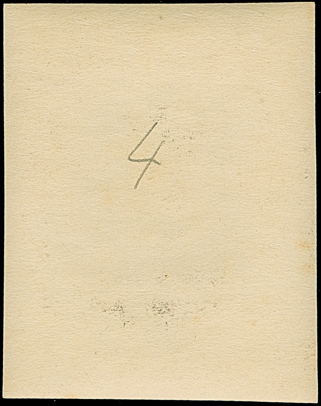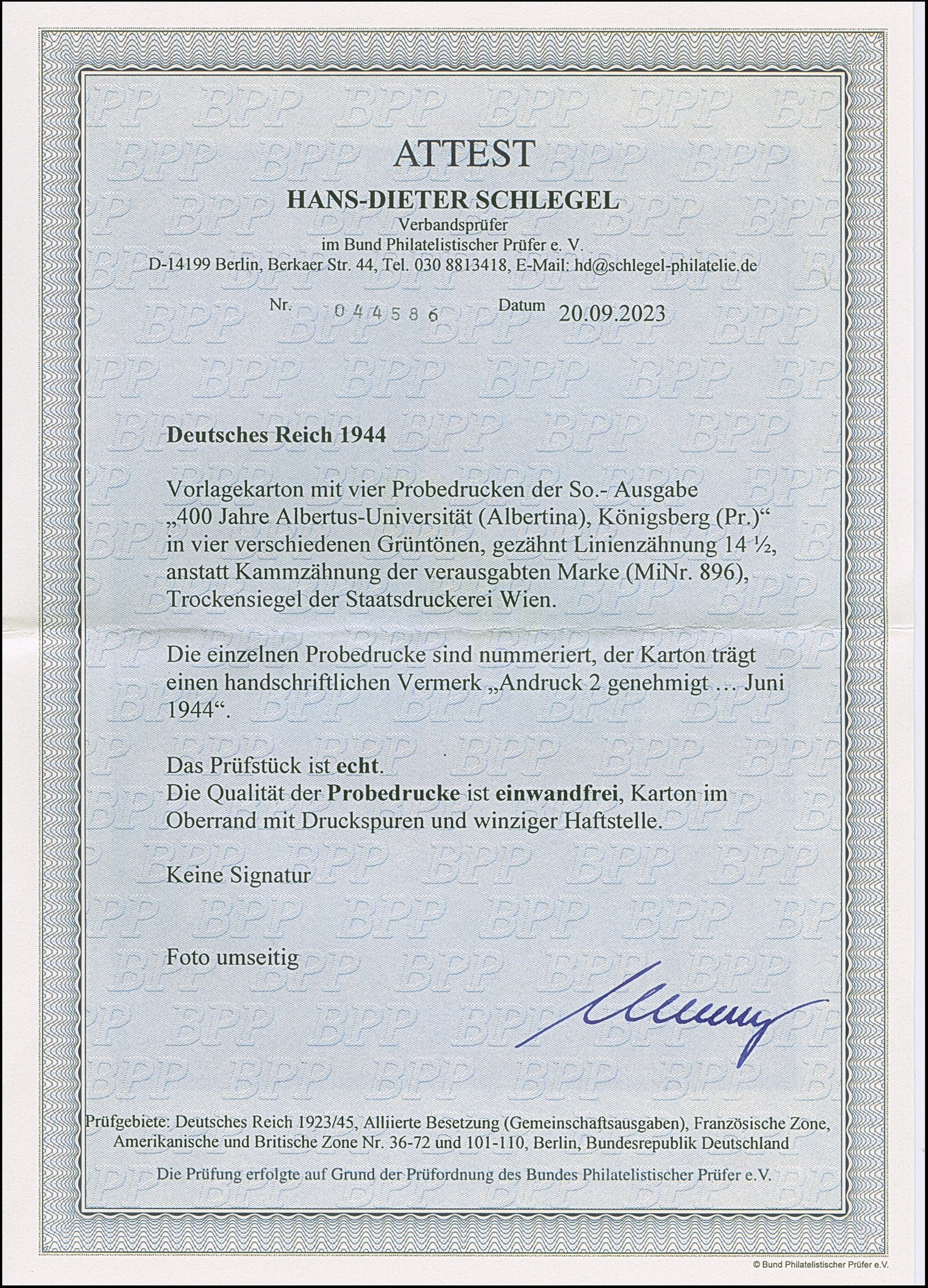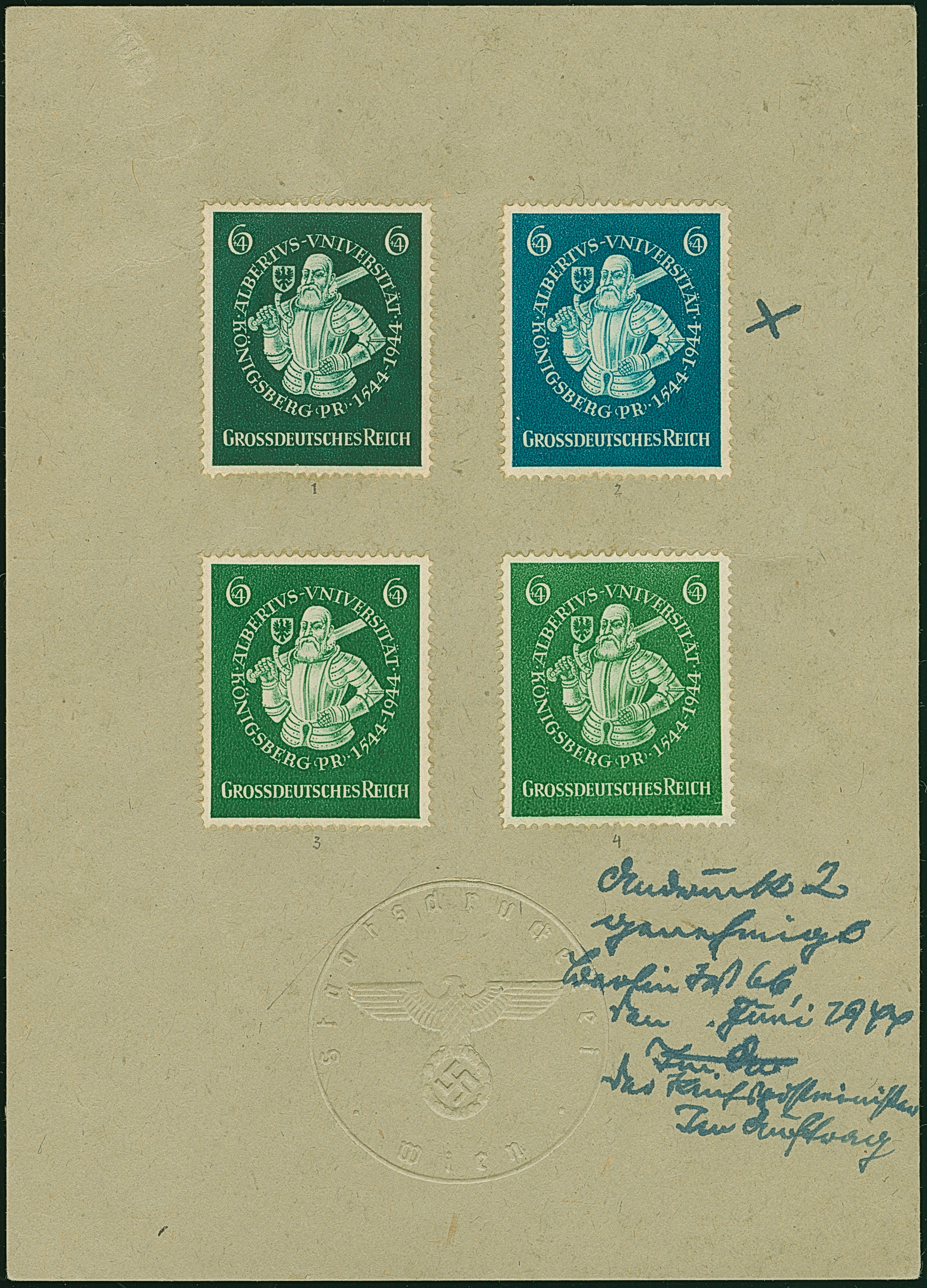 1944, 400 Jahre Albertus-Universität Königsberg 6 Pfg. als gezähnter Probedruck, vier Werte in verschiedenen Grüntönen auf Vorlagekarton mit Prägesiegel der Reichsdruckerei Wien und handschriftlicher Genehmigung der Farbe “2” vom Juni 1944. Im Oberrand mit Klammerspuren und winziger Haftstelle sowie leichte Patina, ansonsten in einwandfreier Erhaltung. In dieser Art ist kein weiteres Exemplar bekannt, Fotoattest D. Schlegel BPP (2023)