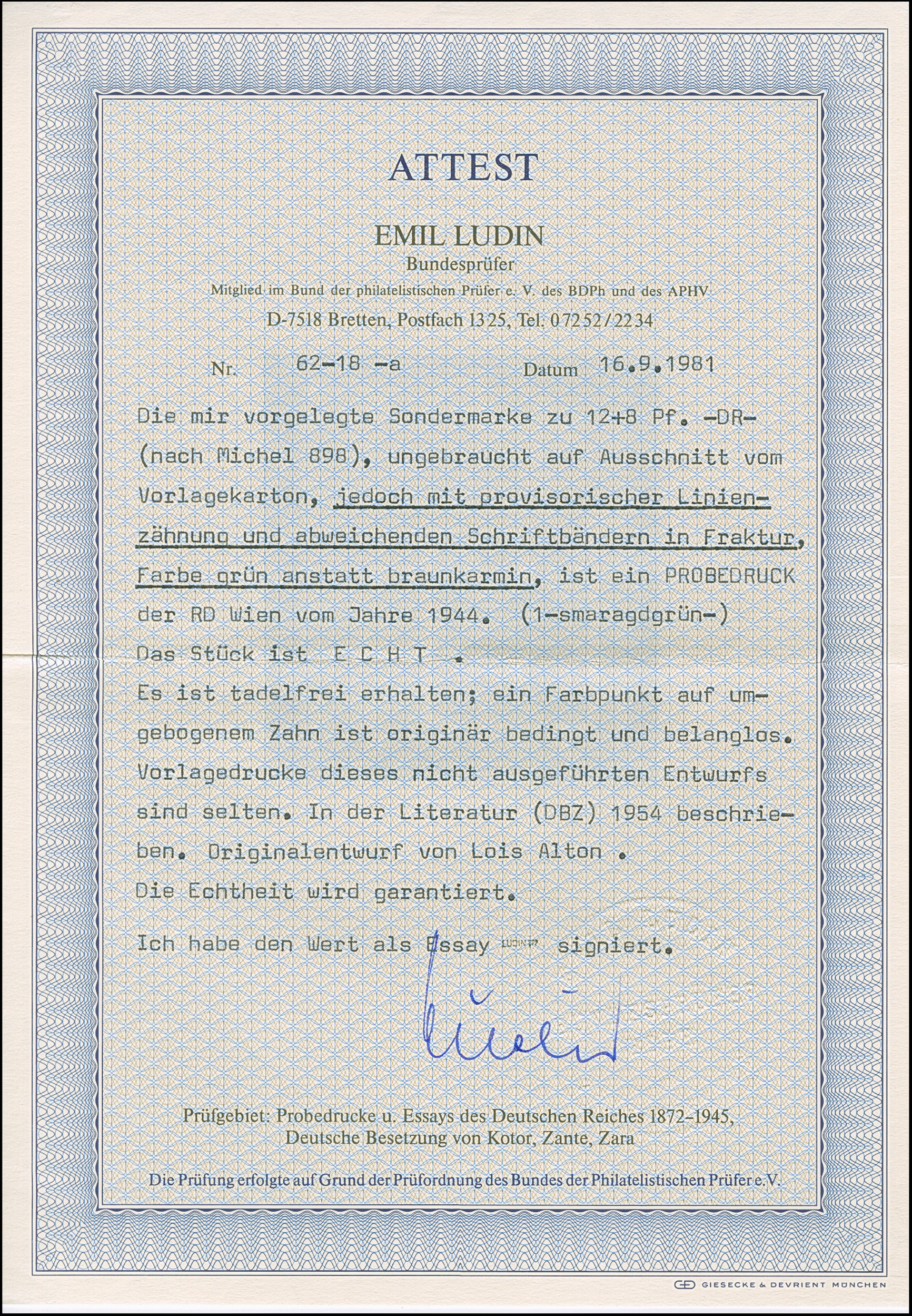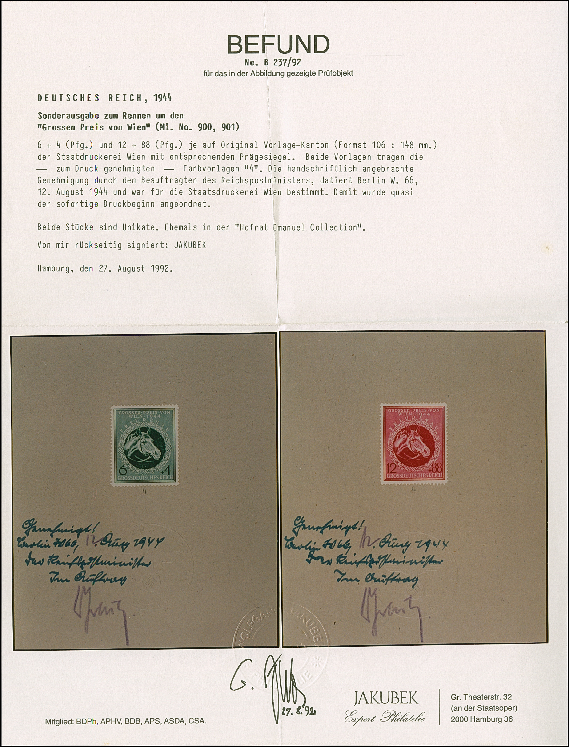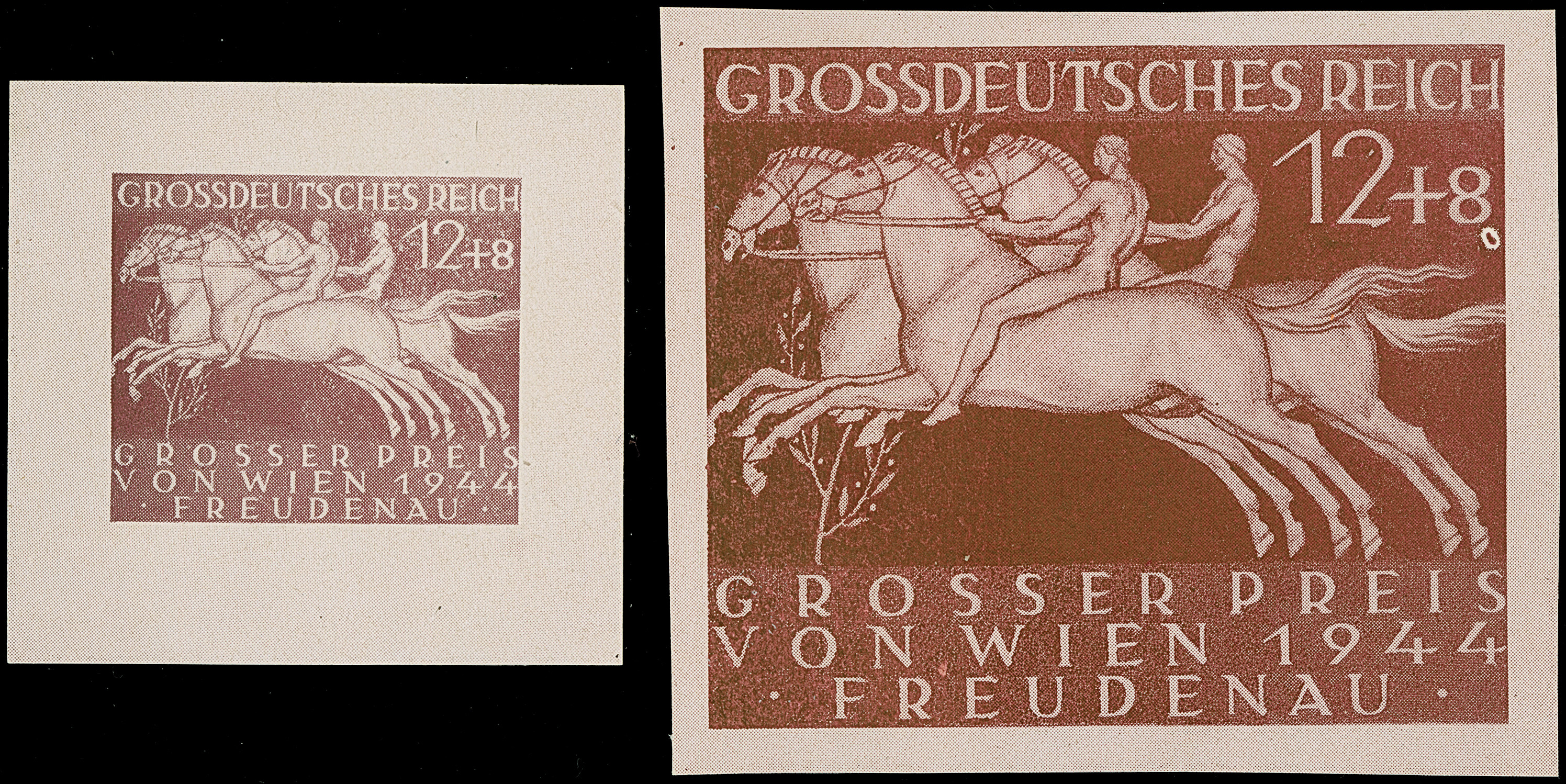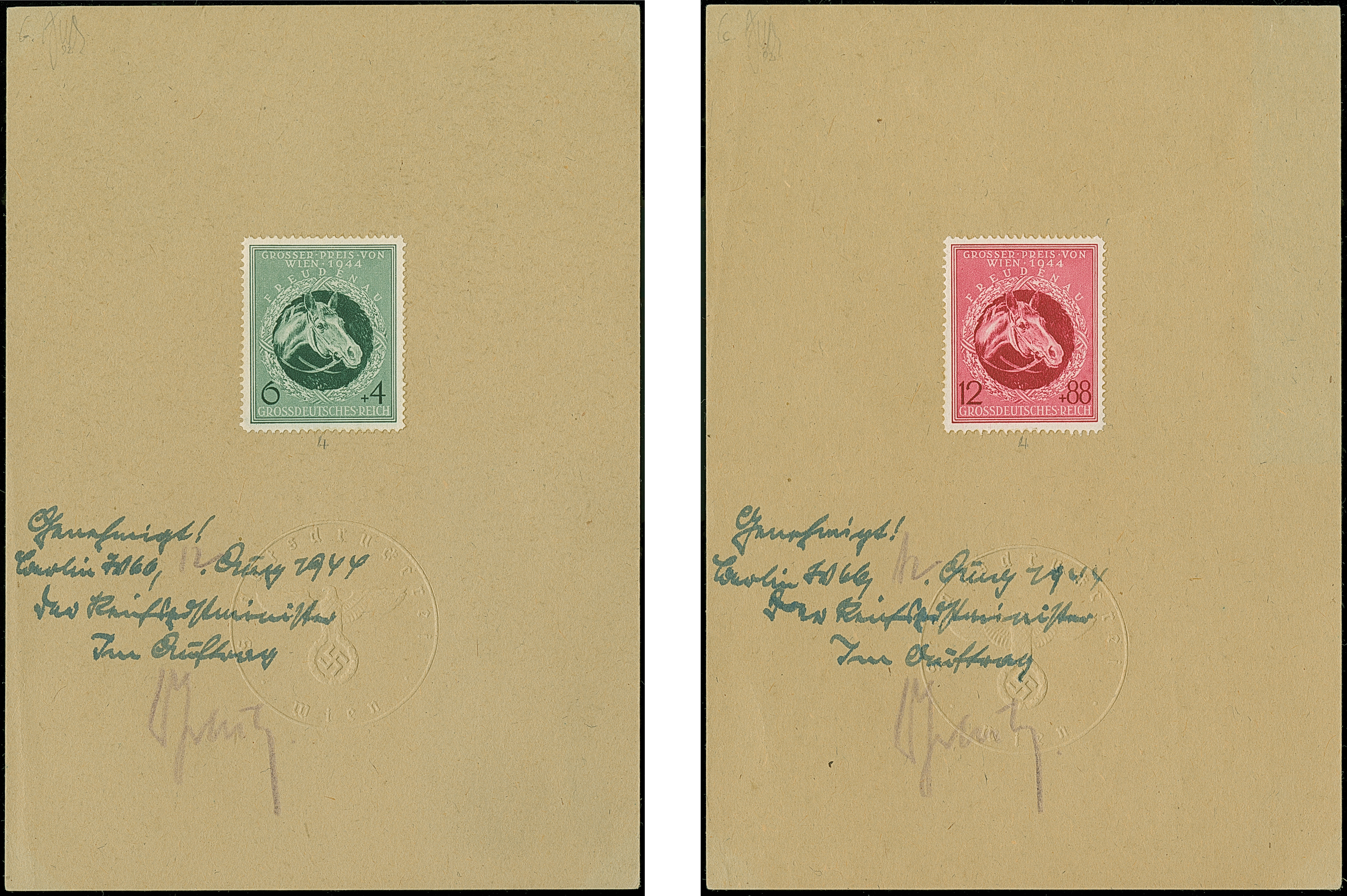 1944, Großer Preis von Wien 6 Pfg. und 12 Pfg. als gezähnte Probedrucke in Schwarzbläulichgrün bzw. in Dunkelrotkarmin auf zwei Vorlagekartons mit Prägesiegel der Staatsdruckerei Wien sowie handschriftlicher Genehmigung der Farbproben “4” für den Druck mit Datierung "Berlin W66 12.August 1944. In dieser Art sind beide Vorlagekartons Unikate, Fotobefund Jakubek (1992)
