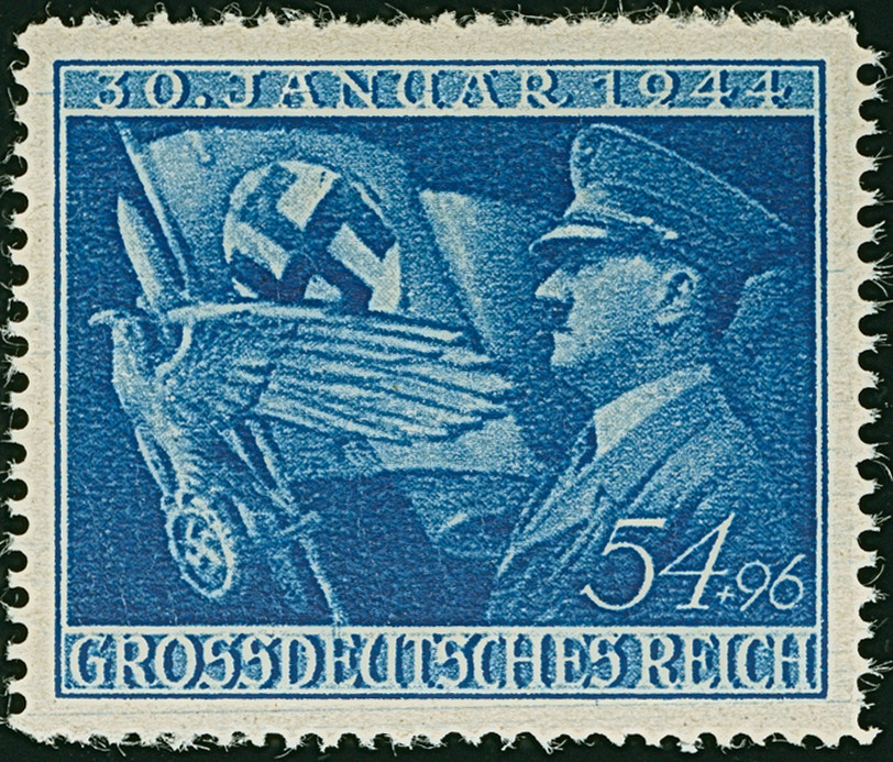 1944, 11. Jahrestag der Machtergreifung durch Adolf Hitler 54+96 Pfg. als gezähnter Probedruck in Blau, postfrisch mit zum Teil rauer Zähnung, in einwandfreier Erhaltung. In dieser Form selten, unsigniert mit Fotoattest D. Schlegel BPP (2023)