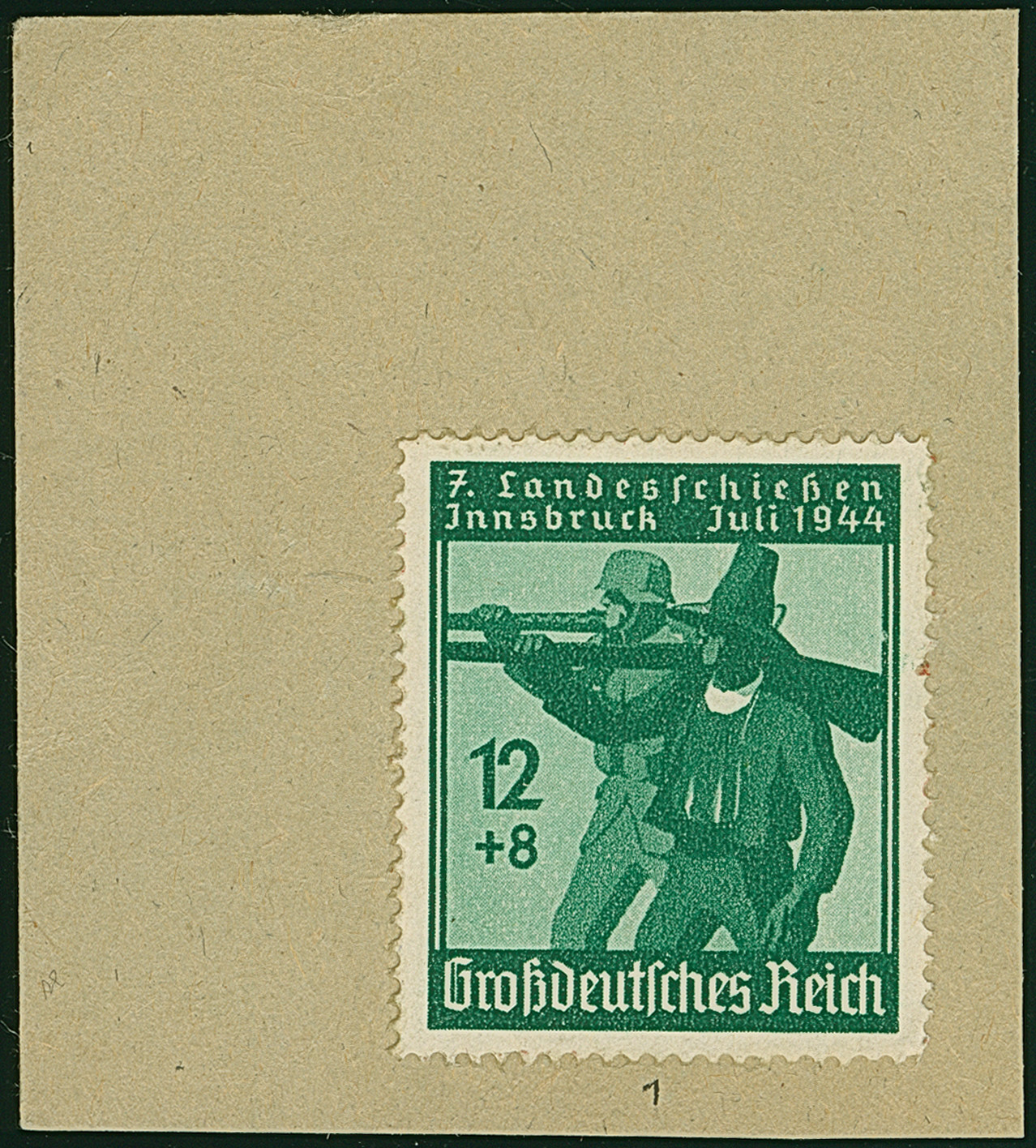1944, Tiroler Landesschießen 12 Pfg. als gezähnter Probedruck in Smaragdgrün und im Text abweichenden Schriftbändern auf Vorlagekartonteil mit Nummer “1”. Die Marke rechts in der Zähnung mit zwei Farbpunkten, ansonsten in guter Erhaltung. In dieser Art hat ProFi nur ein weiteres Exemplar registriert, signiert Ludin BPP mit Fotoattest (1981)
