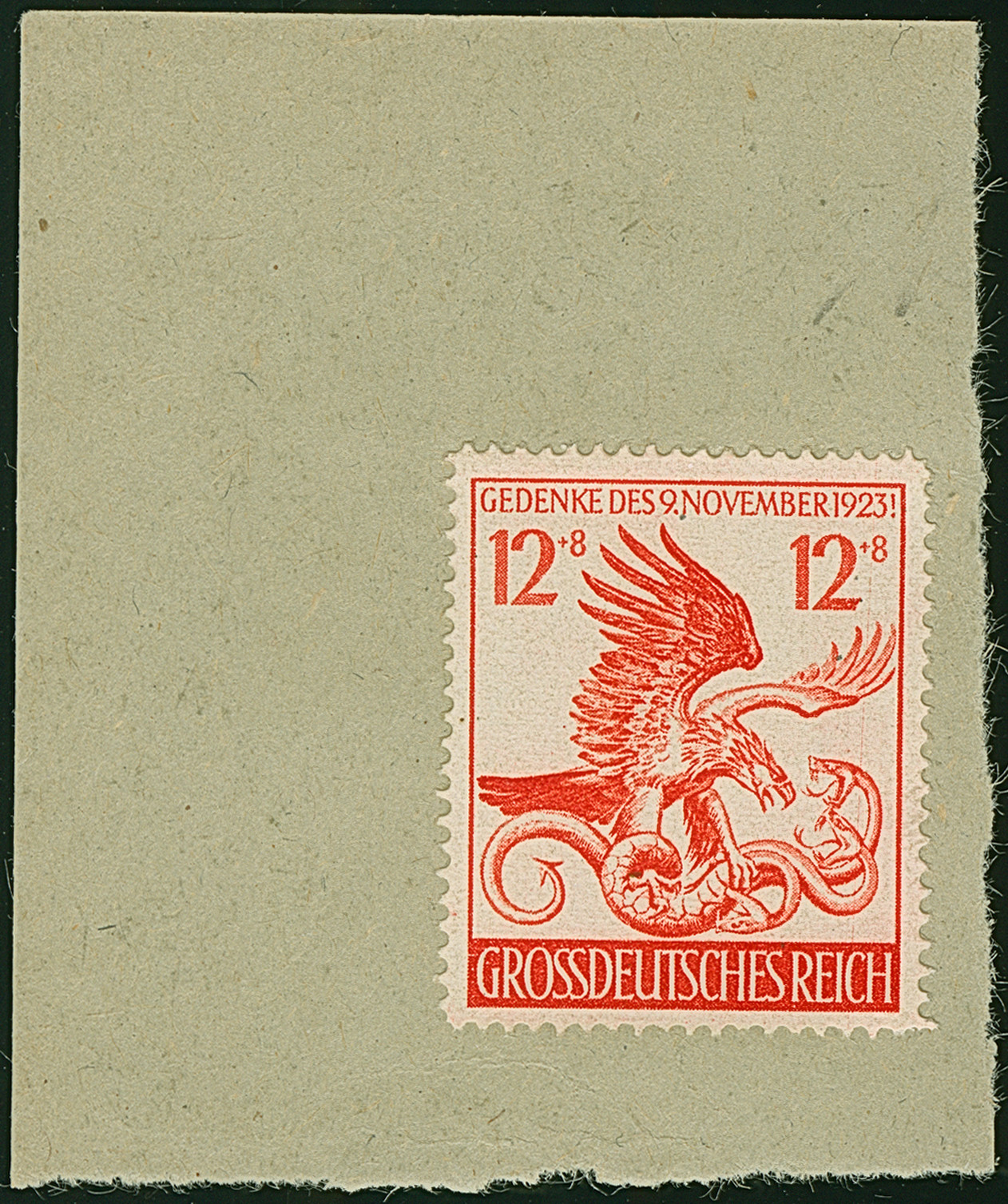 1944, 21. Jahrestag des Marsches zur Feldherrnhalle München 12 Pfg. als gezähnter Probedruck in Zinnober auf Vorlagekartonteil in einwandfreier Erhaltung. In dieser Art sehr selten, ProFi hat nur einen weiteren kompletten Vorlagekarton mit vier Marken registriert, signiert Ludin BPP mit Attest (1981)
