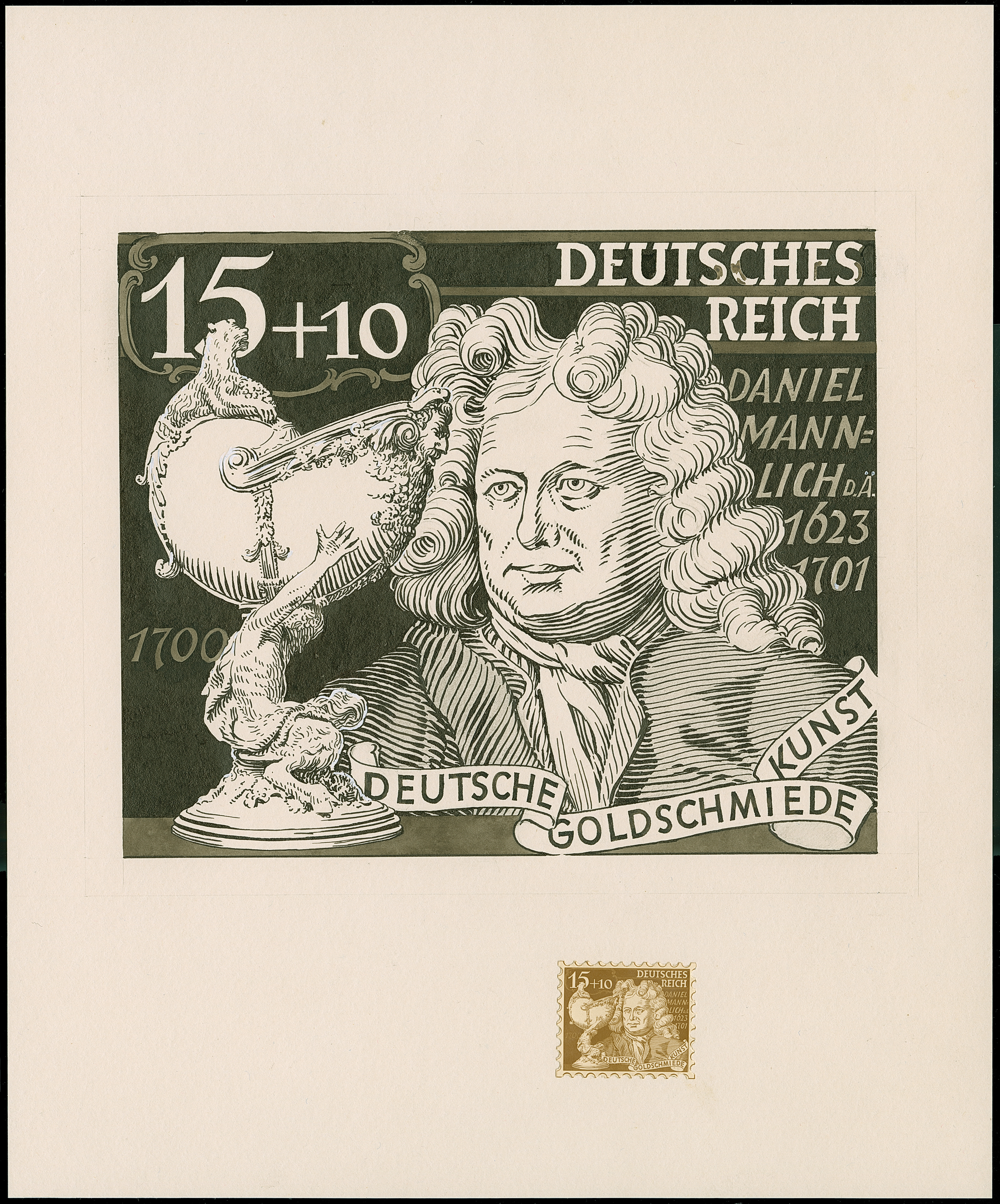 1944, Goldschmiedekunst 15 Pfg. als grob gezähntes Foto-Essay in Braun auf Vorlageblatt mit Original-Entwurf von Professor Klein (Tuschezeichnung) im Großformat. Dieser nicht angenommene Entwurf ist in dieser Art ein Unikat