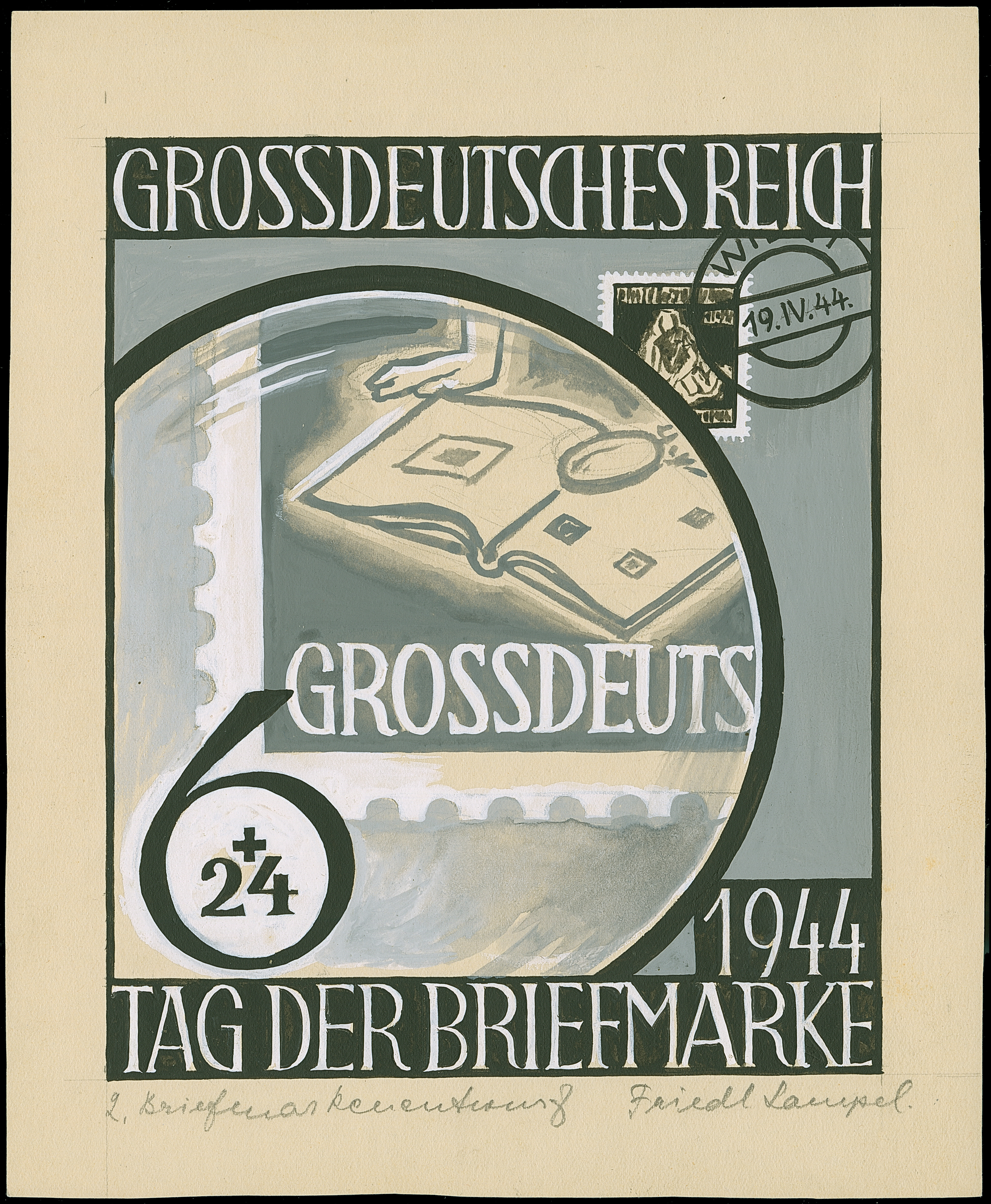 1944, Tag der Briefmarke 6 Pfg.,Entwurf als Tuschezeichnung im Großformat mit Signatur Friedl. Lampel auf Karton in einwandfreier Erhaltung. Dieser Entwurf wurde nicht angenommen. selten