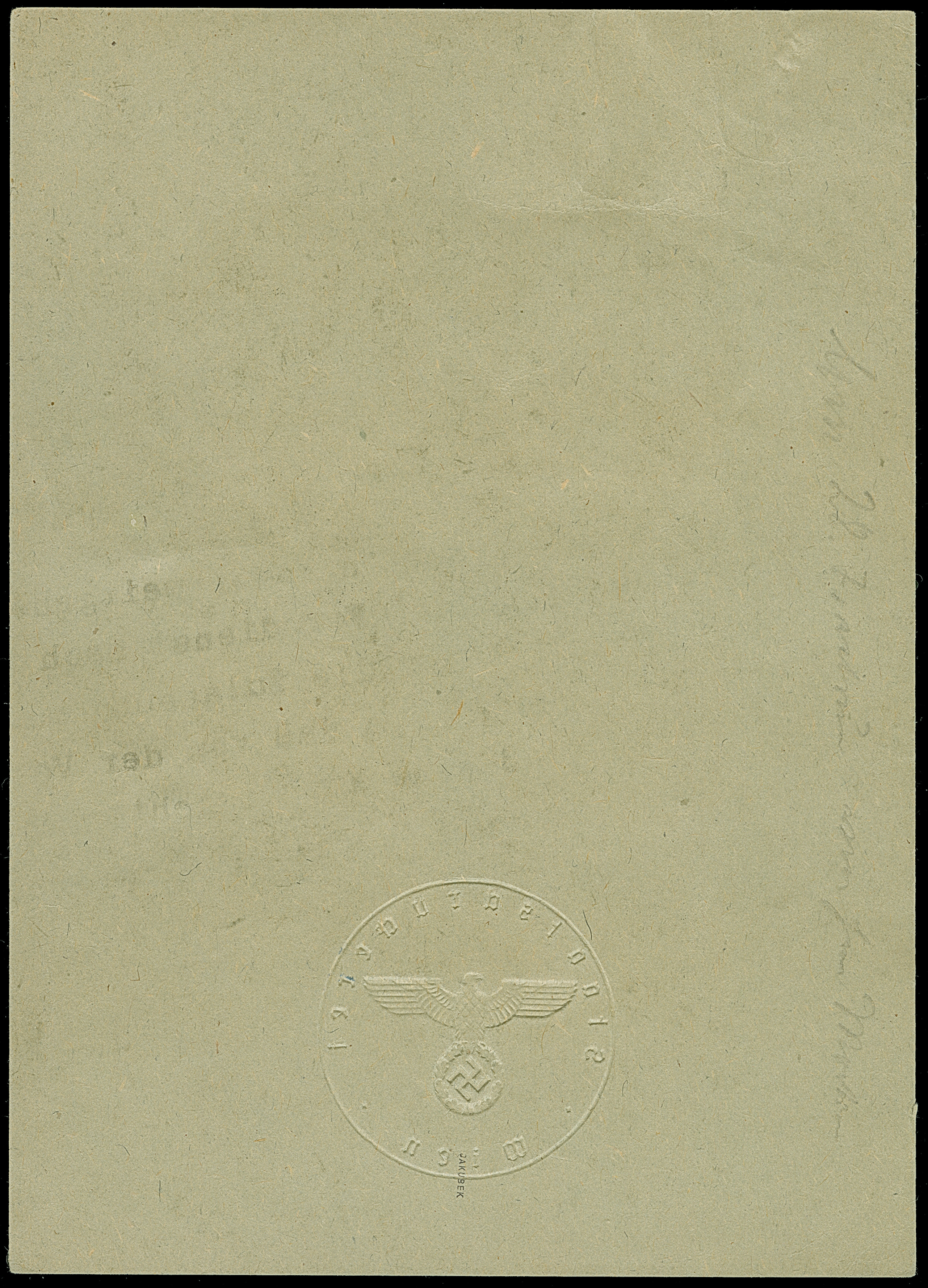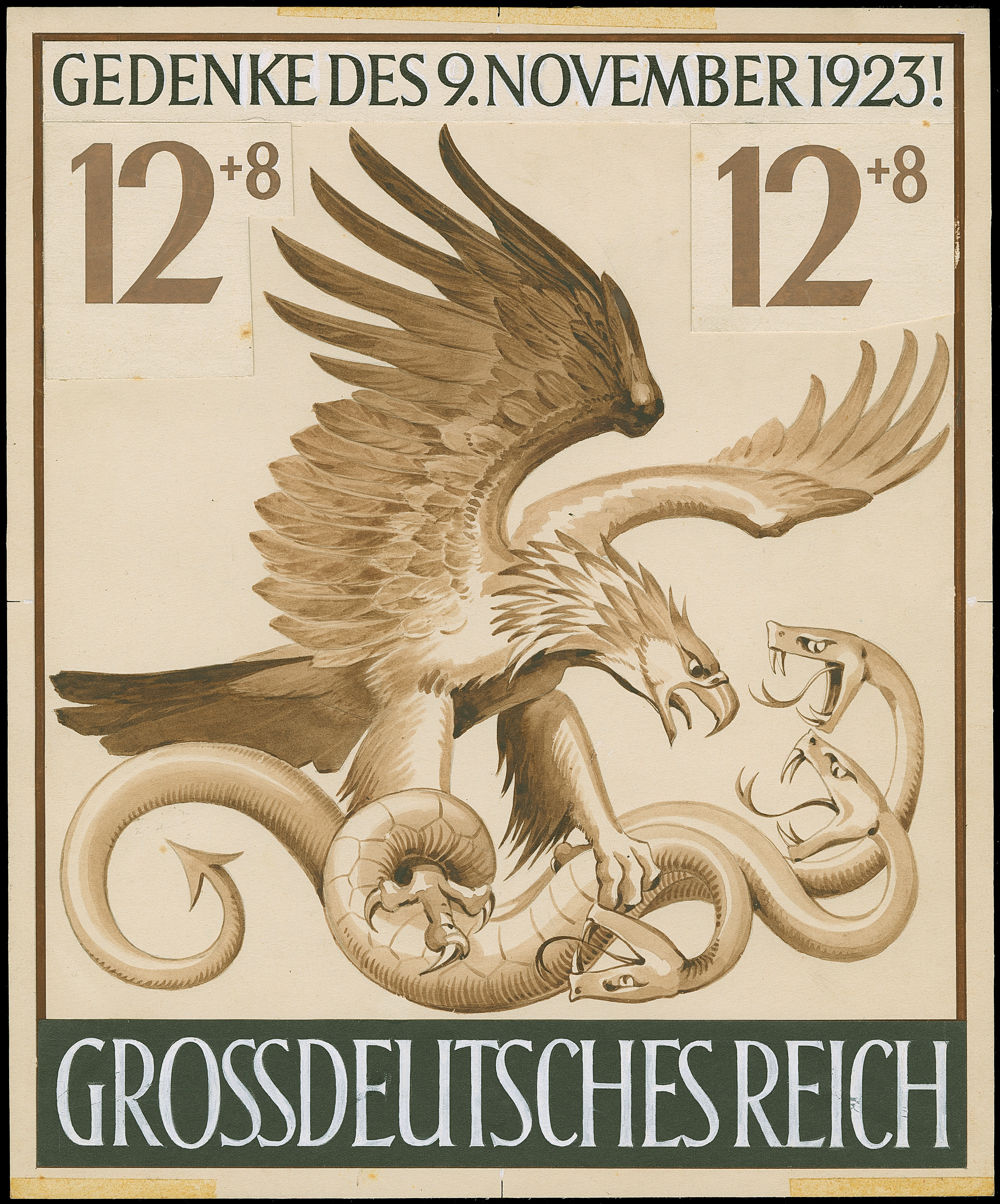 1944, 21. Jahrestag des Marsches zur Feldherrenhalle 12 Pfg. als Entwurf-Zeichnung in Beigebraun im Großformat auf Karton. Dieser Entwurf wurde später angenommen. Die gut erhaltene Zeichnung ist ohne Signatur, stammt vermutlich aber vom Entwerfer Diebitsch, in dieser Art ein Unikat
