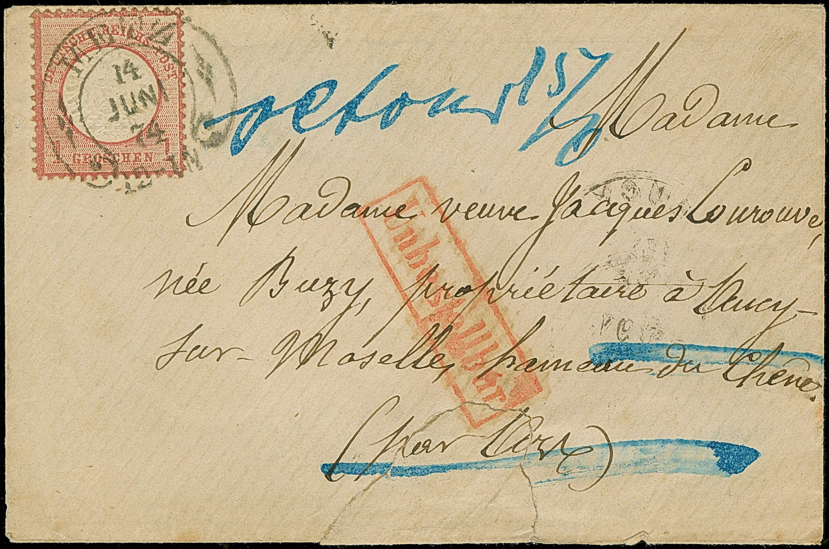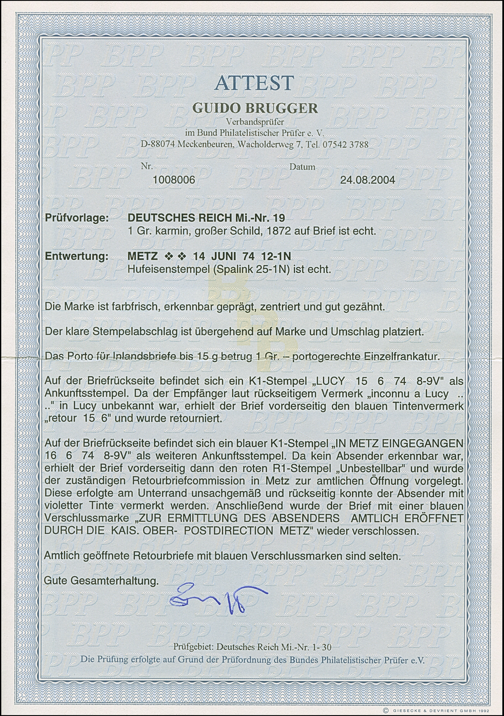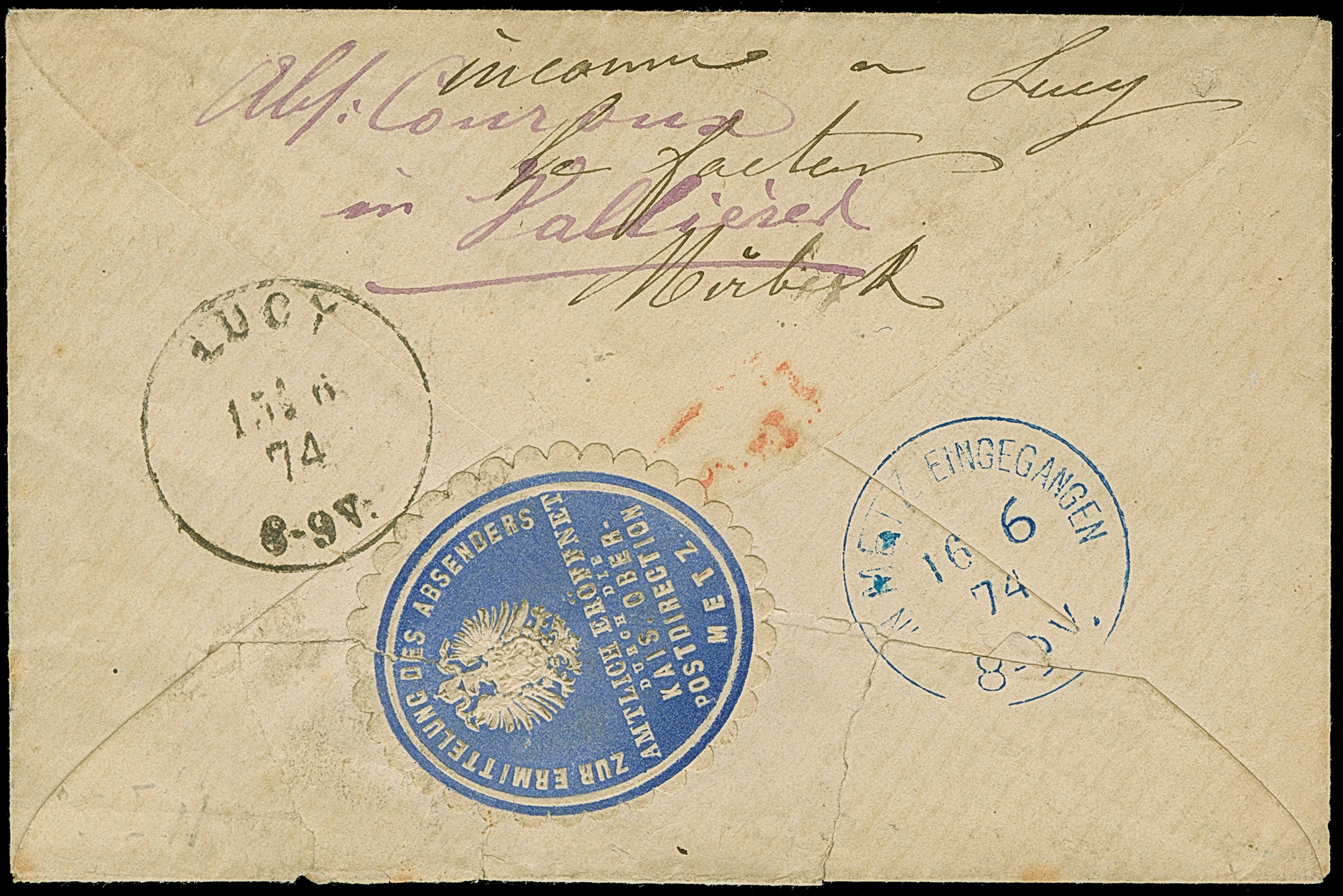 “METZ 14.JUNI.74” (Spalink 25-1N) klar auf großer Schild 1 Gr. karmin auf Briefkuvert nach Lucy mit Ankunftsstempel. Da der Empfänger unbekannt war, ging der Brief mit entsprechenden Vermerken “inconnu a Lucy…” und “retour 15/6” retour mit rotem Ra1 “Unbestellbar” und rückseitigem blauem EKr. “IN METZ EINGEGANGENE 16.6.74”. Da ohne Absender wurde der Brief amtlich geöffnet und rückseitig mit blauer Verschlussmarke der OPD METZ" verschlossen (Öffnungsfehler vorderseitig sichtbar). Trotz kleiner Einschränkungen ein interessanter Retour-Brief und in Verbindung mit dem besseren Hufeistempel sehr selten, Fotoattest Brugger BPP (2004)