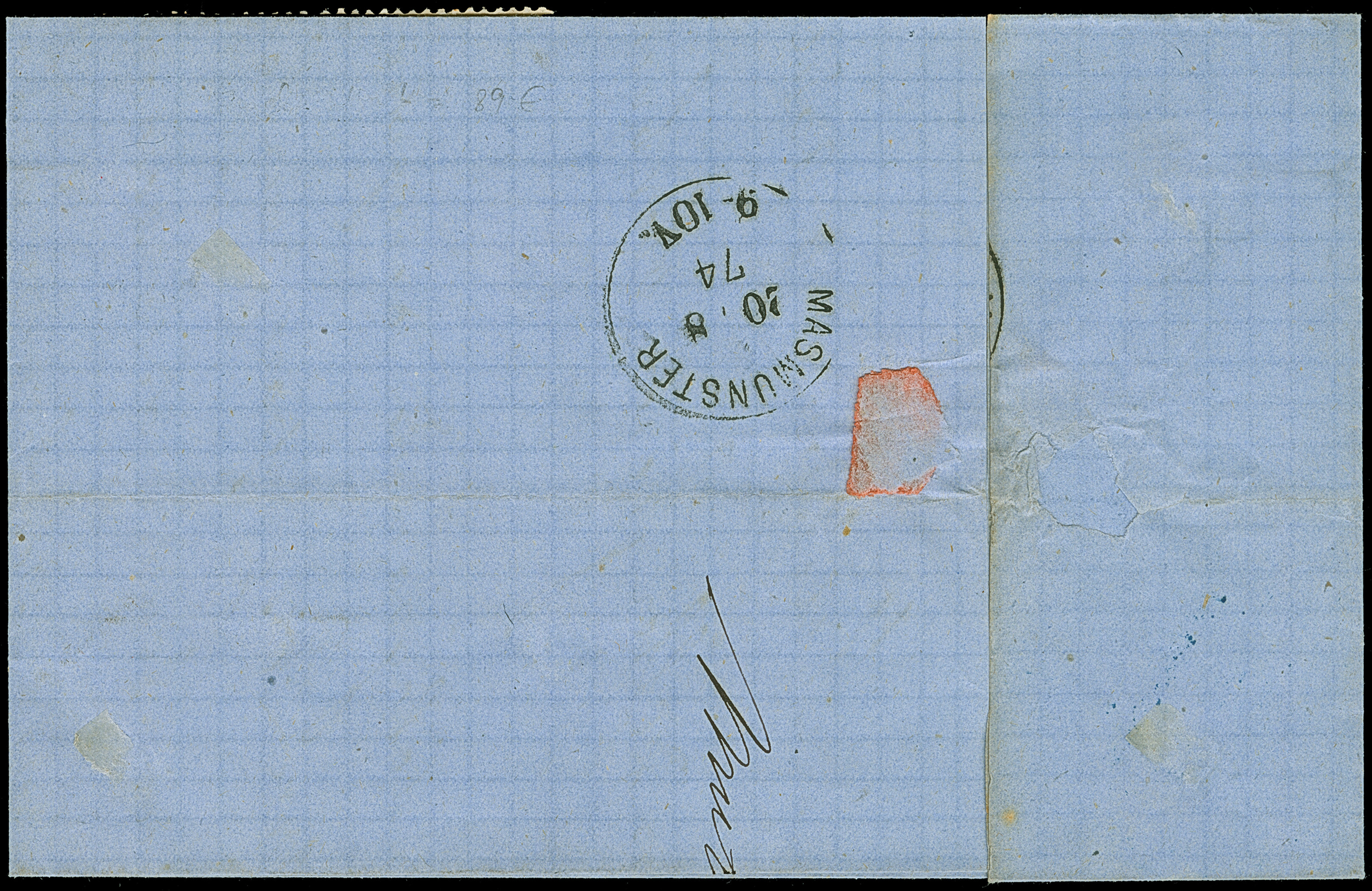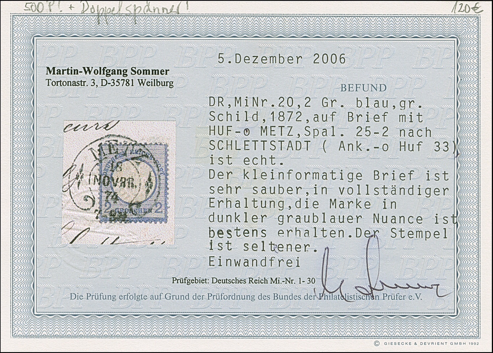 “METZ 18.NOVBR.74” (Spalink 25-2) klar auf großer Schild 2 Gr. grauultramarin auf komplettem Faltbrief nach Schlettstatt mit rückseitigem Hufeisenstempel “SCHLETTSTADT19.NOVBR.74” (Spalink 33) als Ankunftsstempel. Die farbfrische Marke ist gut geprägt, gut gezähnt und wie der Faltbrief in einwandfreier Erhaltung. Ein interessanter Brief mit besserem Hufeisenstempel und sogenanntem “Doppelspänner”, signiert Sommer BPP mit Fotobefund (2006)
