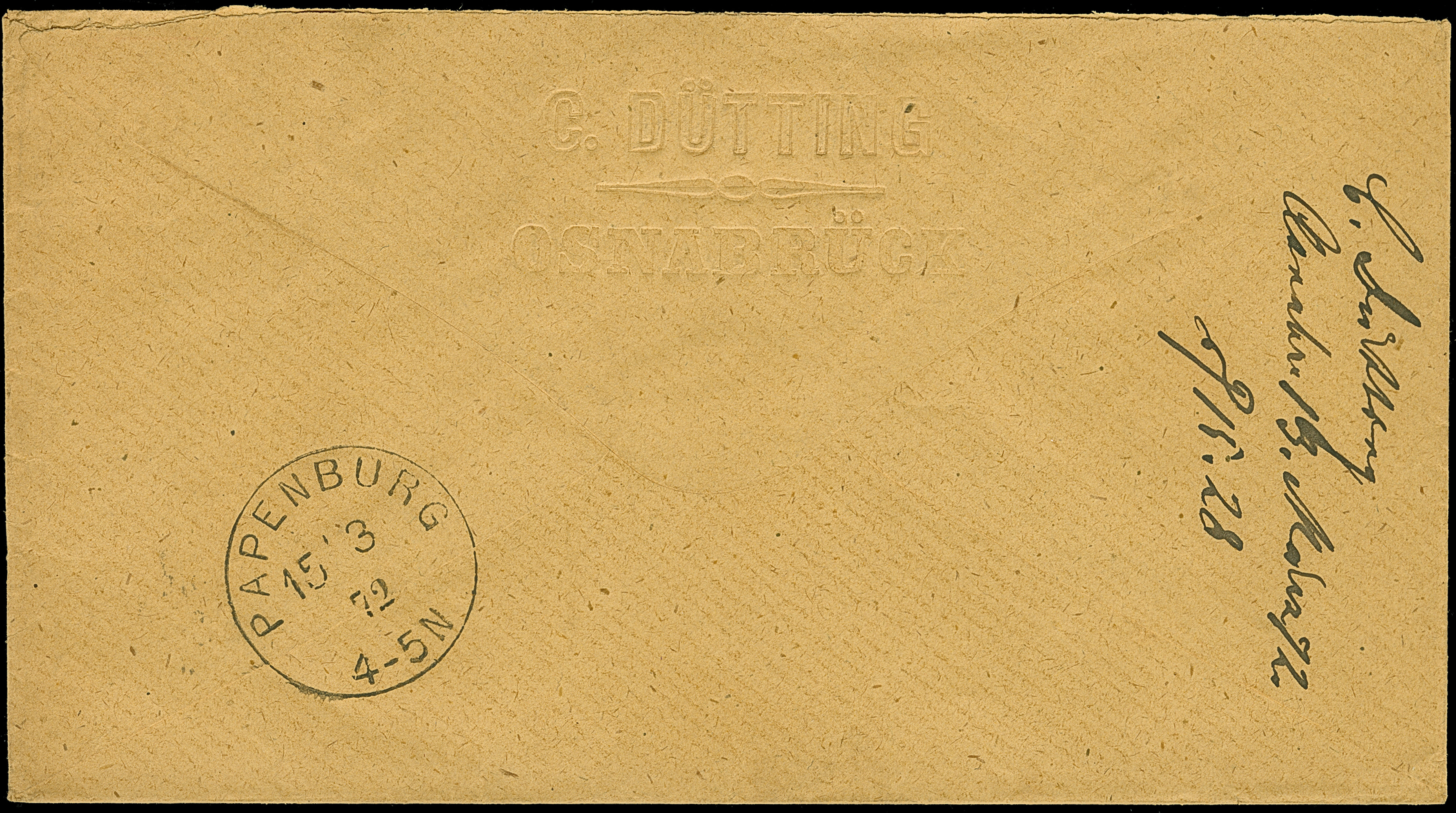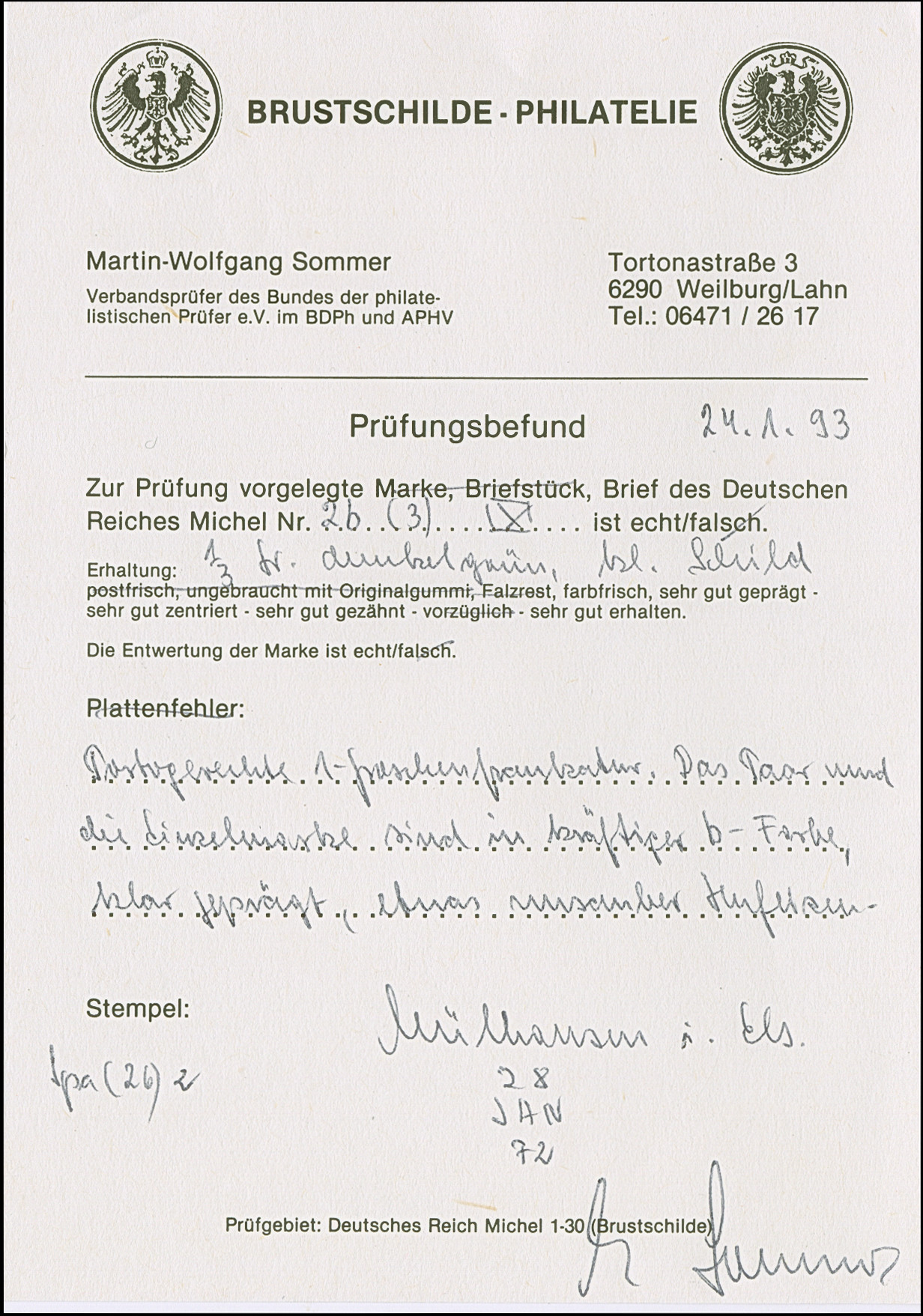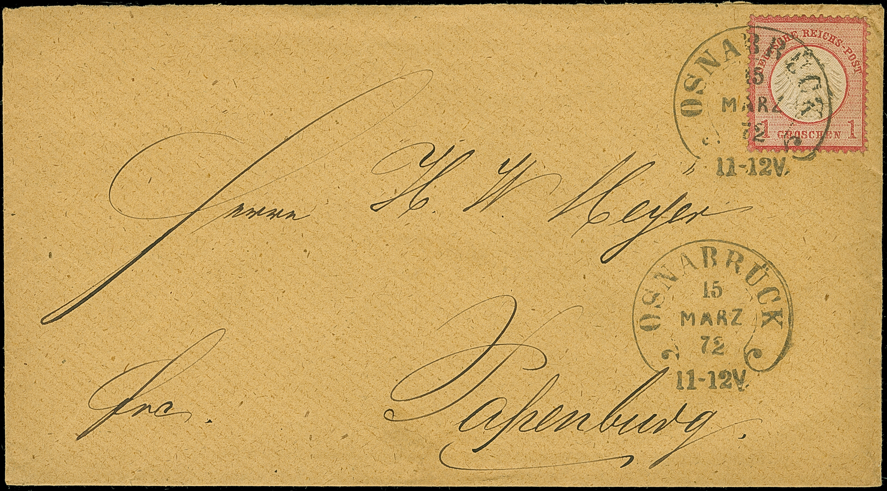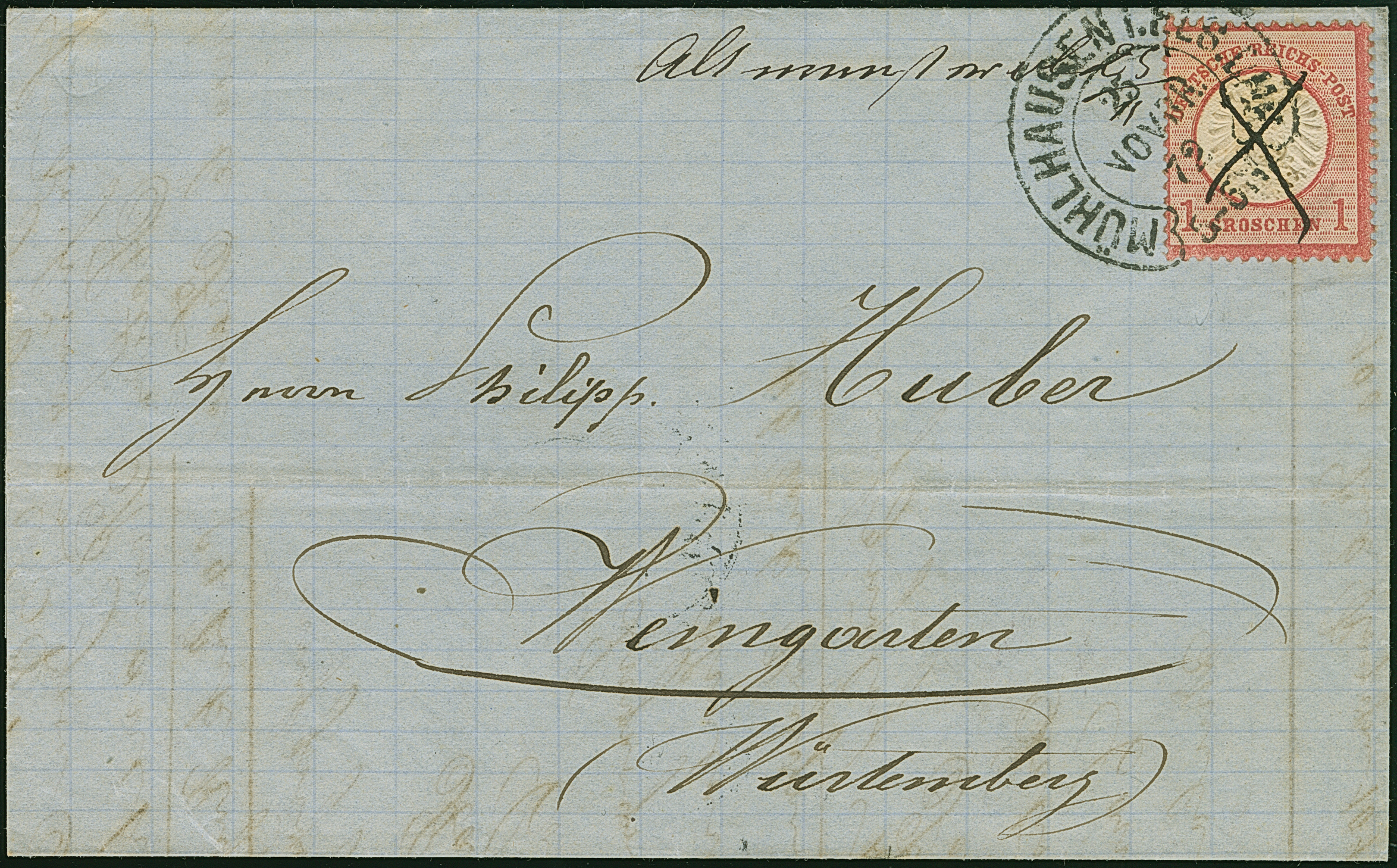 “MÜHLHAUSEN i. ELS. BHF. 25.NOVBR.72” (Spalink 26-5) klar als nachträgliche Entwertung auf großer Schild 1 Gr. karmin mit handschriftlicher Federstrich-Entwertung auf komplettem Faltbrief mit handschriftlichem Aufgabevermerk “Altmünsterol 25/11” nach Weingarten mit Ankunftsstempel. Die farbfrische Marke ist sehr gut geprägt, gut gezähnt und in einwandfreier Erhaltung. Eine ungewöhnliche und seltene Kombination, Fotoattest Hennies BPP (1984)