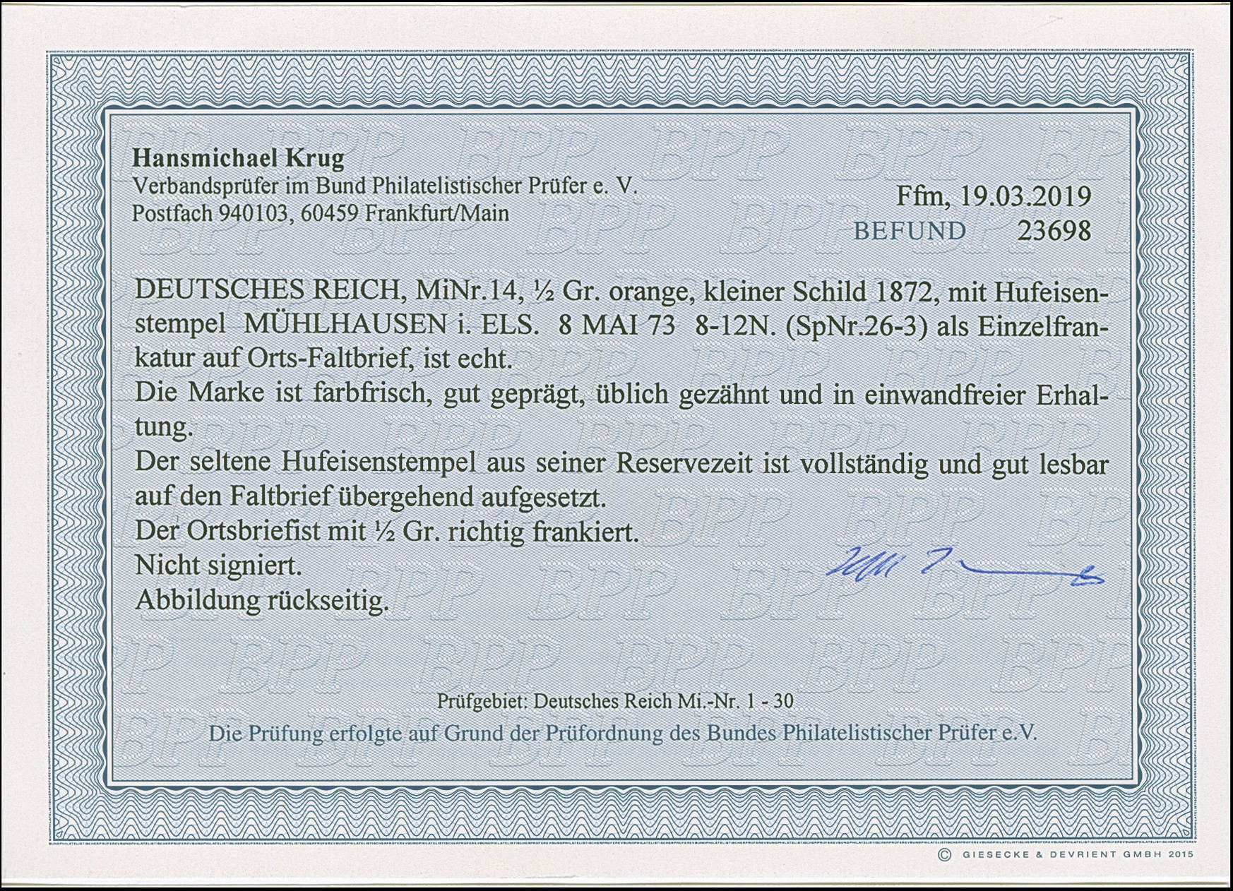 “MÜHLHAUSEN i. ELS. 8.MAI.73” (Spalink 26-3) klar auf kleiner Schild ½ Gr. orange als tarifgerechte Einzelfrankatur auf komplettem Faltbrief im Ortsbriefverkehr. Die farbfrische Marke ist gut geprägt, üblich gezähnt und wie der Faltbrief in einwandfreier Erhaltung. Ein nicht häufiger Ortsbrief mit besserem Hufeisenstempel aus der Reservezeit, Fotobefund Krug BPP (2019)