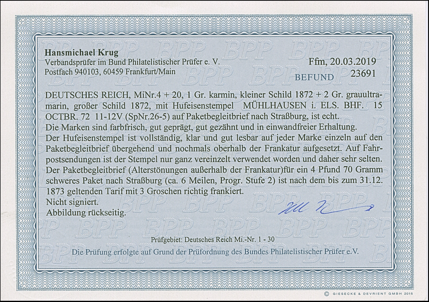 “MÜHLHAUSEN i. ELS. BHF. 15.OCTBR.72” (Spalink 26-5) zweimal klar auf kleiner Schild 1 Gr. karmin und großer Schild 2 Gr. grauultramarin als tarifgerechte Frankatur auf Paketbegleit-Faltbrief für ein 4 Pfund 70 g schweres Paket nach Straßburg mit Ankunftsstempel. Die farbfrischen Marken sind gut geprägt, gut gezähnt und in einwandfreier Erhaltung. Der Faltbrief mit stärkeren Alterstönungen außerhalb der Frankatur. Auf Fahrpostsendungen ist diese Stempeltype nur ganz vereinzelt verwendet worden, entsprechende Belege sind daher selten, Fotobefund Krug BPP (2019)