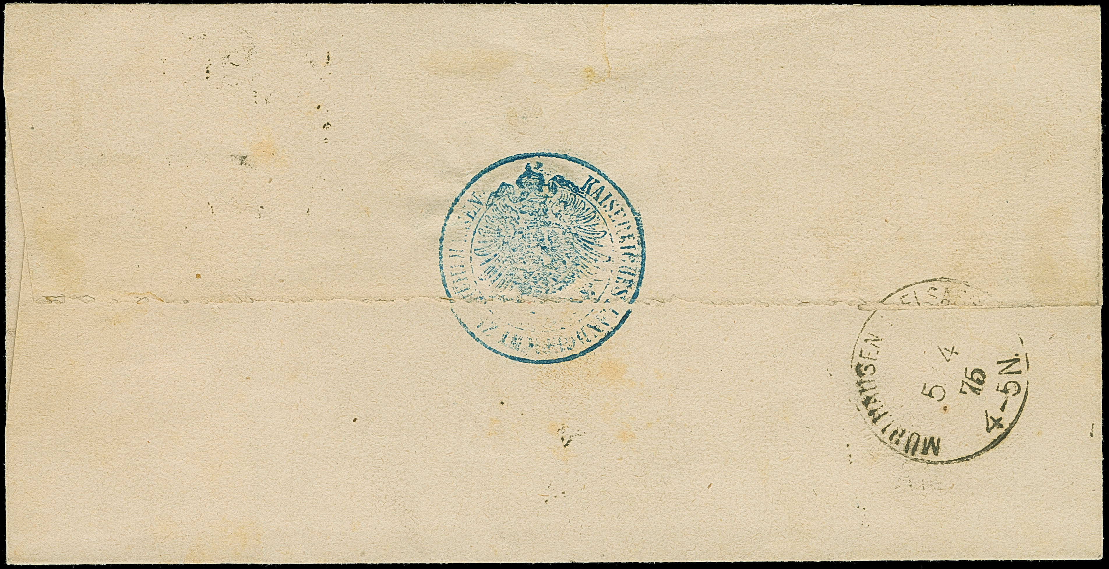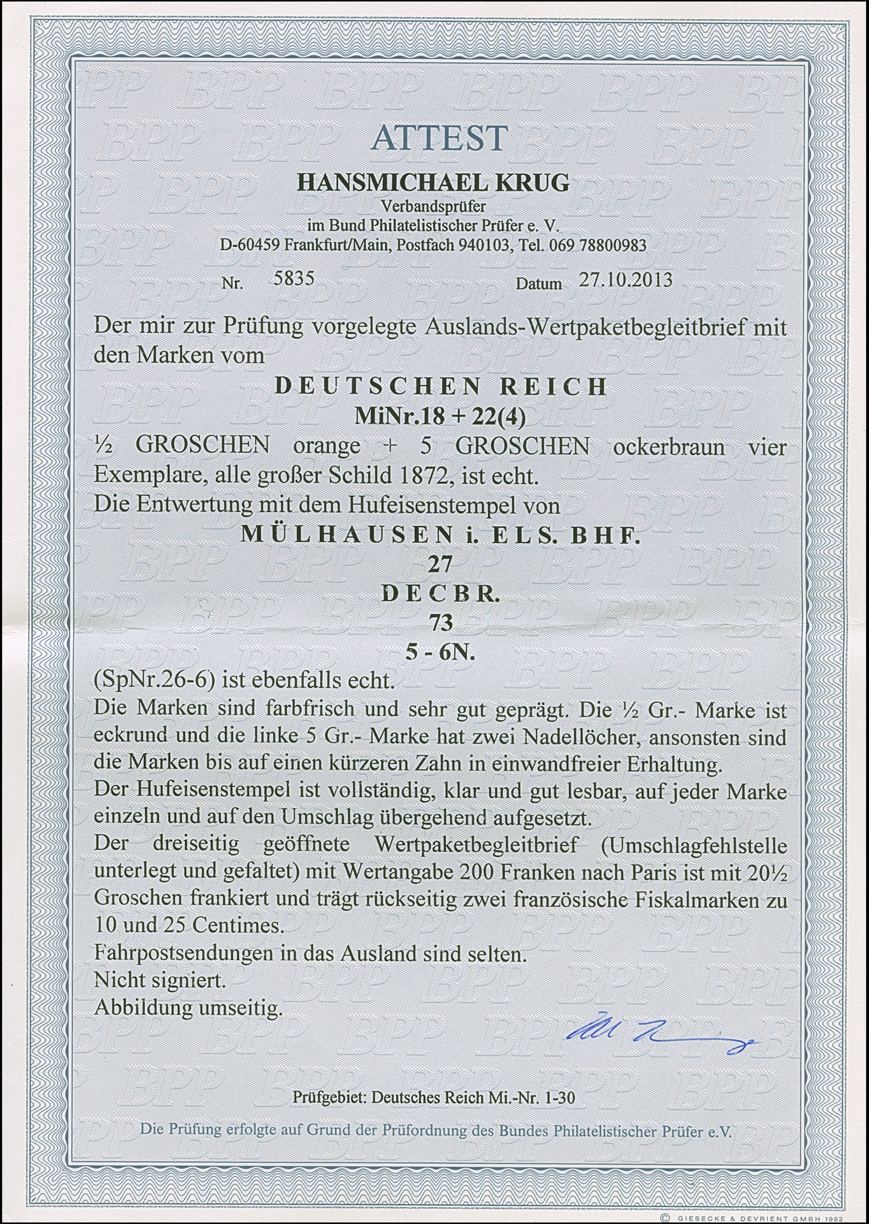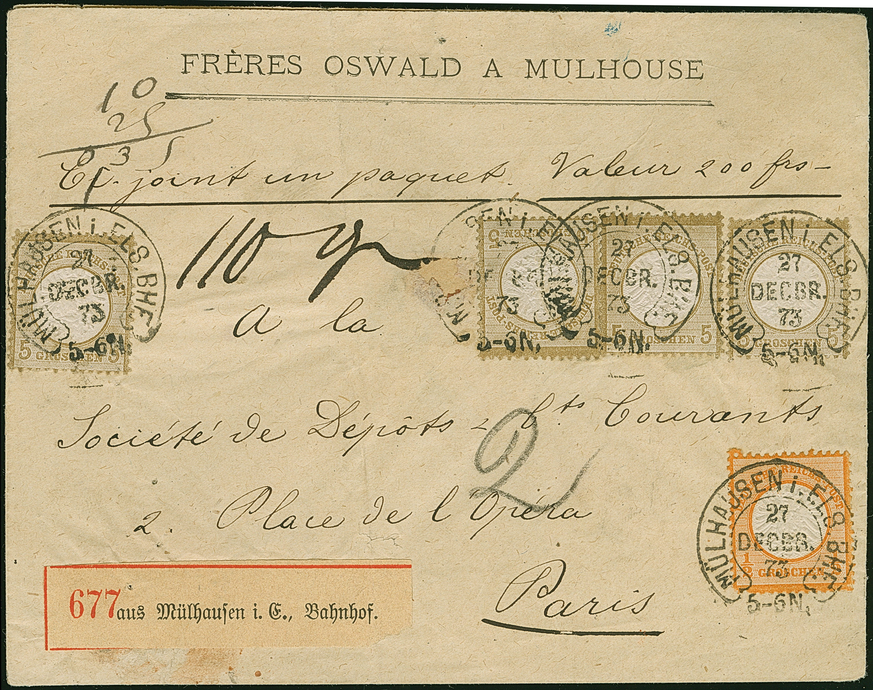 “MÜLHAUSEN i. ELS. BHF. 27.DECBR.73” (Spalink 26-6) mehrfach klar auf vier Einzelmarken großer Schild 5 Gr. ockerbraun und Einzelwert ½ Gr. orange auf dreiseitig geöffnetem Wert-Paketbegleit-Briefkuvert mit Wertangabe 200 Franken nach Paris mit rückseitig zwei französischen Fiskalmarken 10 und 25 Centimes. Die farbfrischen Marken sind sehr gut geprägt, die ½ Gr.-Marke ist eckrund und die linke 5 Gr.-Marke hat zwei Nadellöcher, ansonsten sind die Marken in einwandfreier Erhaltung. Der Umschlag mit senkrechter Faltung und kleiner hinterlegter Fehlstelle in der Mitte. Trotz der kleinen Einschränkungen eine dekorative und seltene Verwendung, bisher sind nur ganz wenige frankierte Fahrpostsendungen nach Frankreich bekannt, Fotoattest Krug BPP (2013)