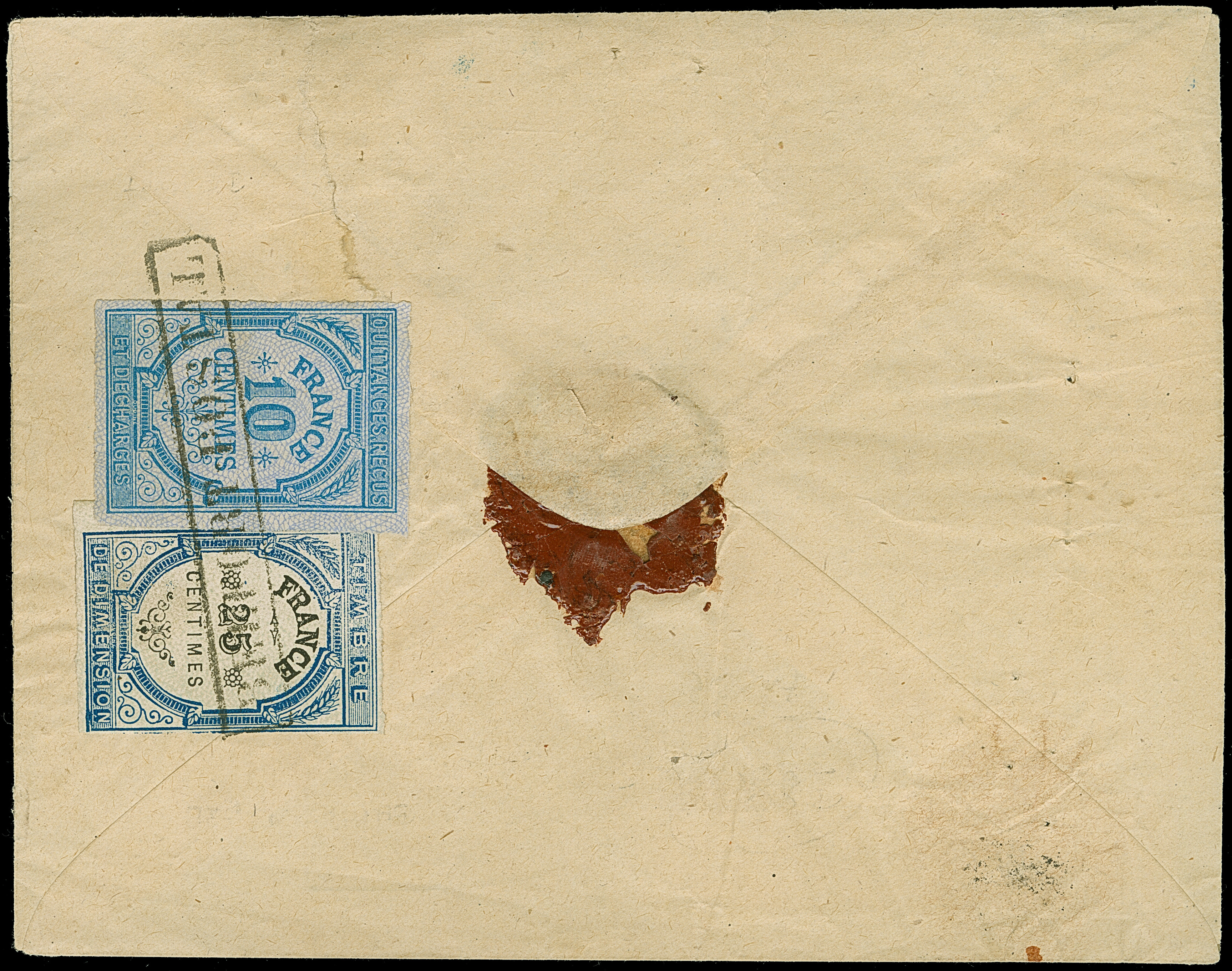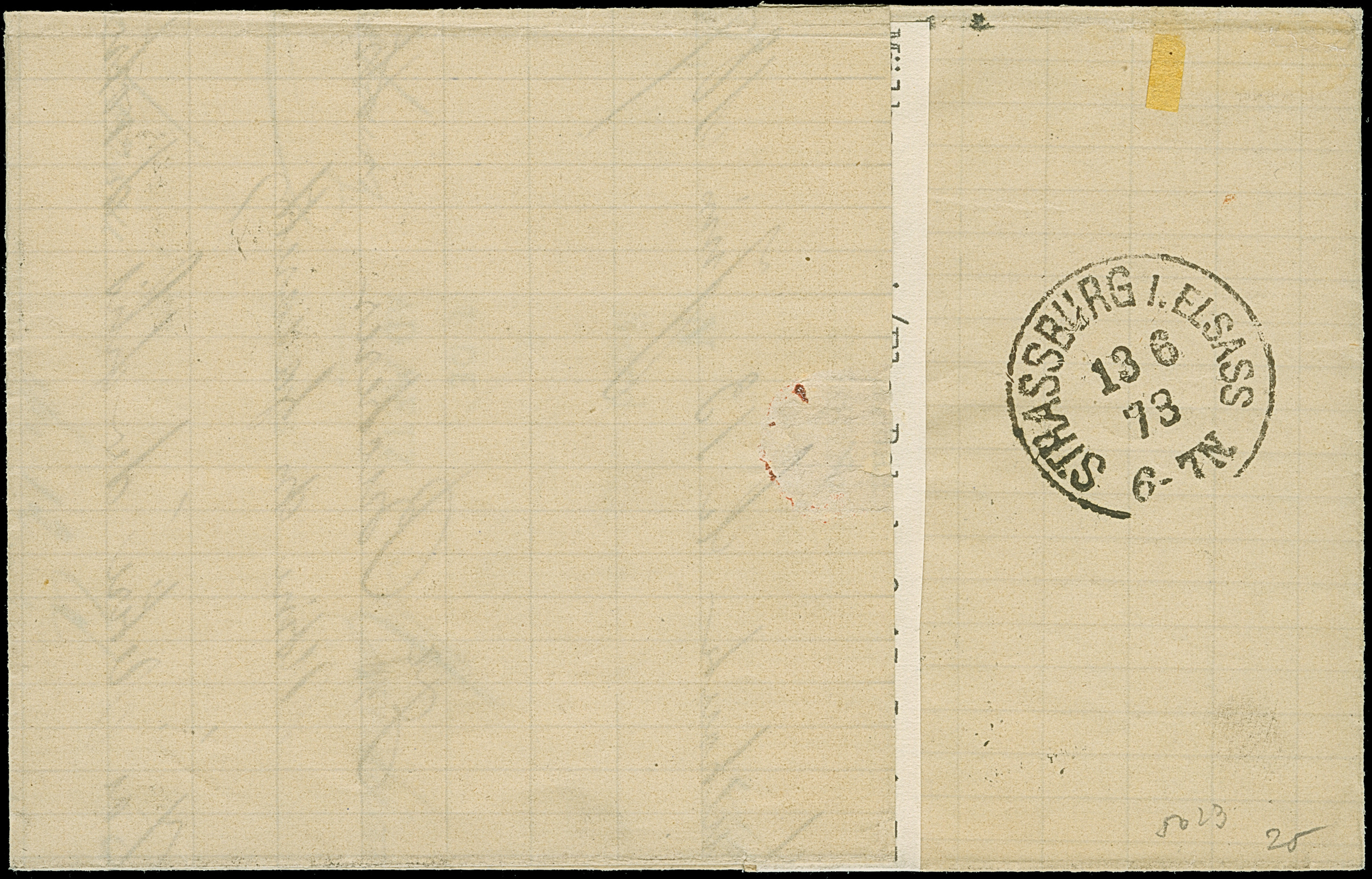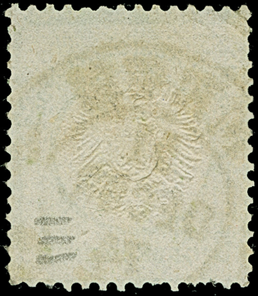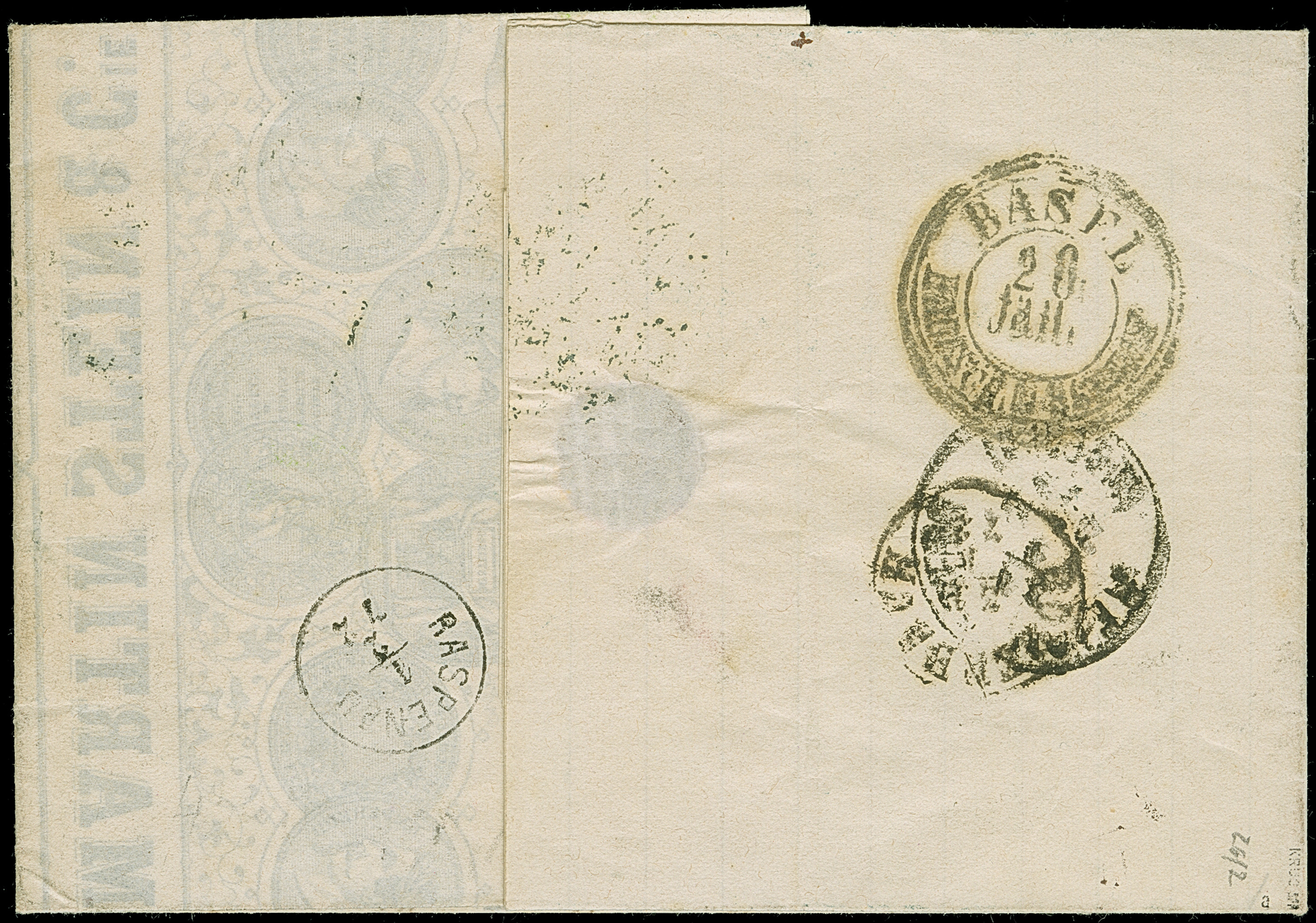 “MÜLHAUSEN i. ELS. BHF. 27.DECBR.73” (Spalink 26-6) mehrfach klar auf vier Einzelmarken großer Schild 5 Gr. ockerbraun und Einzelwert ½ Gr. orange auf dreiseitig geöffnetem Wert-Paketbegleit-Briefkuvert mit Wertangabe 200 Franken nach Paris mit rückseitig zwei französischen Fiskalmarken 10 und 25 Centimes. Die farbfrischen Marken sind sehr gut geprägt, die ½ Gr.-Marke ist eckrund und die linke 5 Gr.-Marke hat zwei Nadellöcher, ansonsten sind die Marken in einwandfreier Erhaltung. Der Umschlag mit senkrechter Faltung und kleiner hinterlegter Fehlstelle in der Mitte. Trotz der kleinen Einschränkungen eine dekorative und seltene Verwendung, bisher sind nur ganz wenige frankierte Fahrpostsendungen nach Frankreich bekannt, Fotoattest Krug BPP (2013)