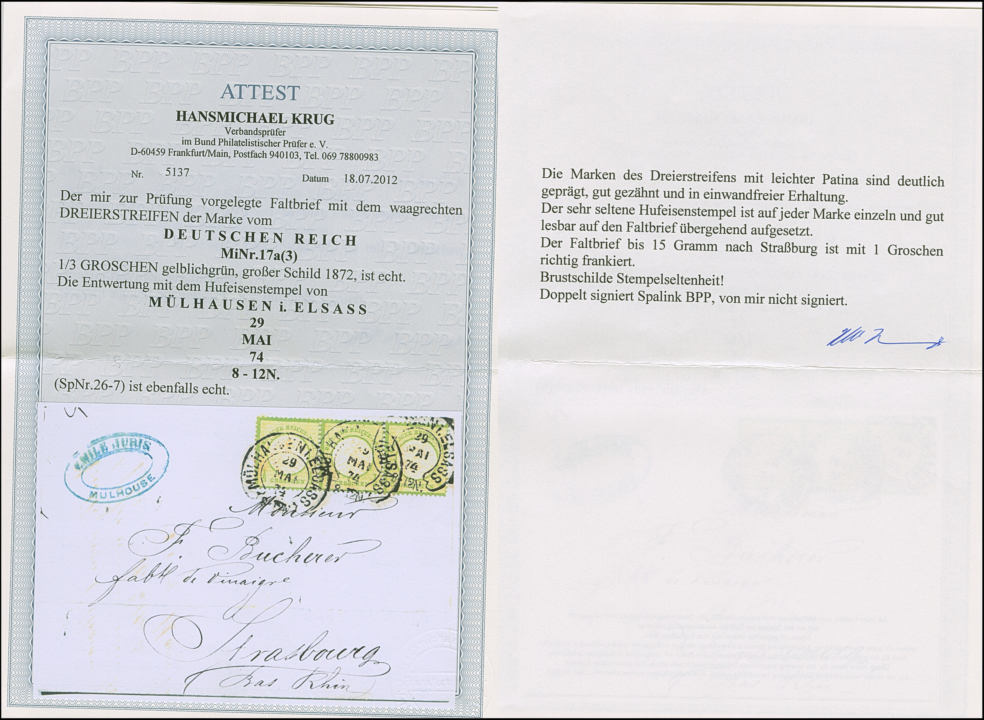 “MÜLHAUSEN i. ELSASS 29.MAI.74” (Spalink 26-7) mehrfach klar auf waagerechtem Dreierstreifen großer Schild ⅓ Gr. gelblichgrün als tarifgerechte Mehrfachfrankatur auf komplettem Faltbrief nach Straßburg mit Ankunftsstempel. Die farbfrischen Marken mit leichter Patina sind deutlich geprägt, gut gezähnt und wie der Faltbrief in einwandfreier Erhaltung. Ein außergewöhnlicher Brief mit dem sehr seltenen Reservestempel, in Kombination mit der Frankatur vielleicht einmaliger Brief und ganz große Brustschild-Stempelseltenheit, Fotoattest Krug BPP (2012)