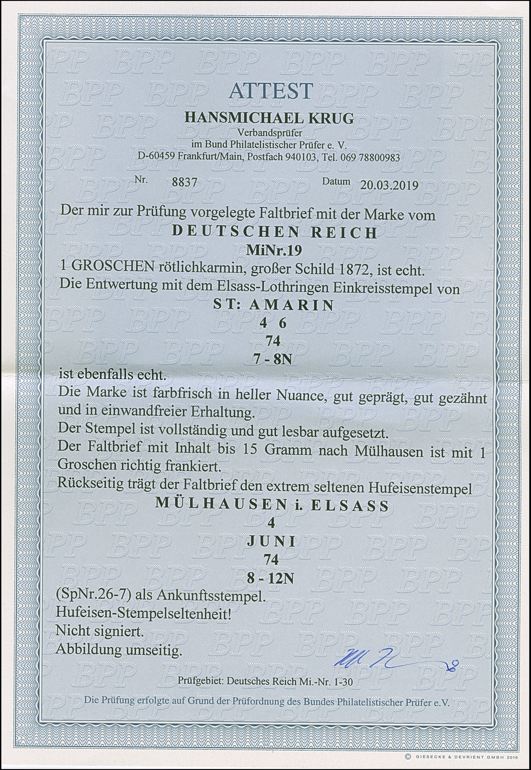 “MÜLHAUSEN i. ELSASS 4.JUNI.74” (Spalink 26-7) sehr klar rückseitig als Ankunfsstempel auf Faltbrief mit großer Schild 1 Gr. rötlichkarmin mit EKr. “ST. AMRIN 4.6.74” nach Mühlhausen. Die farbfrische Marke in heller Nuance ist gut geprägt, gut gezähnt und in einwandfreier Erhaltung, der Faltbrief hat Faltspuren. Eine außergewöhnliche Verwendung des sehr seltenen Reserverstempels als Ankunftsstempel, in dieser Art bisher nicht bekannt, Fotoattest Krug BPP (2019)