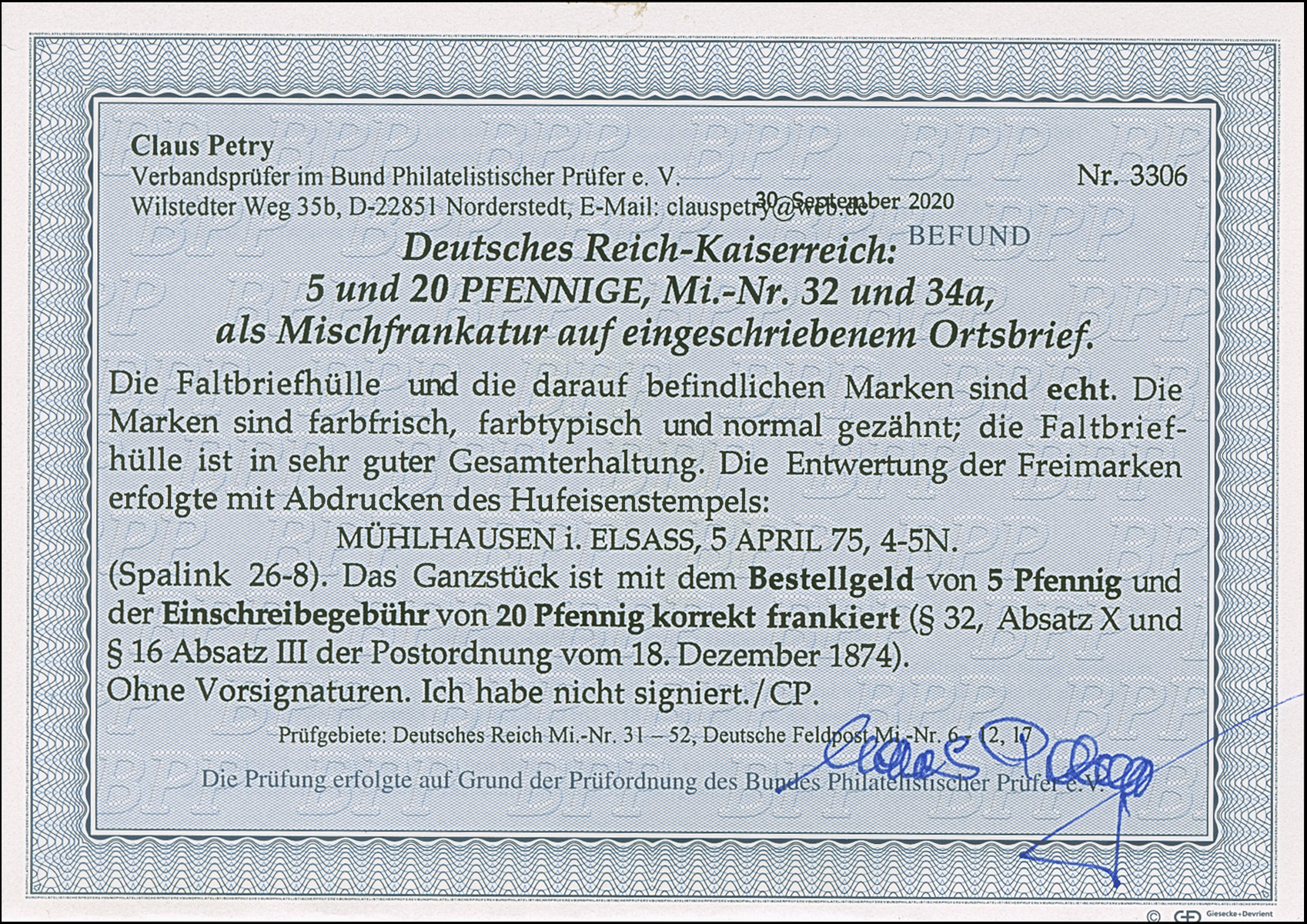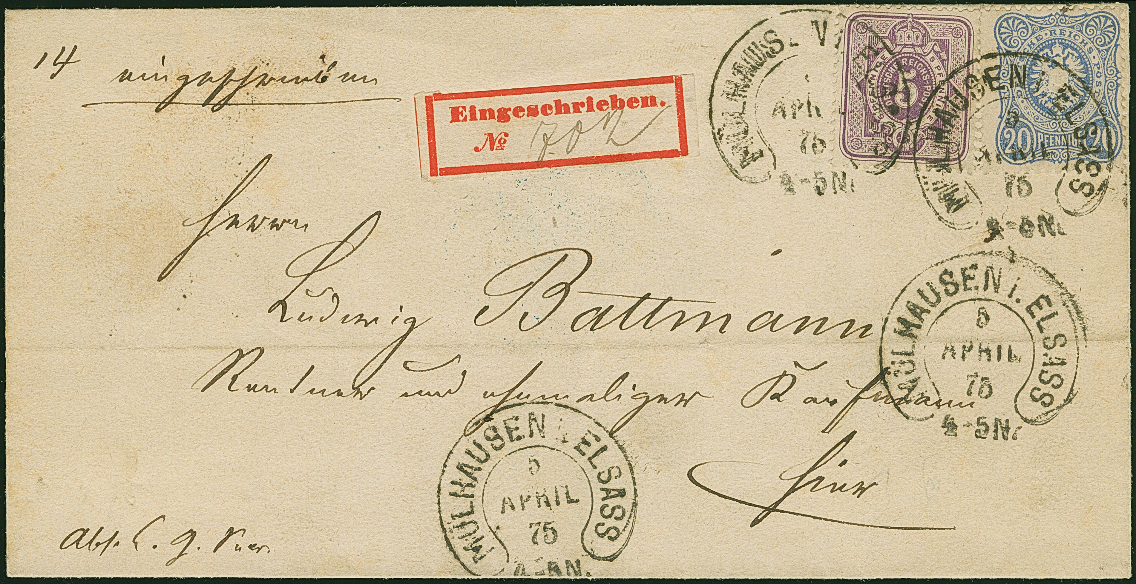 “MÜLHAUSEN i. ELSASS 6.APRIL.75” (Spalink 26-8) mehrfach klar auf 5 Pfge graupurpur and 20 Pfge dunkelultramarin als tarifgerechte Einzelfrankatur auf R-Ortsbriefhülle mit frühem R-Zettel “Eingeschrieben No.” und Ankunftsstempel, Die farbfrischen Marken sind normal gezähnt und wie die Briefhülle in einwandfreier Erhaltung, Fotobefund Petry BPP (2020)
