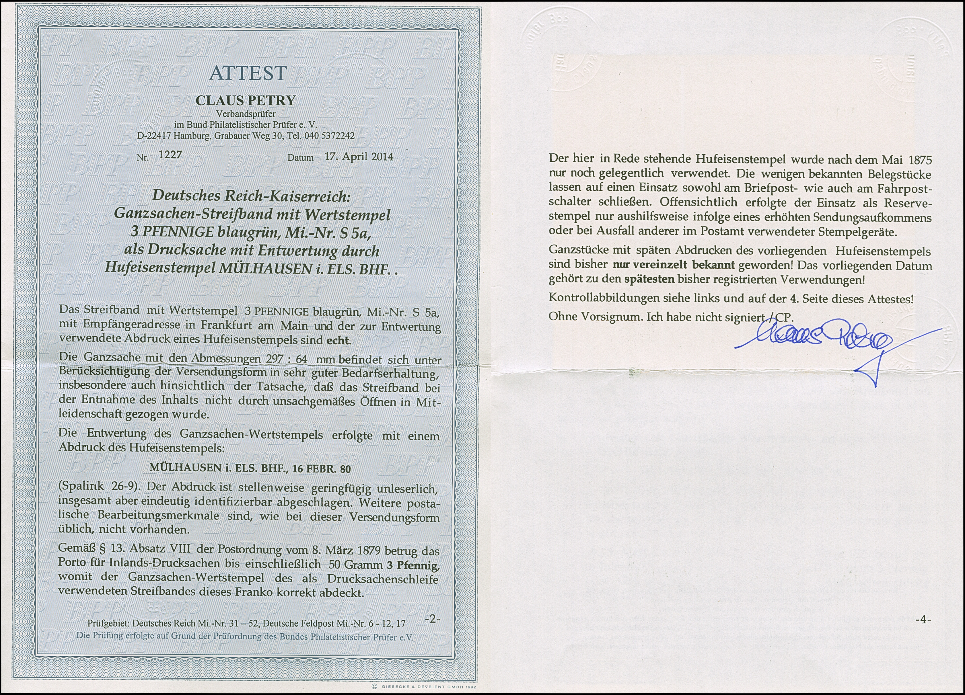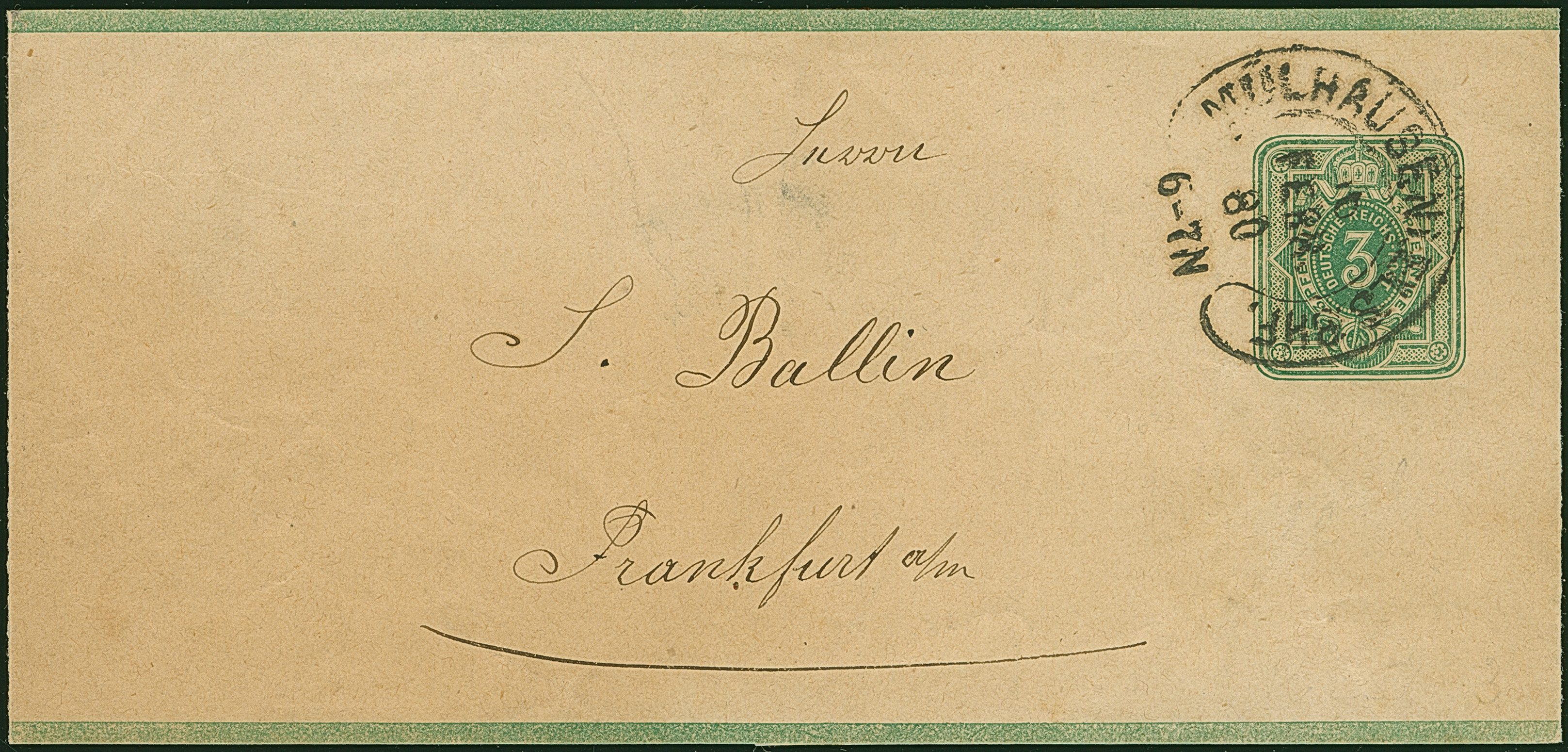 “MÜLHAUSEN i. ELS.BHF. 16.FEBR.80” (Spalink 26-9) sehr klar auf Ganzsachen-Streifband 3 Pfge nach Frankfurt. Das Streifband mit leichten Beförderungs- und Faltspuren, ansonsten in einwandfreier Erhaltung. Dieser Hufeisenstempel wurde nach Mai 1875 nur noch als Reservestempel eingesetzt und ist bisher nur in ganz wenigen Stücken bekannt. Hier nun mit einer der spätesten Verwendungen aus 1880, Fotoattest Petry BPP (2014)