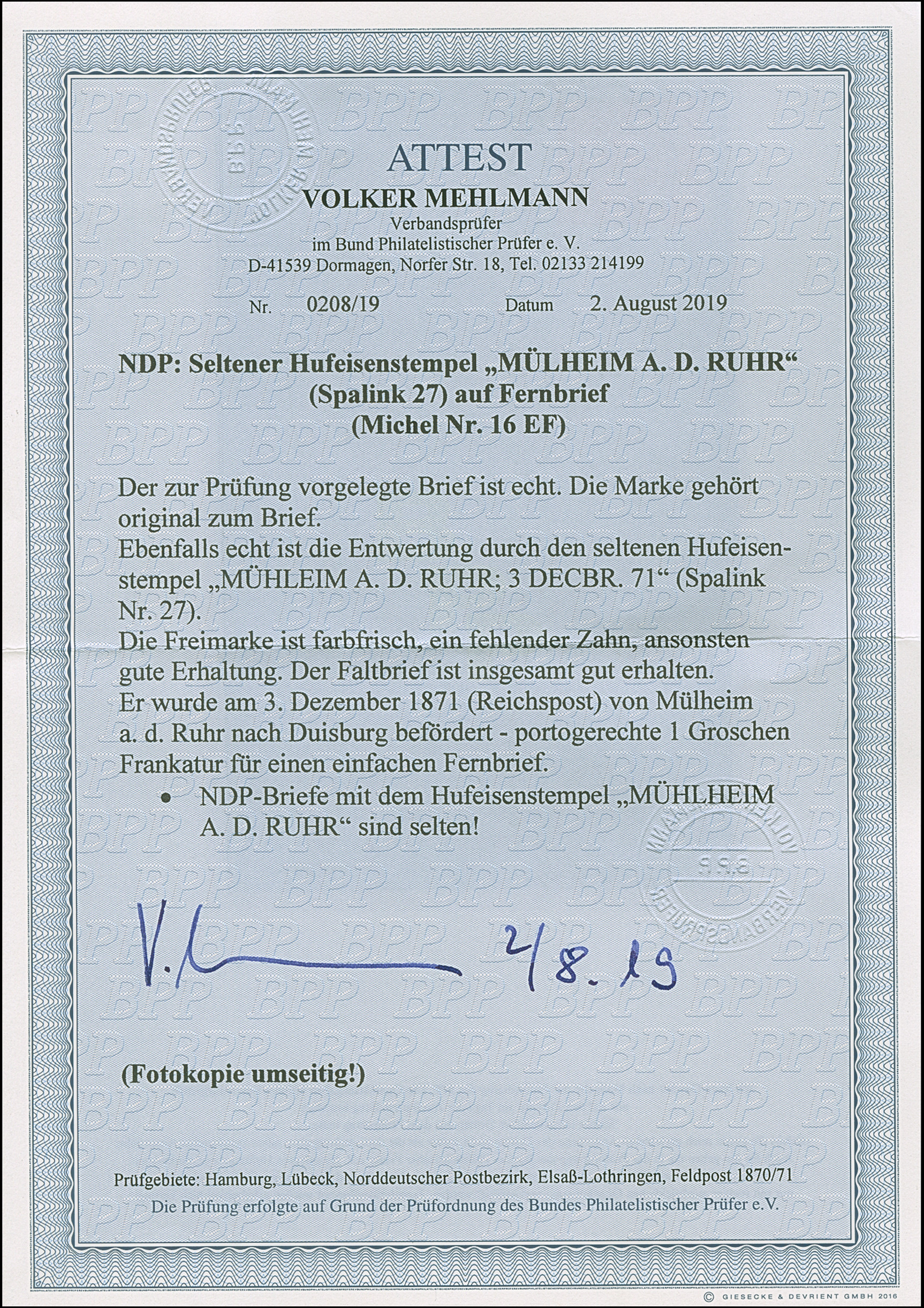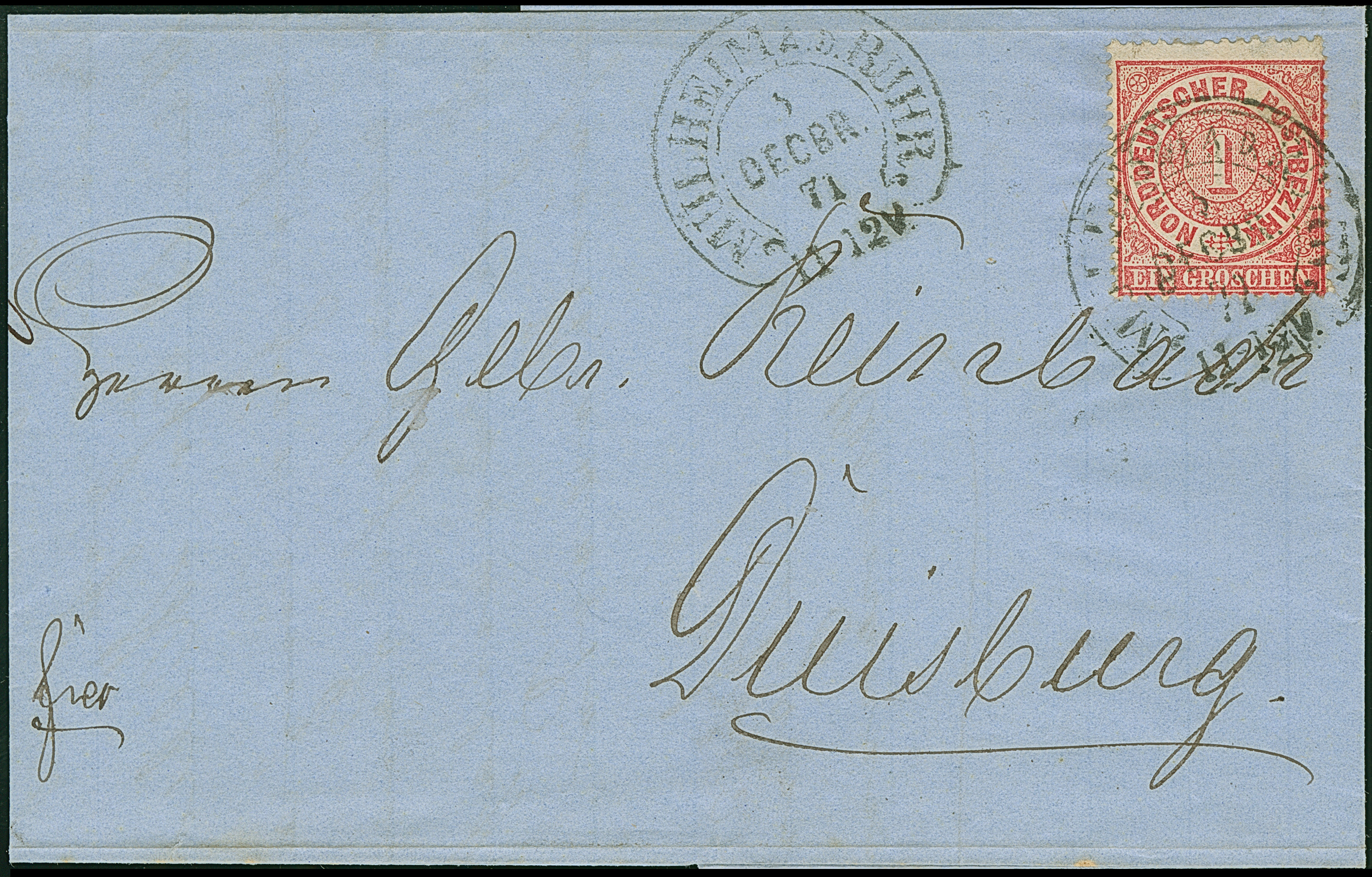 "MÜHLHEIM A.D. RUHR 3.DECBR.71 (Spalink 27) klar auf Norddeutscher Postbezirk 1 Gr. gezähnt auf komplettem Faltbrief nach Duisburg mit Ausgabestempel. Die farbfrische Marke hat einen kurzen Zahn, ansonsten wie der Faltbrief in einwandfreier Erhaltung, Fotoattest Mehlmann BPP (2019)