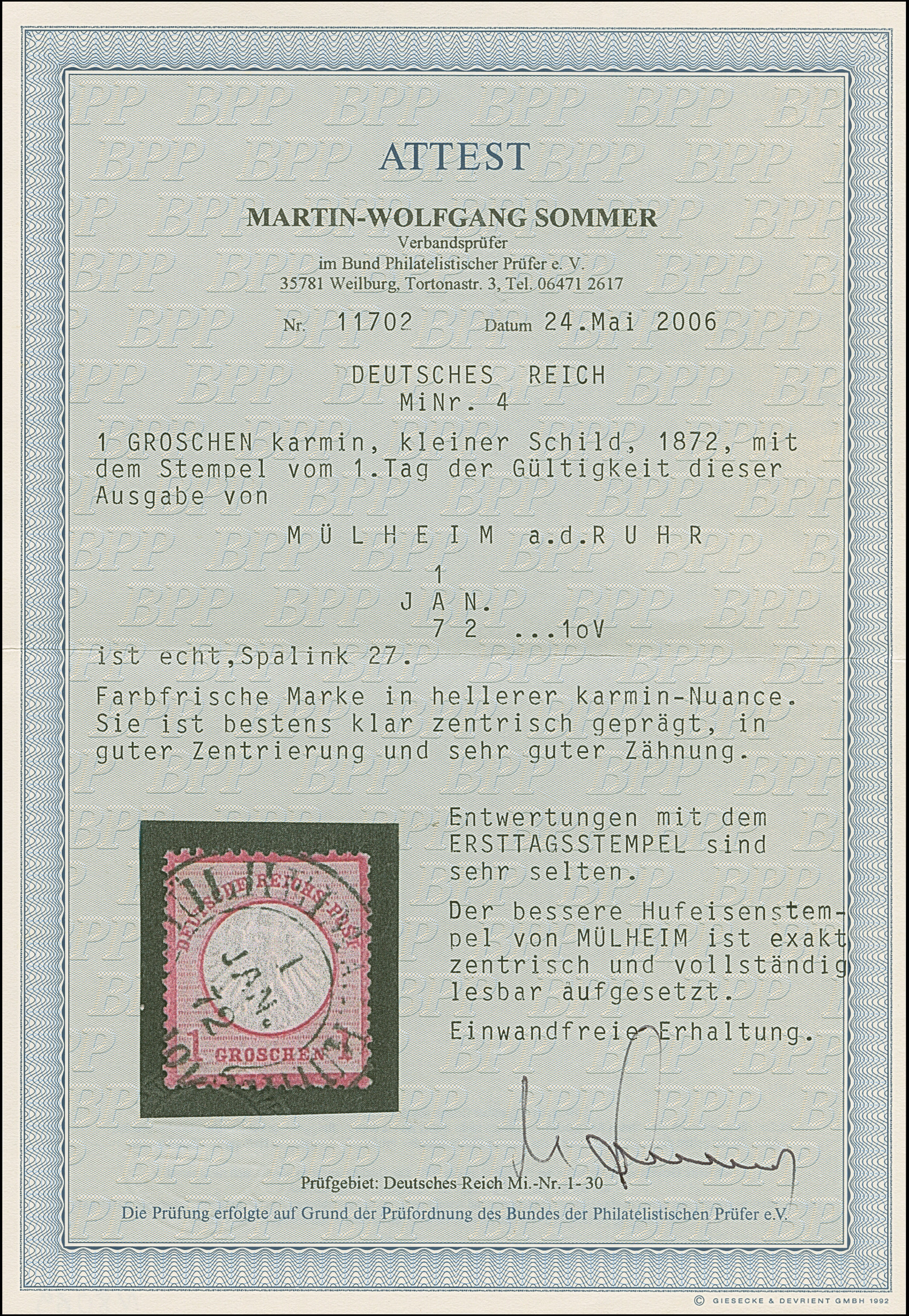 “MÜHLHEIM A.D.RUHR 1.JAN.72” (Spalink 27) klar auf loser Marke 1 Gr. karmin. Die farbfrische Marke ist deutlich geprägt und bis auf wenige verkürzte Zähne normal gezähnt und in einwandfreier Erhaltung. Eine dekorative Marke mit Ersttagsstempel, Fotoattest Sommer BPP (2006)