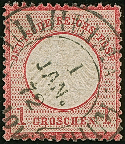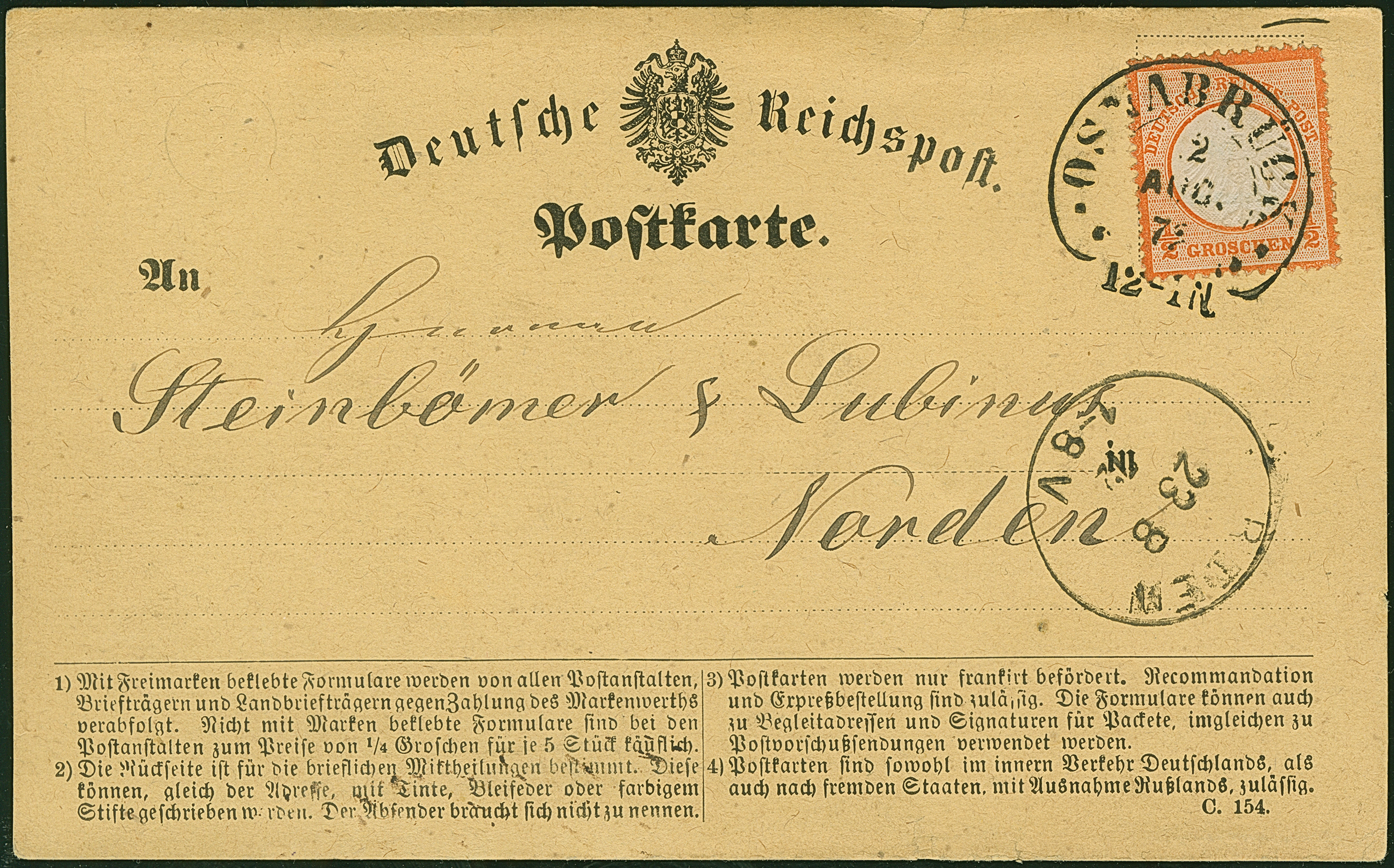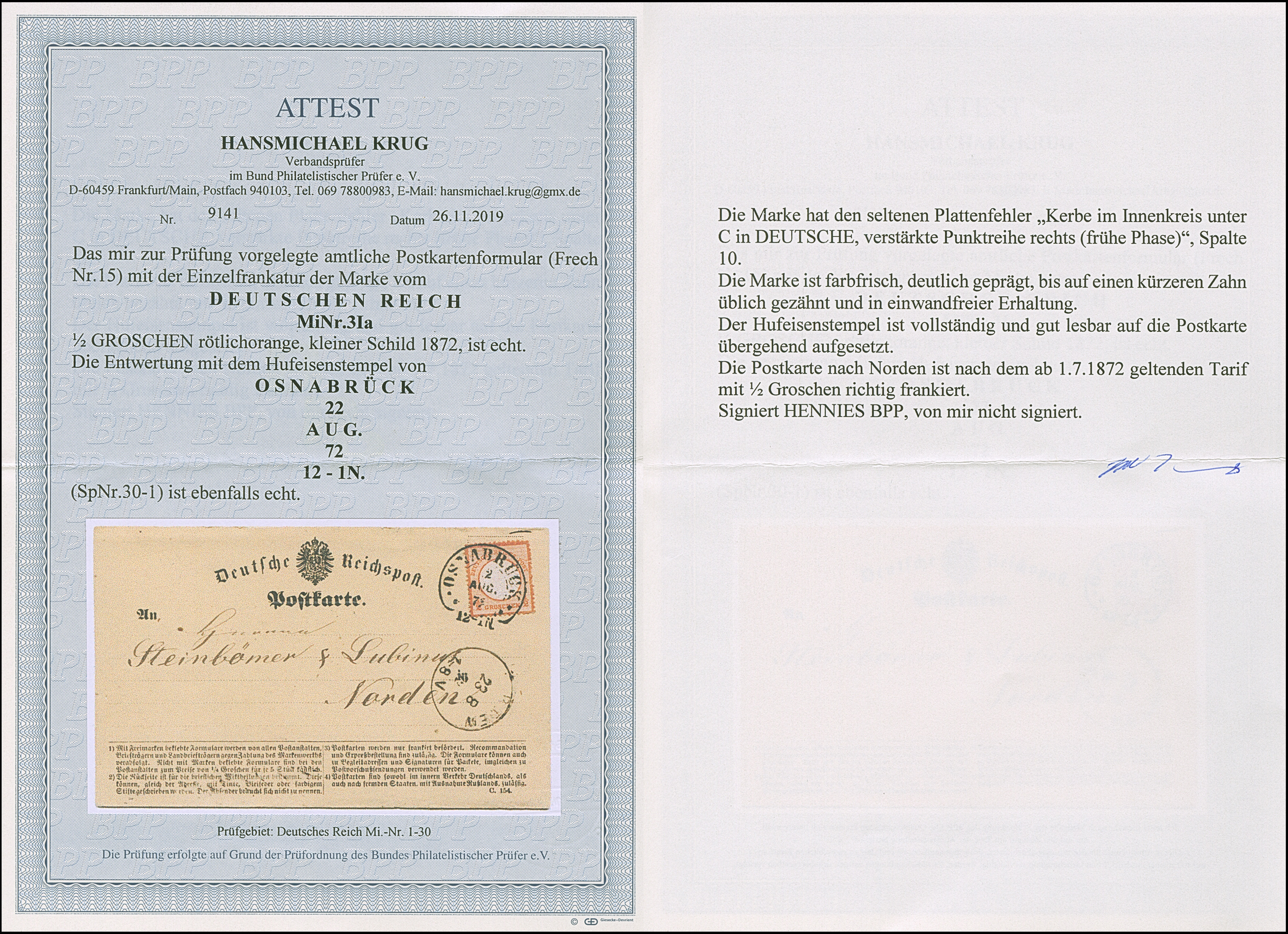 “OSNABRÜCK 22.AUG.72 (Spalink 30-1) klar auf kleiner Schild ½ Gr. rötlichorange mit Plattenfehler ”Kerbe im Innenkreis unter C in Deutsche, verstärkte Punktreihe rechts" (frühe Phase) auf amtlichem Postkarten-Formular nach Norden mit Ankunftsstempel. Die farbfrische Marke ist deutlich geprägt, bis auf einen kürzeren Zahn üblich gezähnt und in einwandfreier Erhaltung, Fotoattest Krug BPP (2019)