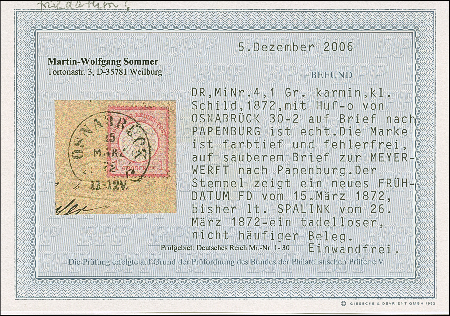 “OSNABRÜCK 15.MÄRZ.72” (Spalink 30-2) klar auf kleiner Schild 1 Gr. karmin auf Briefkuvert nach Papenburg mit Ankunftsstempel. Die farbfrische Marke ist gut geprägt und gut gezähnt und bis auf einen kleinen Eckbug in einwandfreier Erhaltung. Ein schöner Brief mit neuem Frühdatum, Fotobefund Sommer BPP (2006)