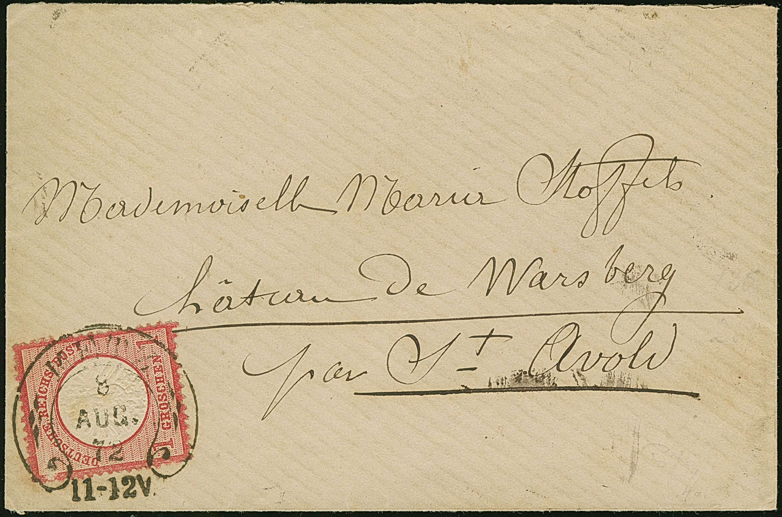 “METZ 8.AUG.72” (Spalink 25-1) klar auf großer Schild 1 Gr. karmin auf Brief nach St. Avoid mit Ankunftsstempel. Die farbfrische Marke ist gut geprägt und gut gezähnt, sie hat vorderseitig eine Schürfstelle. Ansonsten ist sie wie der Umschlag in einwandfreier Erhaltung. Interessanter Brief mit neuem Frühdatum vom 8.8.1872