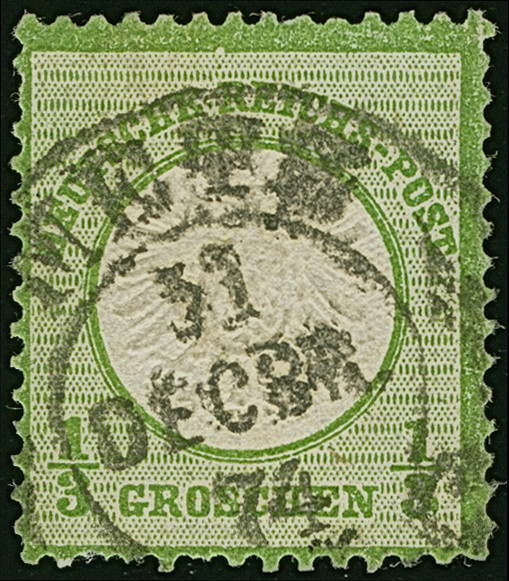 “METZ 31.DECBR.74” (Spalink 25-1N) recht klar auf loser Marke großer Schild ⅓ Gr. gelblichgrün mit Plattenfehler “helle Kerbe im oberen Rahmen links über R in REICHS”. Die farbfrische Marke ist gut geprägt mit kleinen Zahnfehlern unten. Interessante Verwendung vom letzten Gültigkeitstag der ⅓ Gr.-Marken, hier mit besserem Hufeisenstempel, Fotoattest Krug BPP (2010)