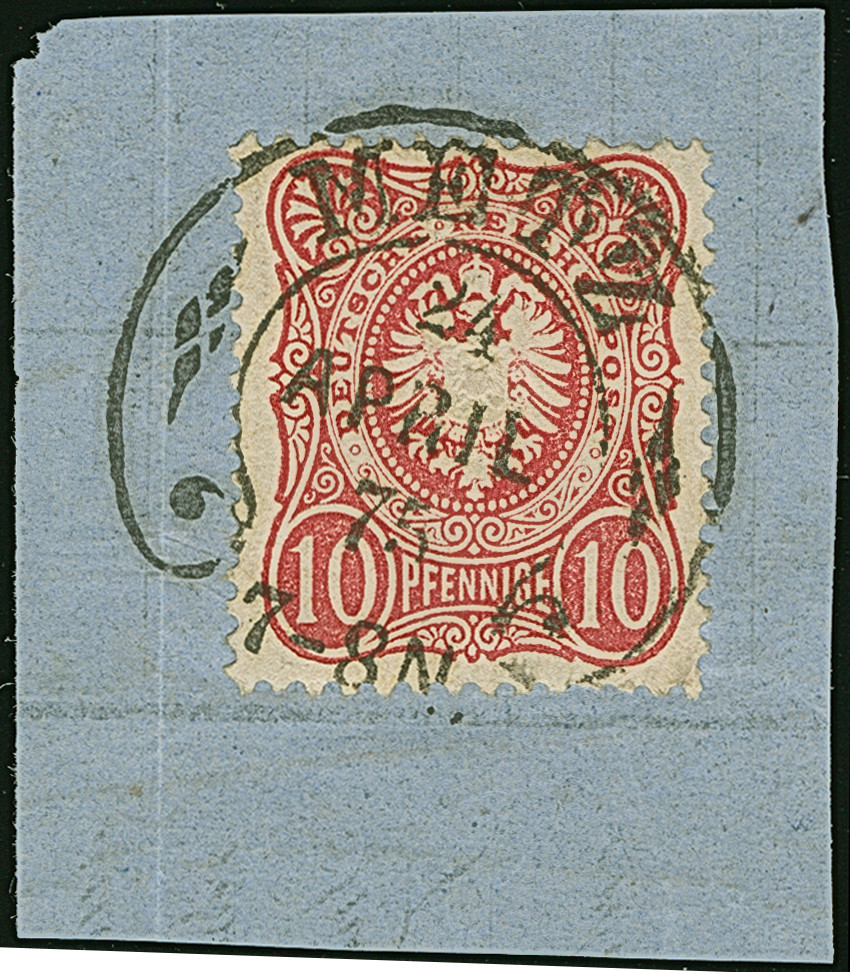 “METZ 24.APRIL.74” (Spalink 25-1N) sehr klar auf 10 Pfge lilarot auf Briefstück. Die farbfrische Marke ist in einwandfreier Erhaltung, das Briefstück mit Faltspuren. Ein schönes Briefstück mit neuem Spätdatum vom 24.4.1875