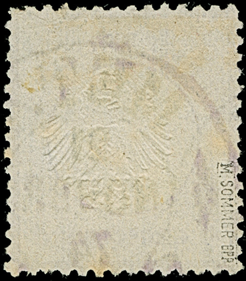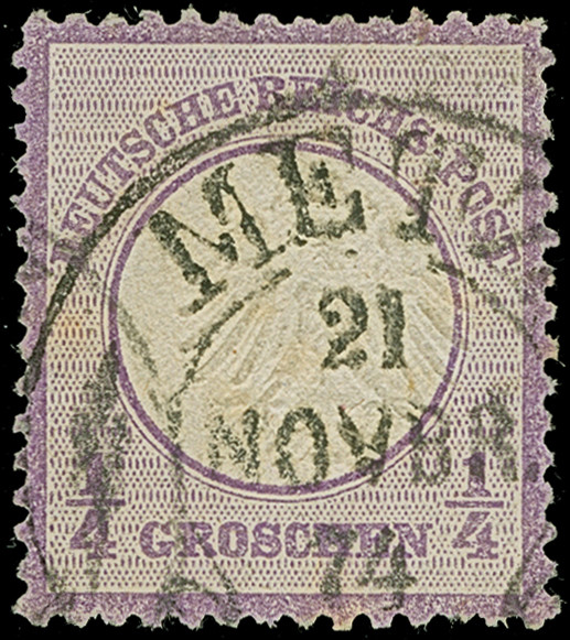 “METZ 21.NOVBR.74” (Spalink 25-2) klar auf loser Marke kleiner Schild ¼ Gr. graupurpur. Die farbfrische Marke ist gut geprägt mit kleinen Zahnfehlern, ansonsten in guter Erhaltung. Ein dekoratives Exemplar mit auf Marken mit kleinem Schild seltenem Hufeisenstempel, Fotobefund Sommer BPP (1996)
