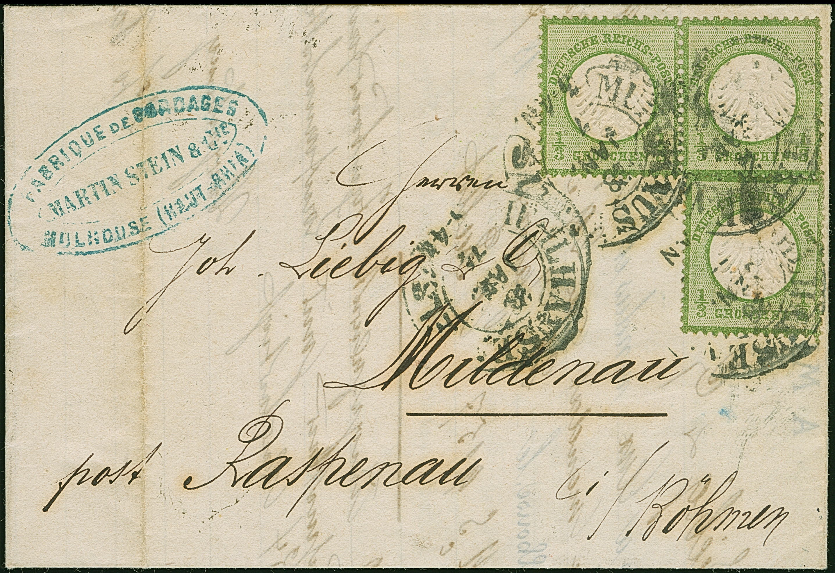 MÜHLHAUSEN i. ELS. 28.1.72" (Spalink 26-2) mehrfach etwas undeutlich auf drei Einzelmarken kleiner Schild ⅓ Gr. dunkelsmaragdgrün als tarifgerechte Mehrfachfrankatur auf komplettem Faltbrief via Basel nach Mildenau bei Raspenau, Böhmen mit Ankunftsstempel. Die farbfrischen Marken sind gut geprägt, die untere Marke mit verkürzten Zähnen rechts durch Randklebung, ansonsten in einwandfreier Erhaltung. Eine dekorative und seltene Mehrfachfrankatur, Fotobefund Sommer BPP (1993)