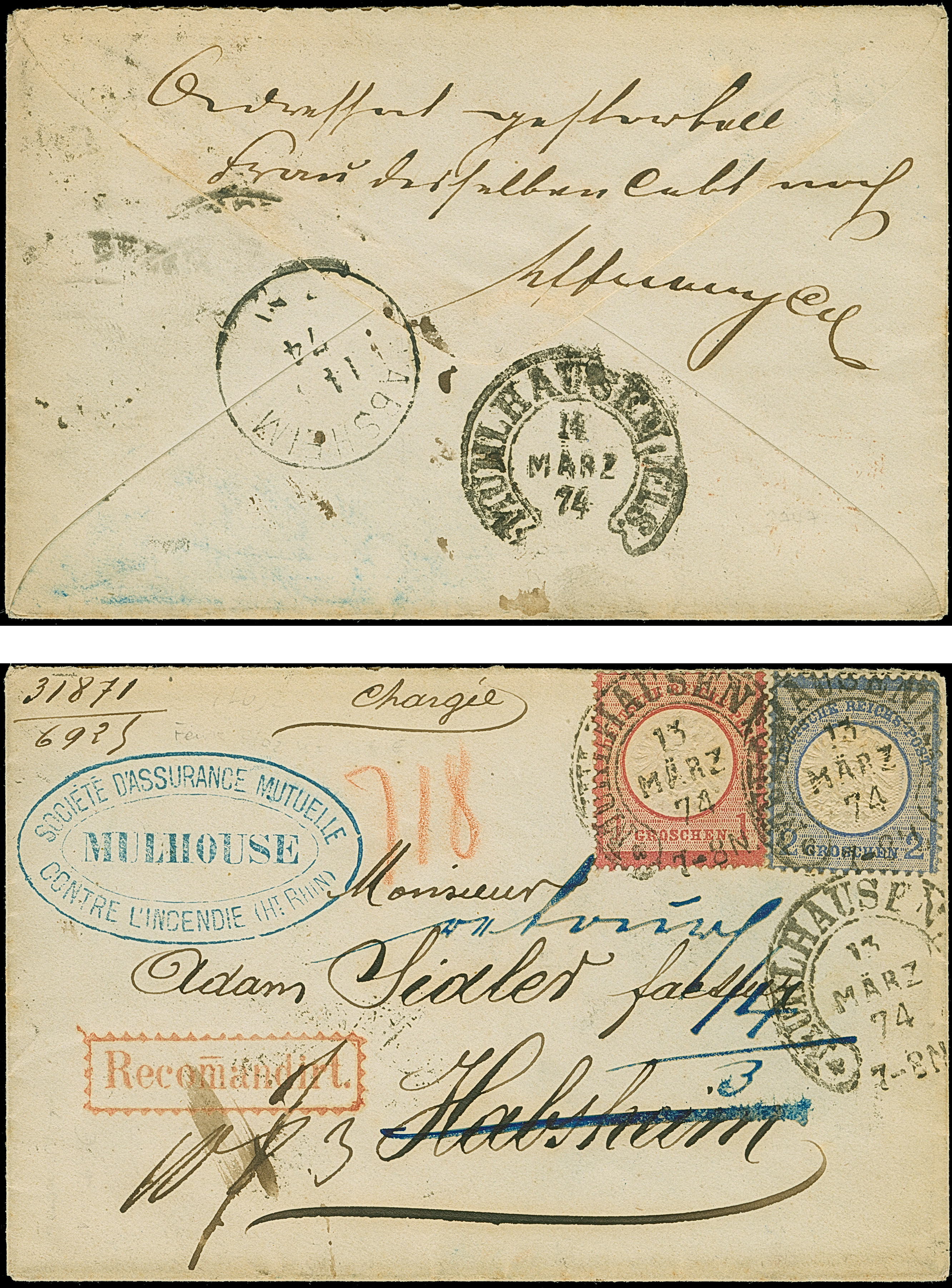 “MÜHLHAUSEN i. ELS. 13.MÄRZ.74” (Spalink 26-2) zweimal klar auf großer Schild 1 Gr. karmin und 2 Gr. grauultramarin als tarifgerechte Frankatur auf R-Briefkuvert nach Habsheim mit Ankunftsstempel und retour mit handschriftlichen Vermerken und rückseitigem Hufeisenstempel “MÜHLHAUSEN i. ELS. 14.MÄRZ.74” (Spalink 26-2) ohne Zeitgruppenriegel als Ankunftsstempel. Die farbfrischen Marken sind gut geprägt, die 2 Gr.-Marke hat recht einen Eckbug, ansonsten typisch gezähnt und in einwandfreier Erhaltung. In dieser Kombination mit beiden Varianten des Hufeisenstempels auf einem Brief vermutlich einmaliges Stück