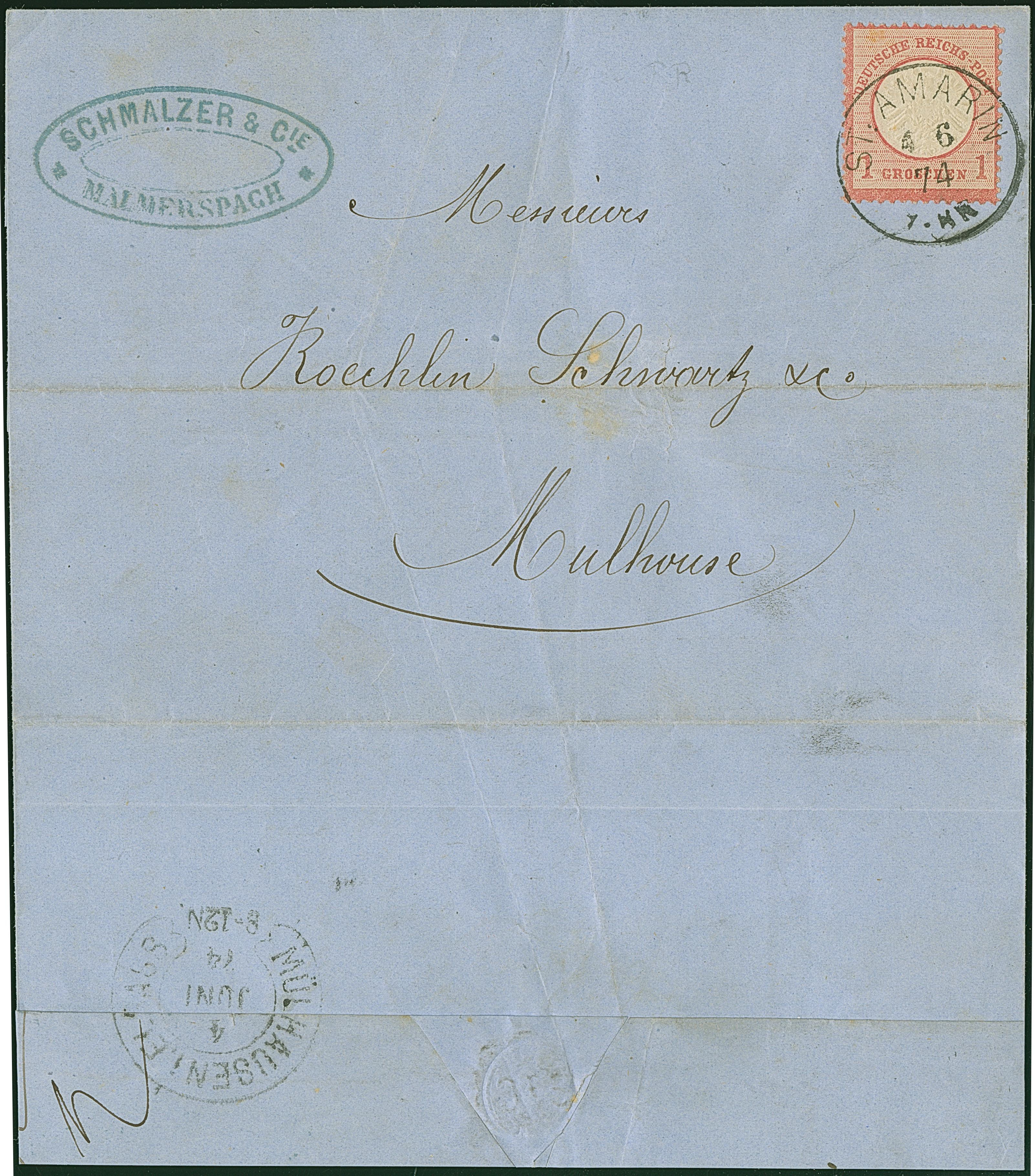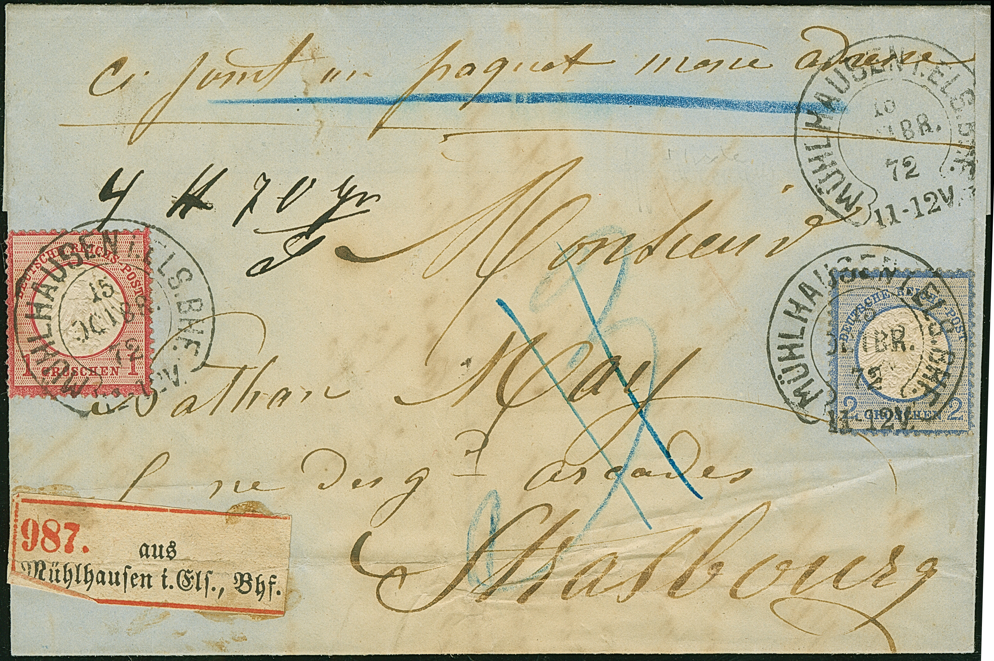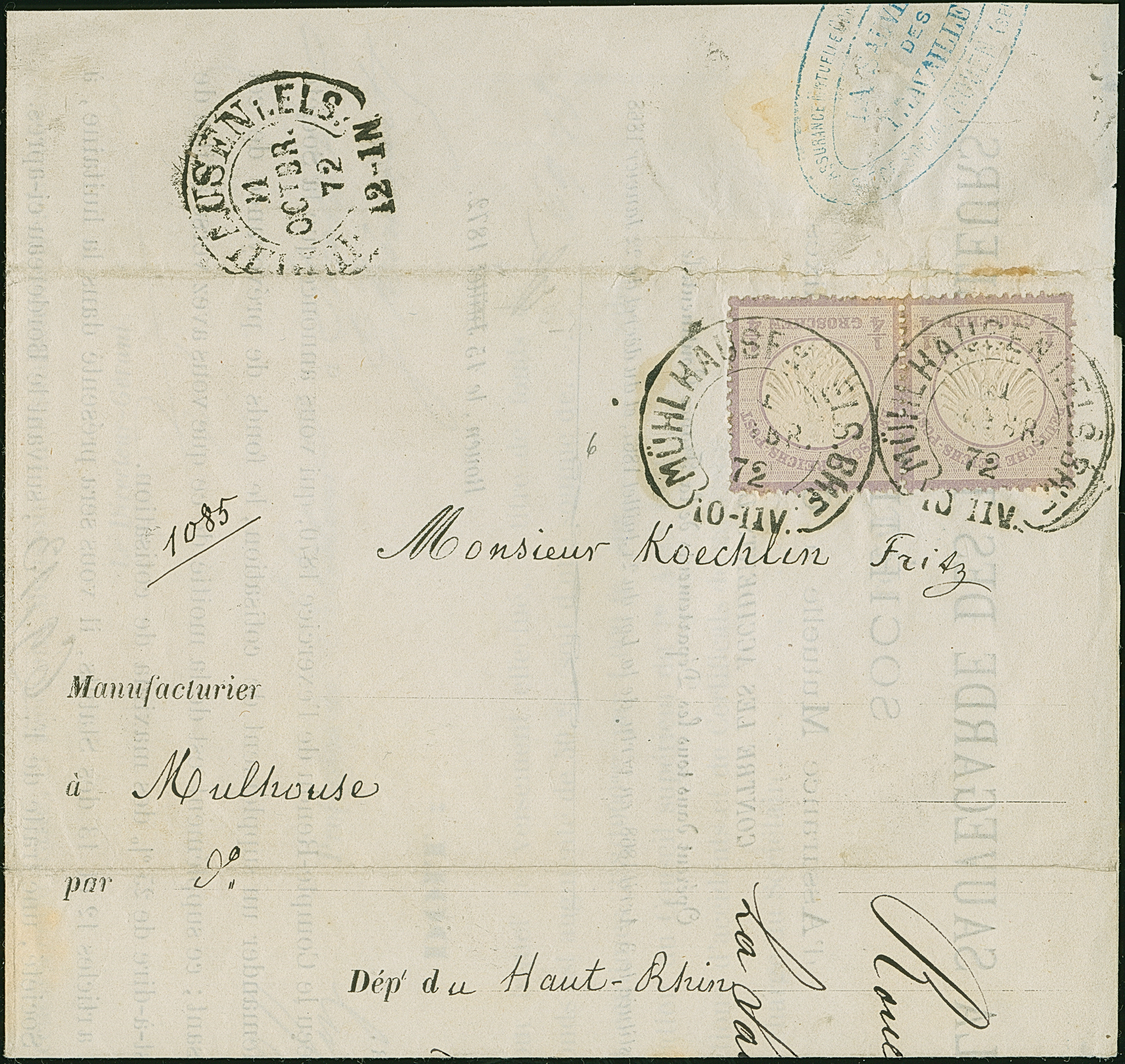 “MÜHLHAUSEN i. ELS. BHF. 11.OCTBR.72” (Spalink 26-5) zweimal klar auf waagerechtem Paar kleiner Schild ¼ Gr. grauviolett als tarifgerechte Mehrfachfrankatur auf komplettem Faltbrief der “LA SAUFEGARDE DES TRAVAILLEURS SOCIÉTÉ” aus Rouyen als Ortsbrief mit rückseitigem Hufeisenstempel “MÜHLHAUSEN i. ELS 11.OCTBR.72” (Spalink 26-2) als Ankunftsstempel. Die farbfrischen Marken sind gut geprägt, haben eine ausgabentypische unregelmäßige, zum Teil raue Zähnung und sind in einwandfreier Erhaltung. Eine interessante Kombination mit sogenanntem “Doppelspänner”