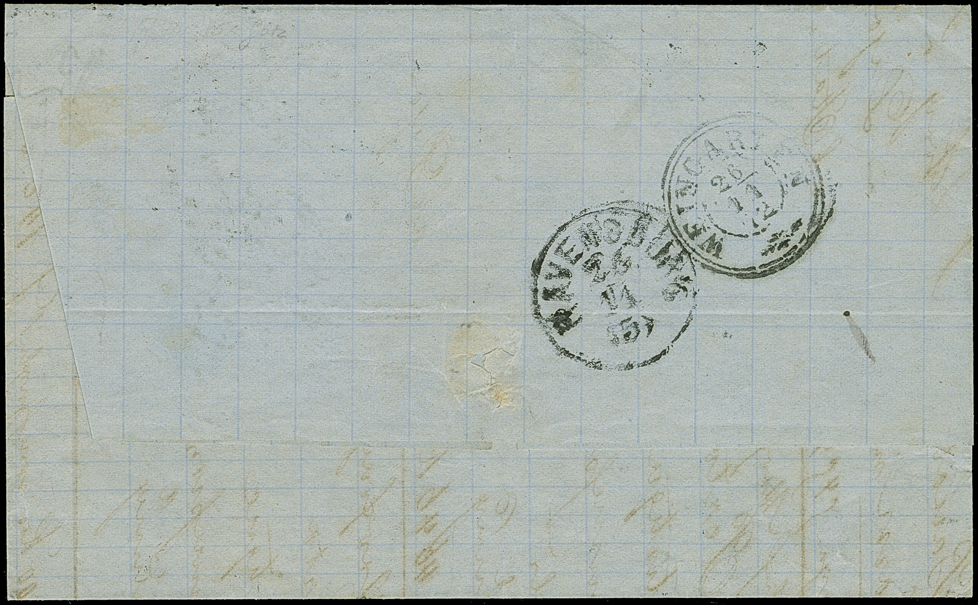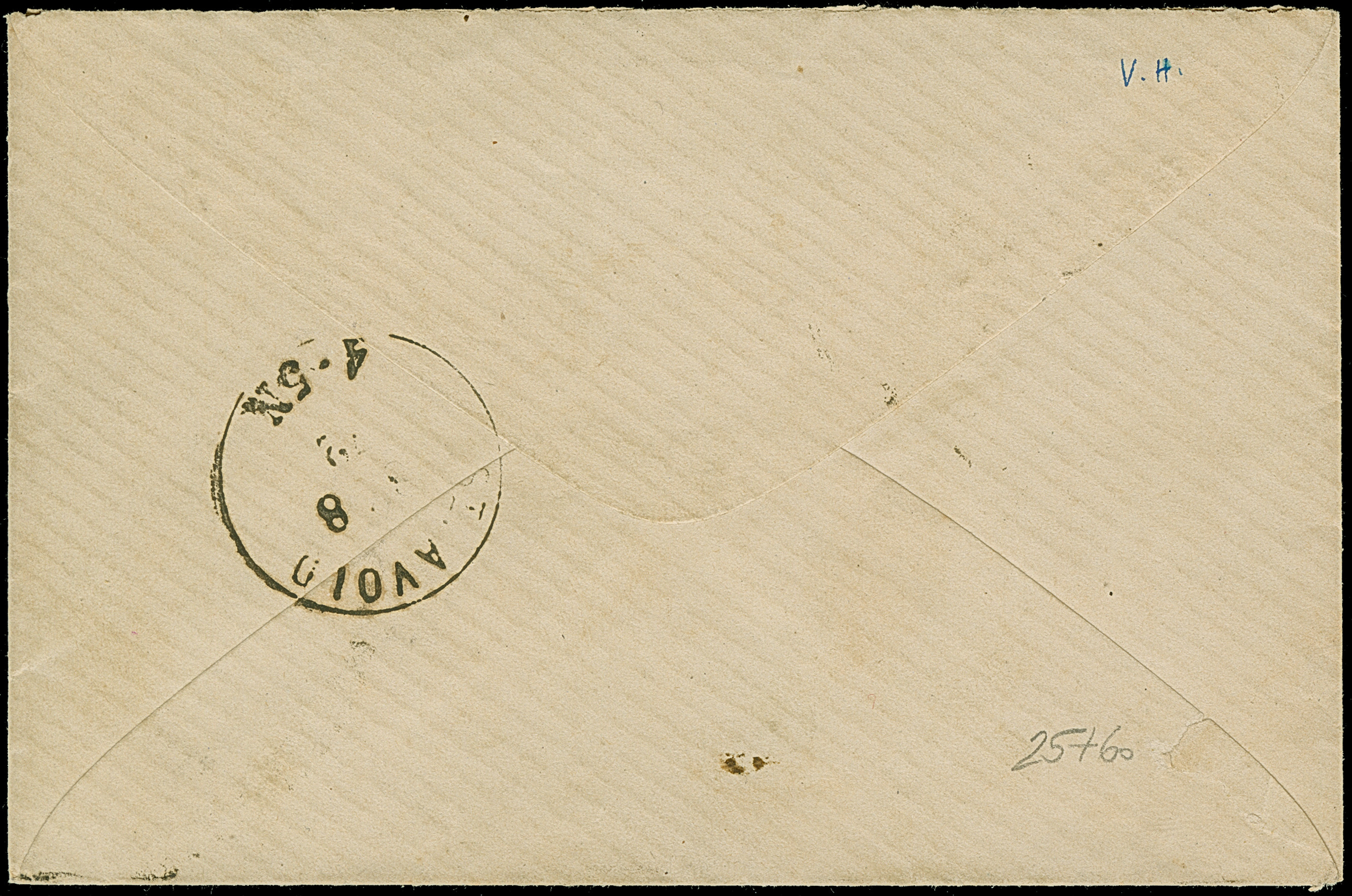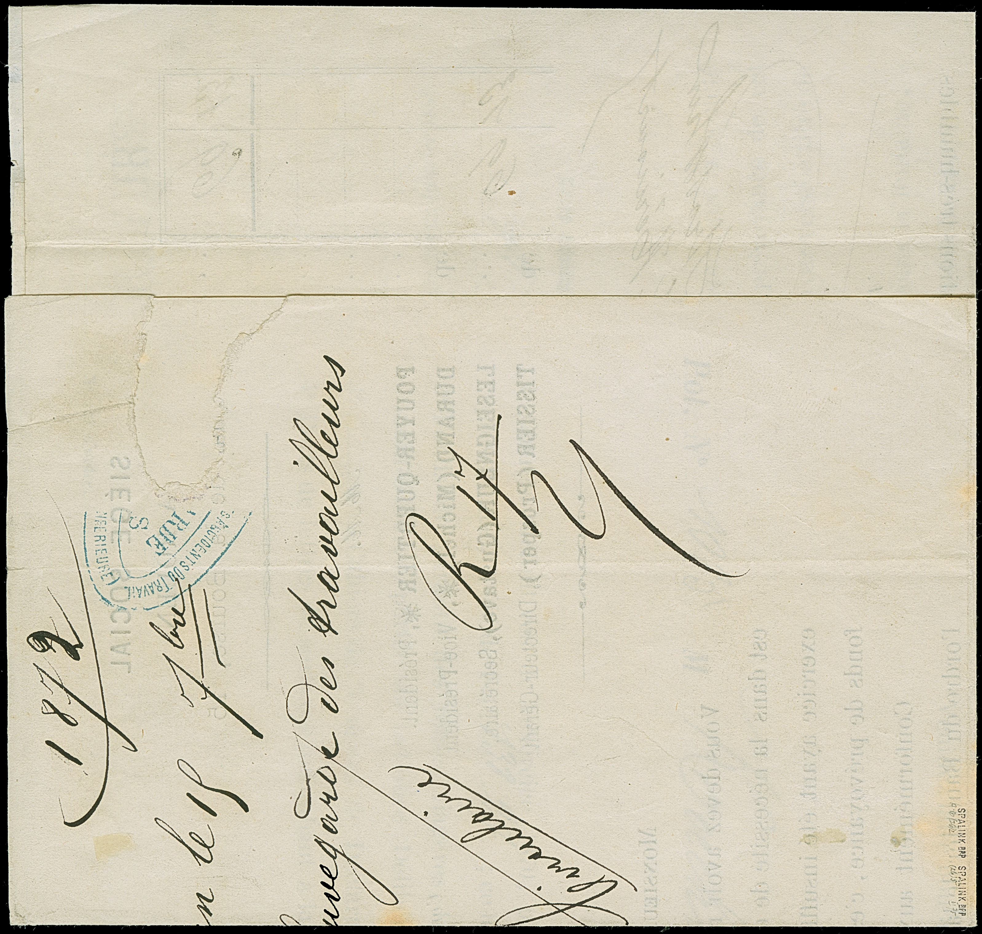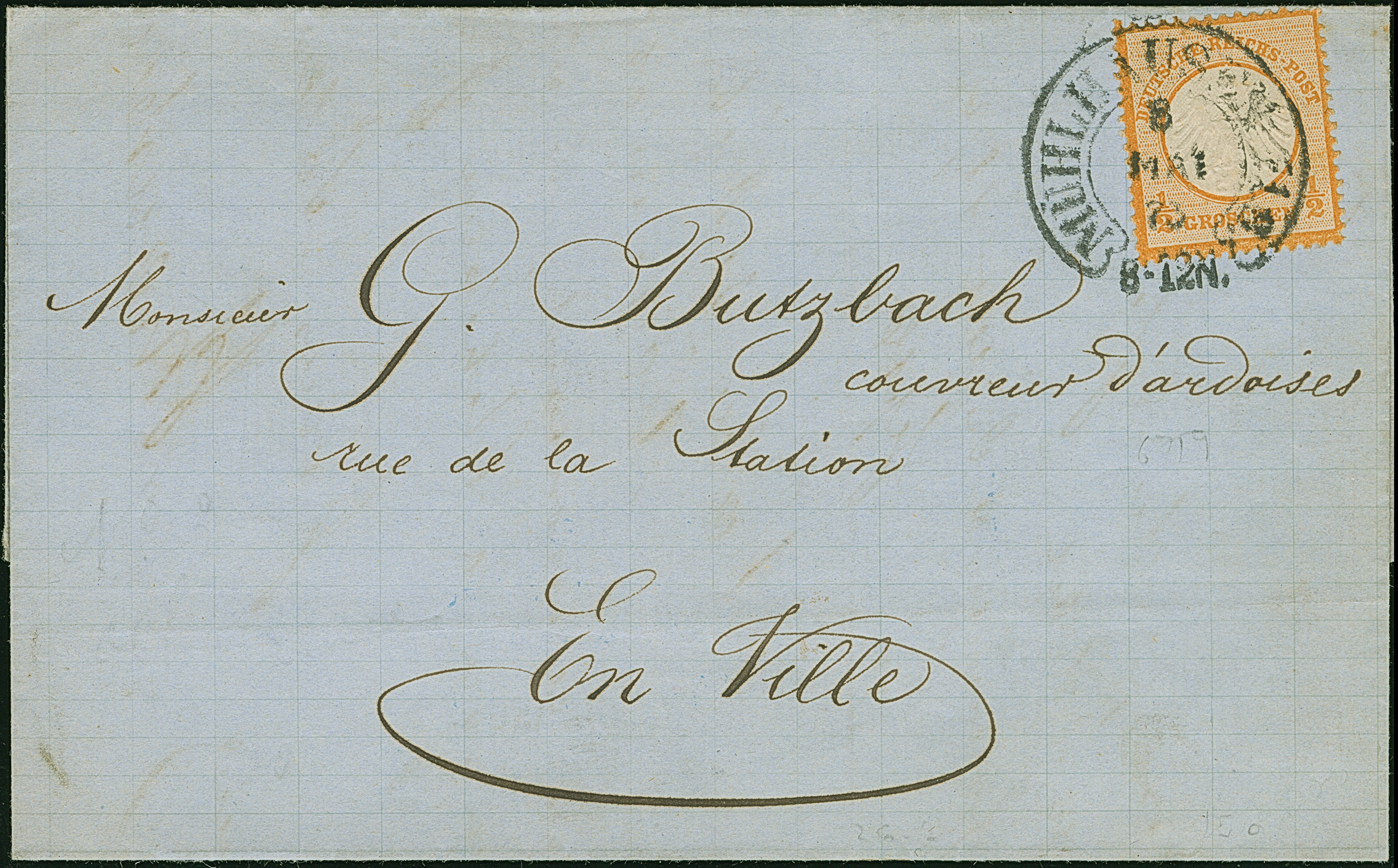“MÜHLHAUSEN i. ELS. BHF. 11.OCTBR.72” (Spalink 26-5) zweimal klar auf waagerechtem Paar kleiner Schild ¼ Gr. grauviolett als tarifgerechte Mehrfachfrankatur auf komplettem Faltbrief der “LA SAUFEGARDE DES TRAVAILLEURS SOCIÉTÉ” aus Rouyen als Ortsbrief mit rückseitigem Hufeisenstempel “MÜHLHAUSEN i. ELS 11.OCTBR.72” (Spalink 26-2) als Ankunftsstempel. Die farbfrischen Marken sind gut geprägt, haben eine ausgabentypische unregelmäßige, zum Teil raue Zähnung und sind in einwandfreier Erhaltung. Eine interessante Kombination mit sogenanntem “Doppelspänner”