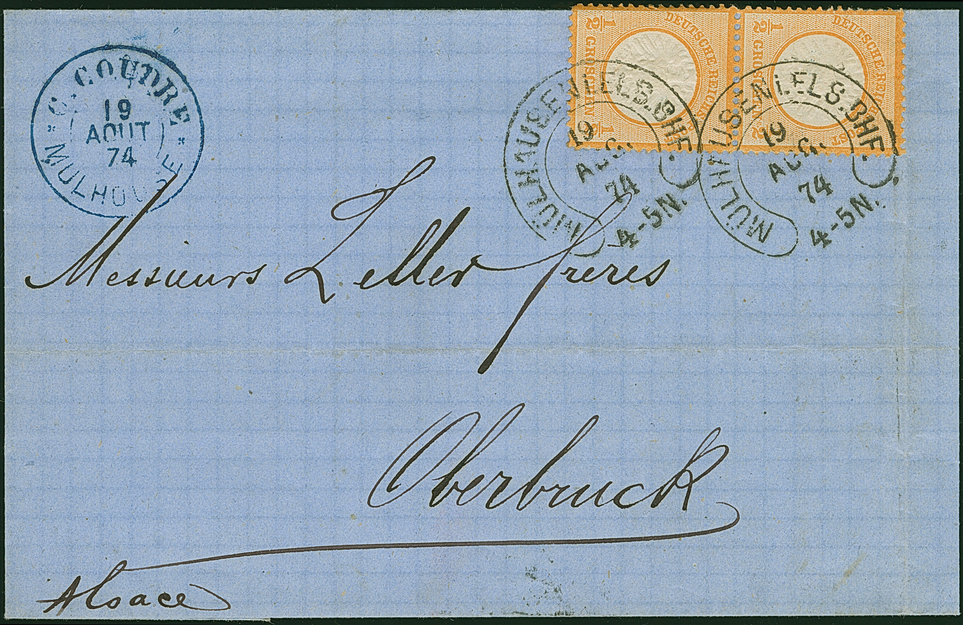 “MÜLHAUSEN i. ELS.BHF. 19.AUG.74” (Spalink 26-9) zweimal sehr klar auf senkrechtem Paar großer Schild ½ Gr. orange als tarifgerechte Mehrfachfrankatur auf komplettem Faltbrief nach Oberbruck mit Ankunftsstempel. Die farbfrischen Marken sind gut geprägt, durch Randklebung zum Teil mit leicht verkürzten Zahnspitzen und ansonsten wie der Faltbrief in einwandfreier Erhaltung. Eine dekorative Mehrfachfrankatur mit besserem Hufeisenstempel und neuem Frühdatum vom 19.8.1874