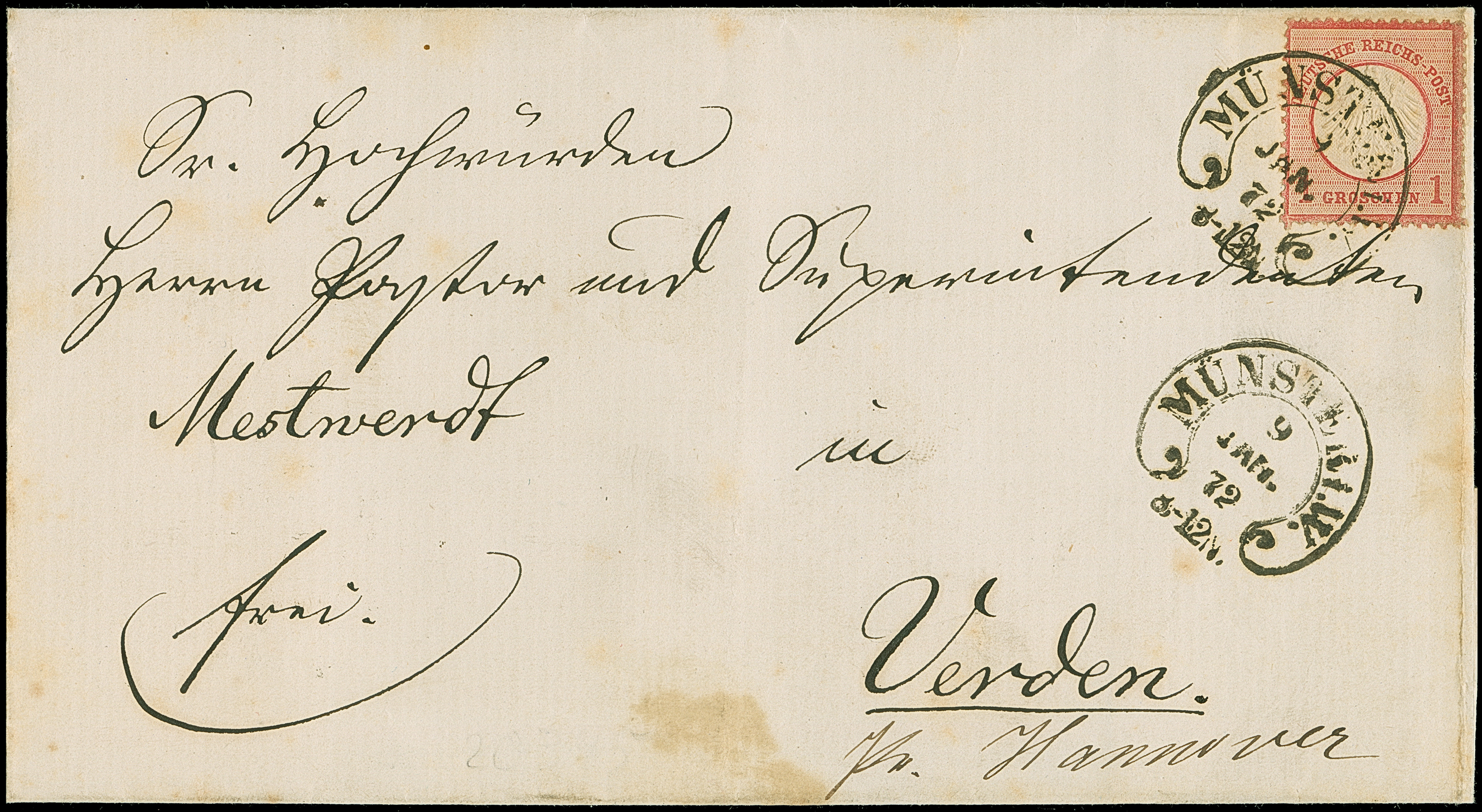 “MÜNSTER i. W. 9.JAN.72” (Spalink 28) sehr klar auf kleiner Schild 1 Gr. karmin auf Faltbriefhülle nach Verden mit Ankunftsstempel. Die farbfrische ist sehr gut geprägt, gut gezähnt und in einwandfreier Erhaltung. Interessanter Brief mit neuem Frühdatum vom 9.1.1872, signiert Spalink BPP