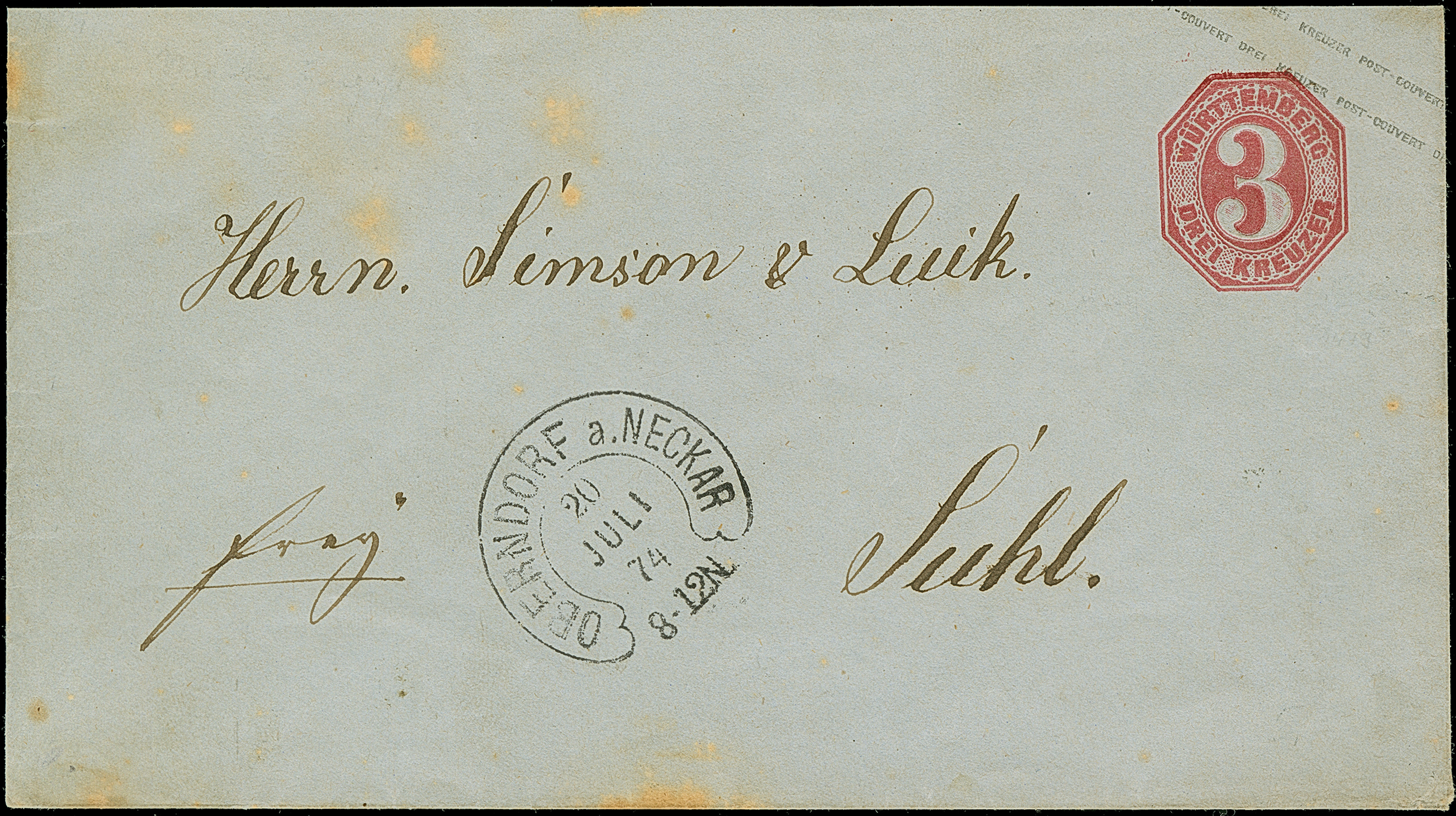 “OBERNDORF a. NECKAR 20.JULI.74” (Spalink 29) klar auf Ganzsachen-Umschlag Württemberg 3 Kr. nach Suhl mit Ausgabestempel. Der Umschlag mit leichten Altersspuren, ansonsten in guter Erhaltung, signiert Spalink BPP