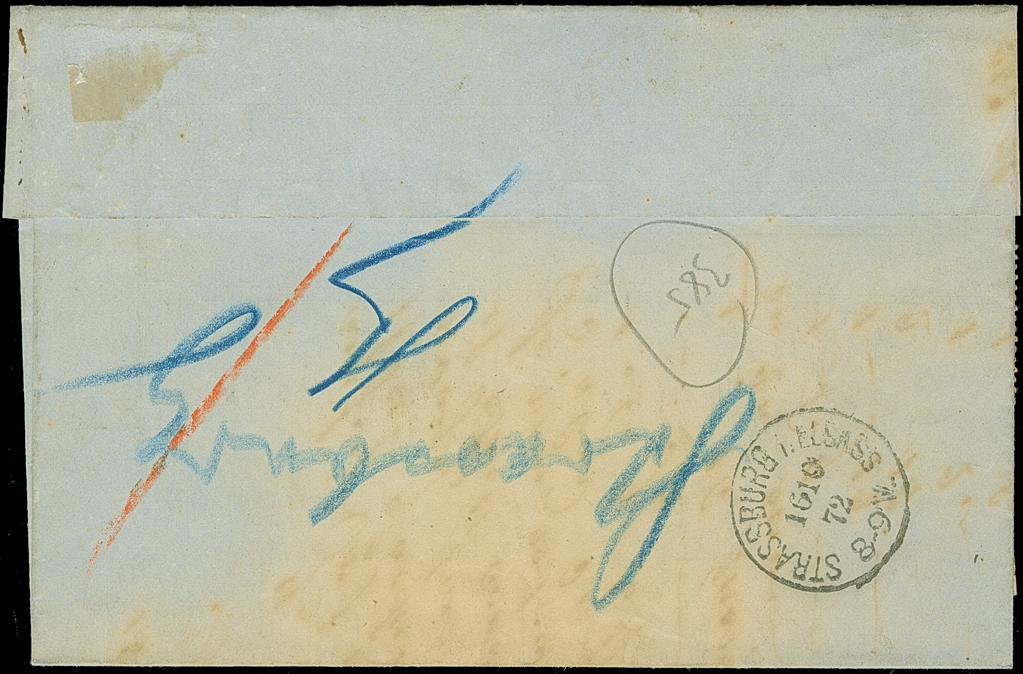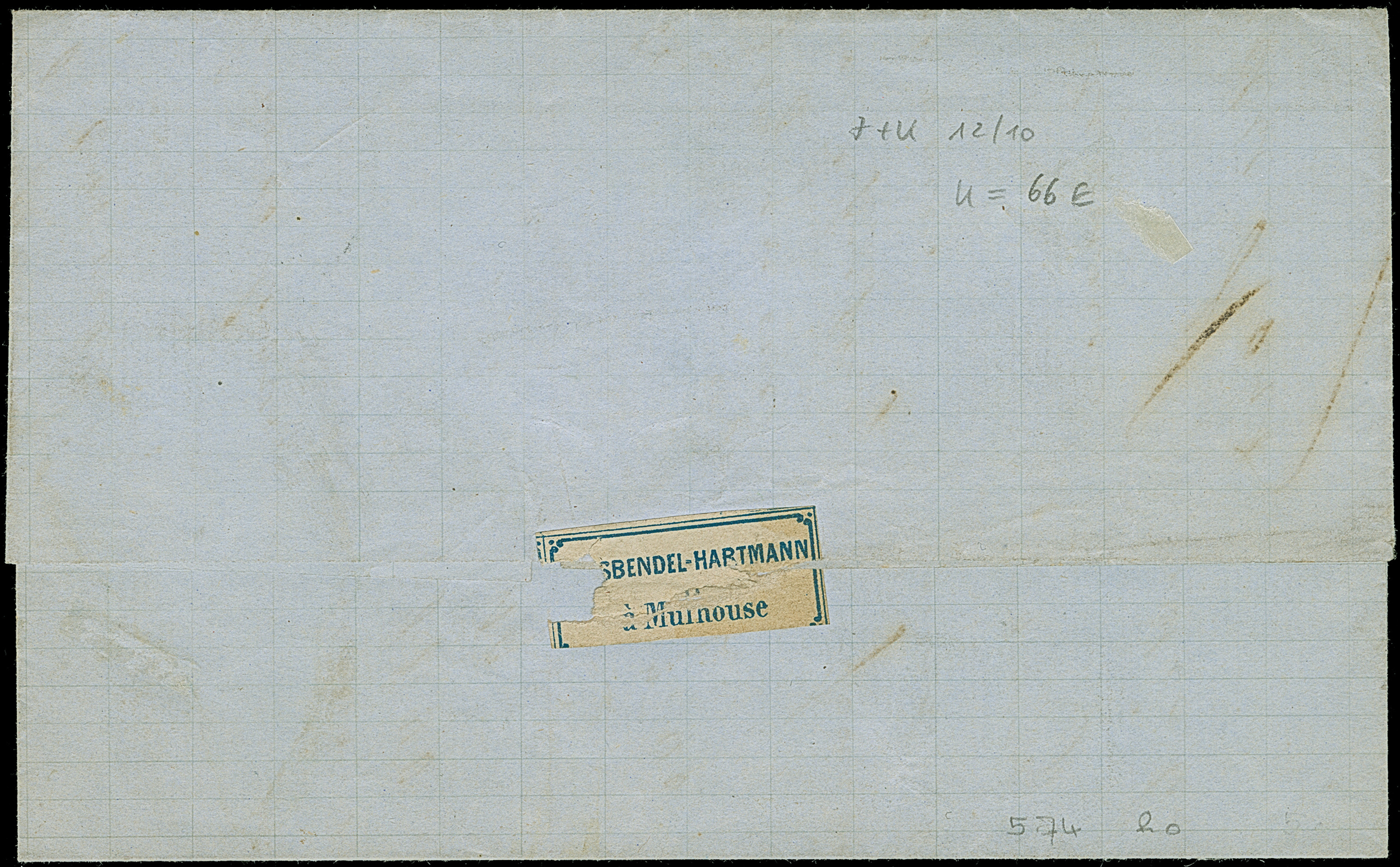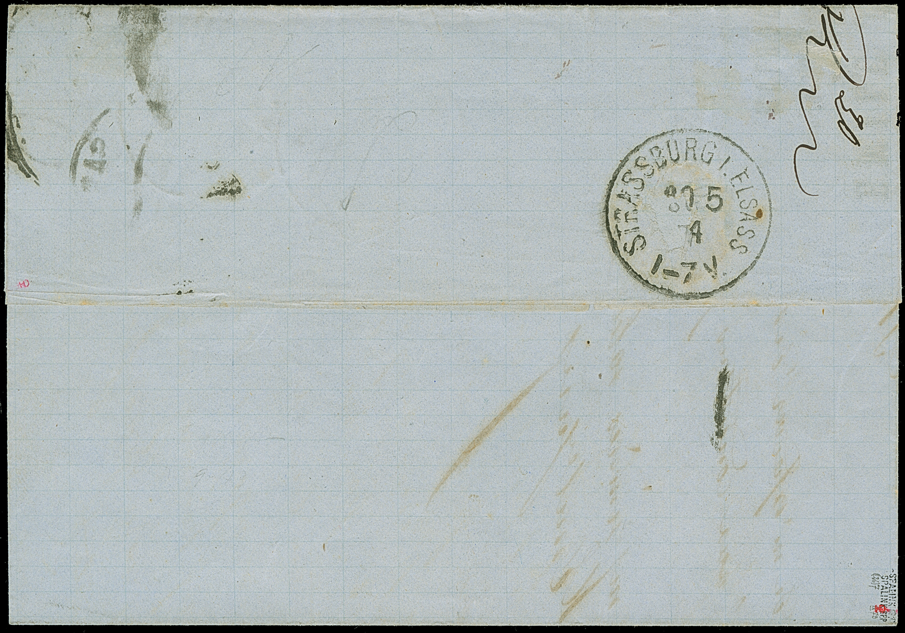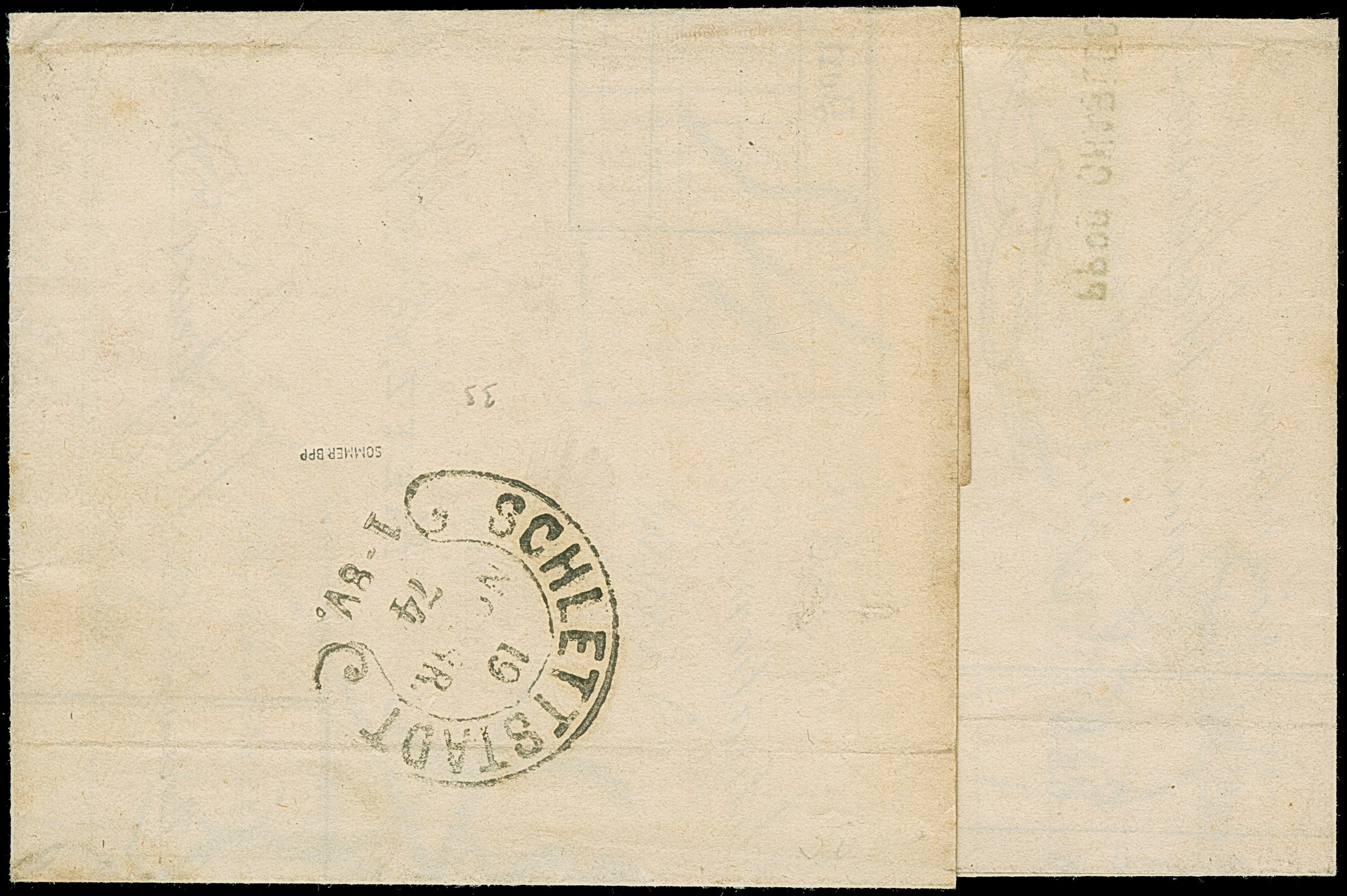 “MÜHLHAUSEN i. ELS. 26.JAN.72” (Spalink 26-3) recht klar auf kleiner Schild 2 Gr. grauultramarin auf komplettem Faltbrief mit rotem frz. Transitstempel und Tax-Stempel “25” via Paris nach Bellême. Die farbfrische Marke ist gut geprägt, normal gezähnt und wie die Briefhülle in einwandfreier Erhaltung. Eine dekorative Doppelfrankatur mit Fotobefund Sommer BPP (1998)