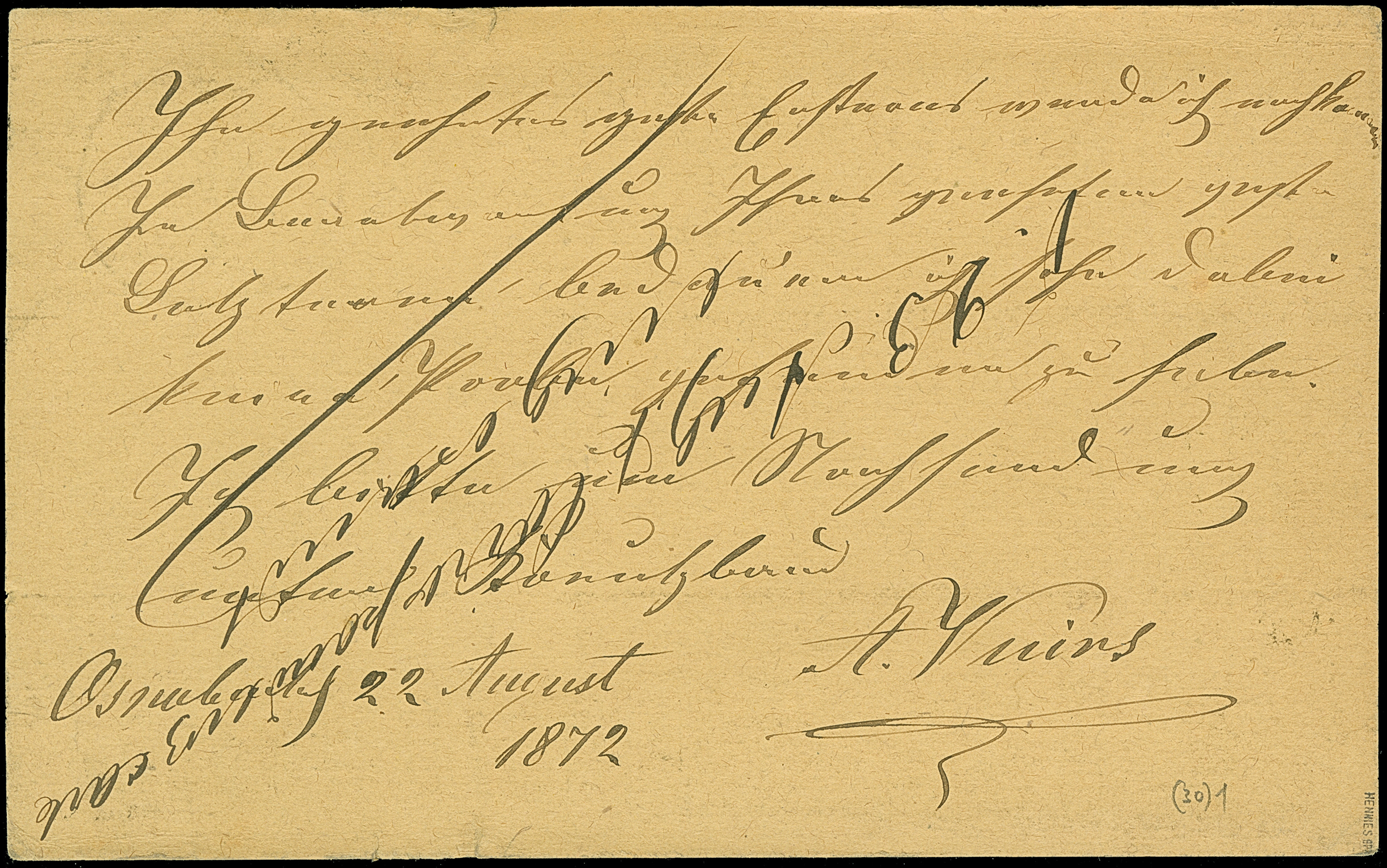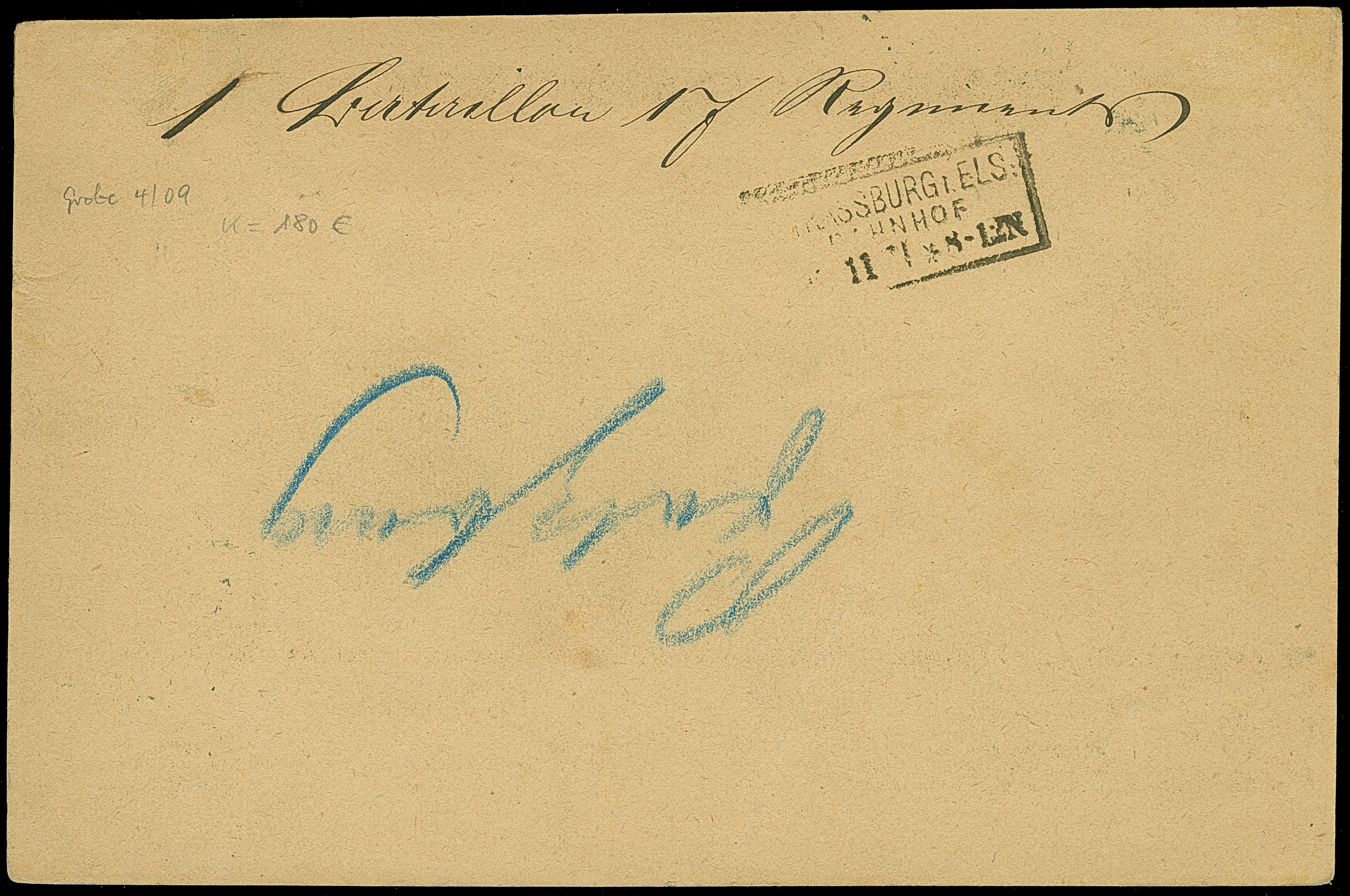 “MÜHLHAUSEN i. ELS 16.NOVBR.71” (Spalink 26-1) sehr klar auf amtlicher Feldpost-Correspondenzkarte als portofreie Militaria-Paketbegleitkarte nach Ratzeburg mit vorderseitigem Ankunftsstempel, in guter Erhaltung. Eine ganz ungewöhnliche Verwendung bei der Fahrtpost