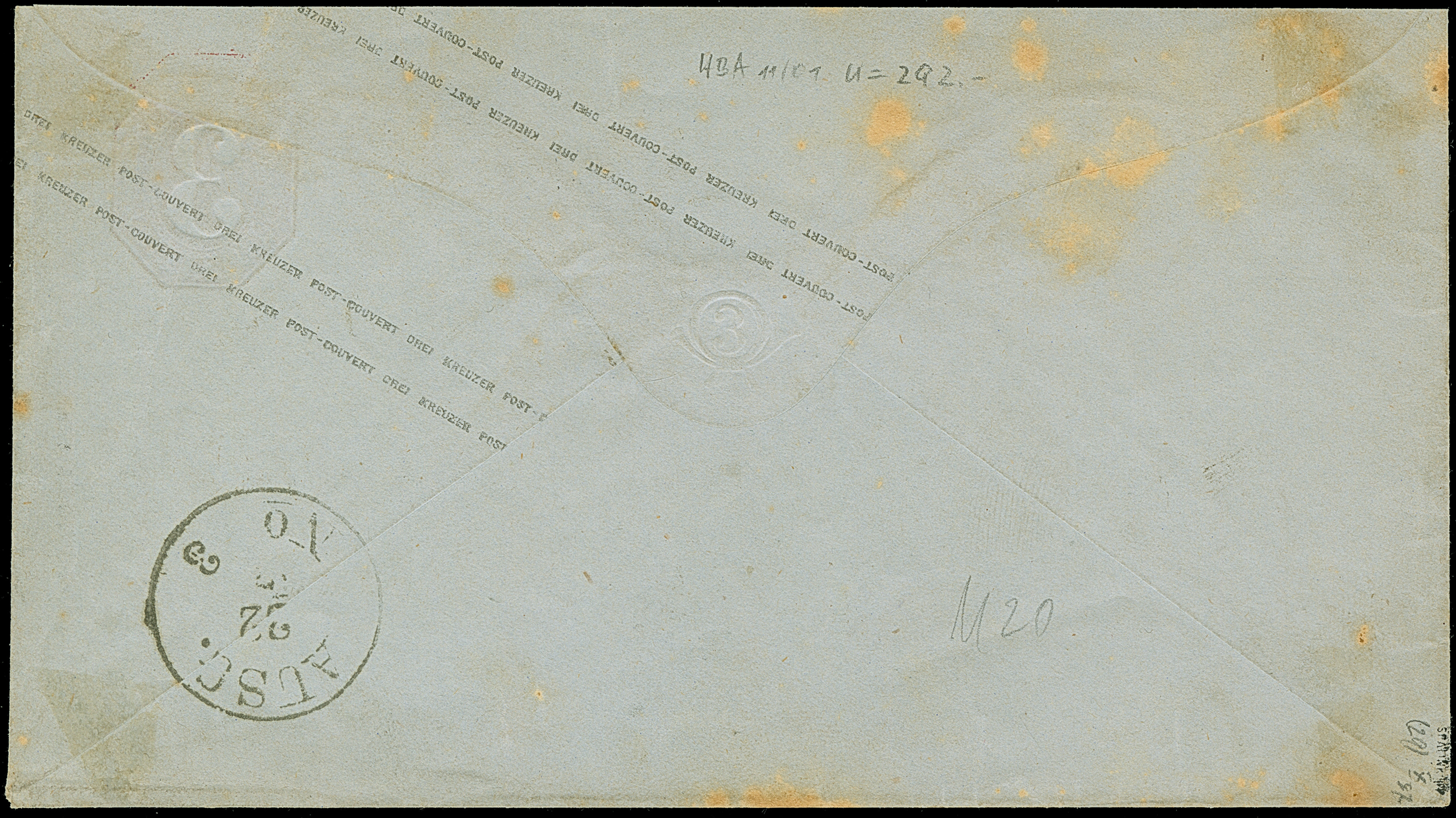 “MÜHLHAUSEN i. ELS. 13. SEPTBR.73” (Spalink 26-4) mehrfach recht klar auf Ganzsachen-Umschlag kleiner Schild 3 Kr. mit tarifgerechter Zufrankatur kleiner Schild 2 Kr. rötlichorange im waagerechten Paar nach Bern mit Ankunftsstempel. Die farbfrischen Marken sind gut geprägt, üblich gezähnt und in einwandfreier Erhaltung, der Ganzsachen-Wertstempel hat einen Bug ist leicht gebrochen. Eine außergewöhnliche Verwendung von Marken in Kreuzerwährung im Groschengebiet, in Verbindung mit dem Hufeisenstempel aus dem Gebiet von Elsass-Lothringen eine Brustschild-Seltenheit, Fotoattest Krug BPP (2014)
