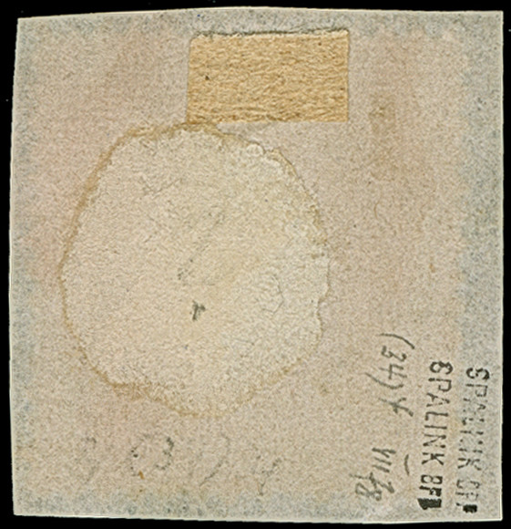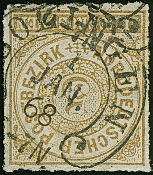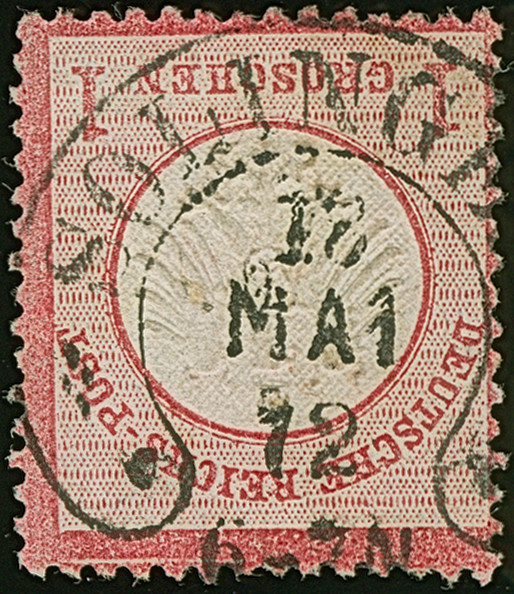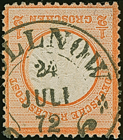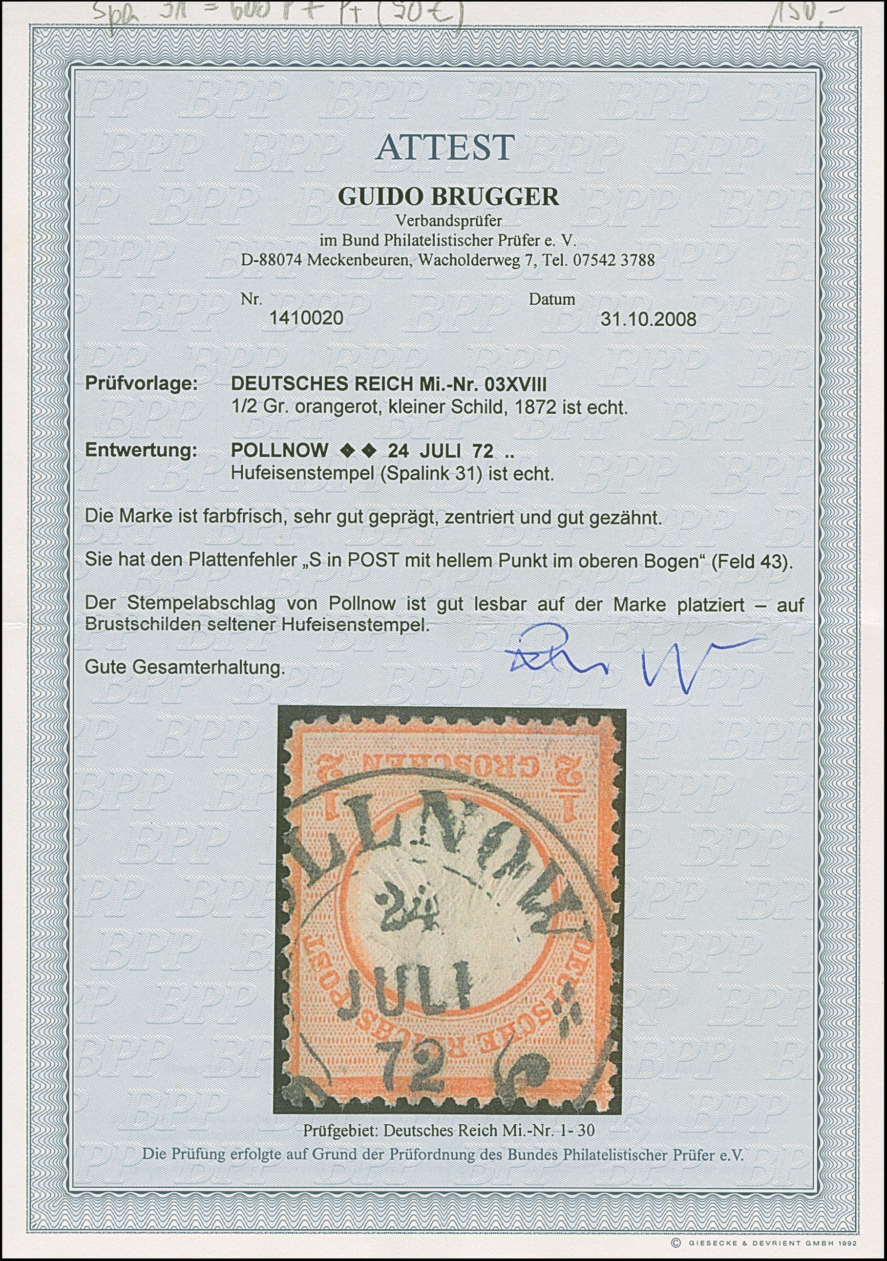 “POLLNOW 24.JULI.72” (Spalink 31) klar auf loser Marke kleiner Schild ½ Gr. orangerot mit Plattenfehler “S in POST mit hellem Punkt im oberen Bogen” (Feld 43). Die farbfrische Marke ist sehr gut geprägt, gut gezähnt und in einwandfreier Erhaltung. Eine dekorative Marke mit Plattenfehler und besserem Hufeisenstempel, Fotoattest Brugger BPP (2008)