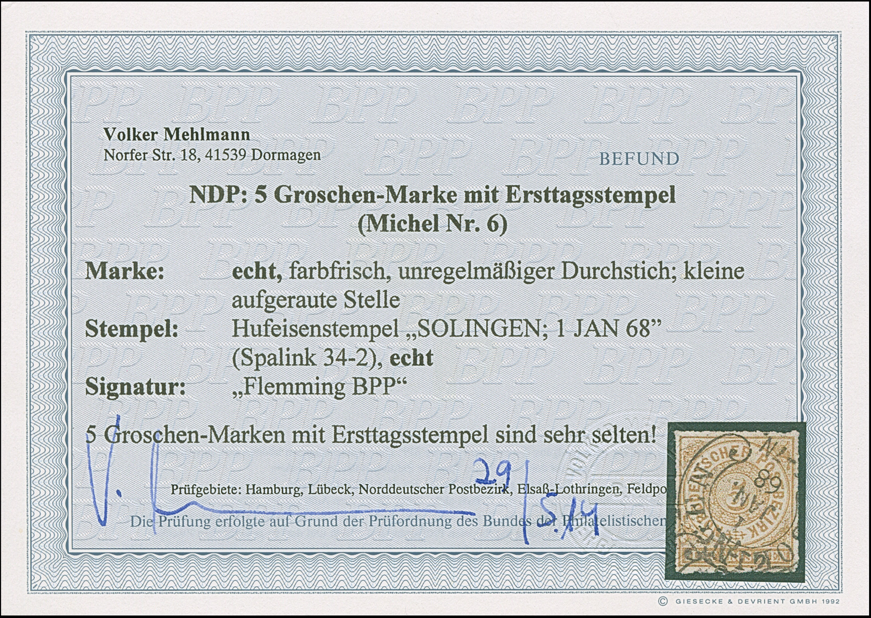 “SOLINGEN 1.JAN.68” (Spalink 34-2) klar auf loser Marke 5 Gr. durchstochen. Die farbfrische Marke hat einen unregelmäßigen Durchstich und eine kleine aufgeraute Stelle, sonst in guter Erhaltung. Ein optisch ansprechendes Exemplar mit auf dieser Wertstufe sehr seltenem Ersttagsstempel, Fotoattest Mehlmann BPP (2014)