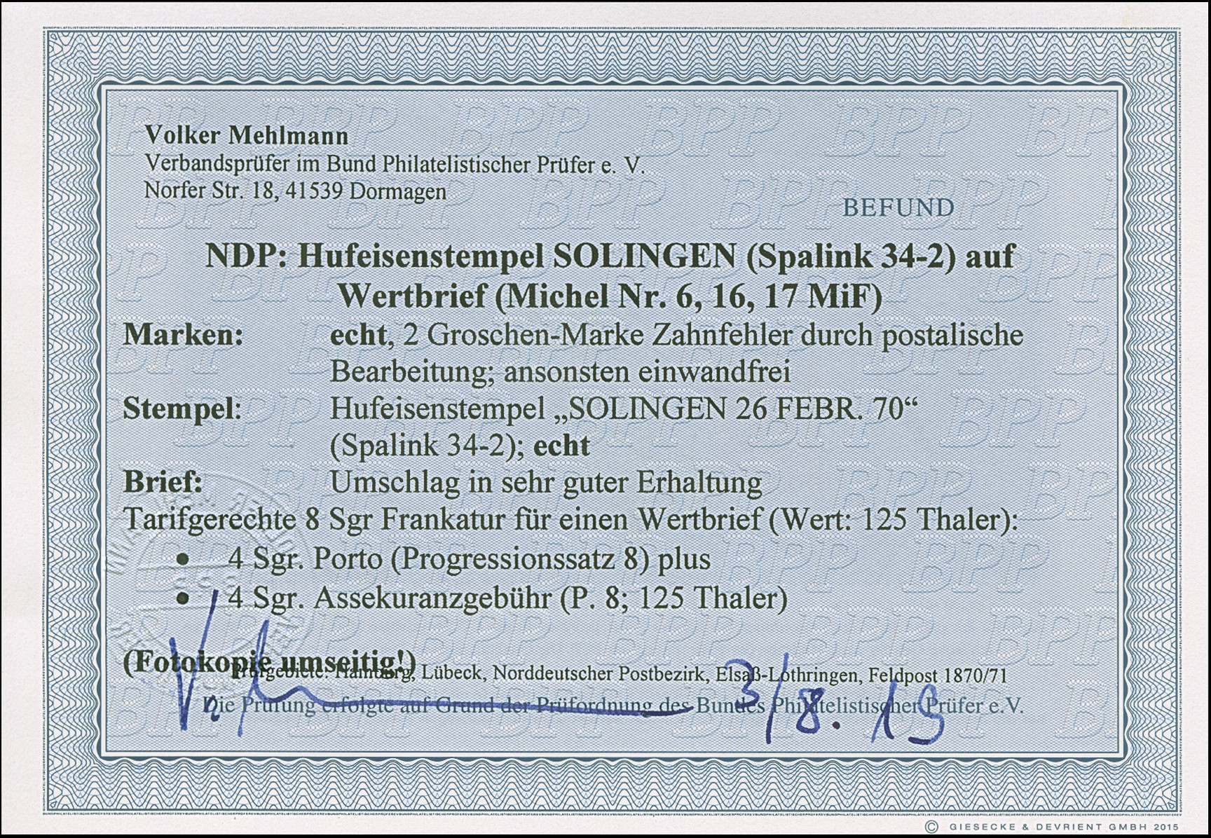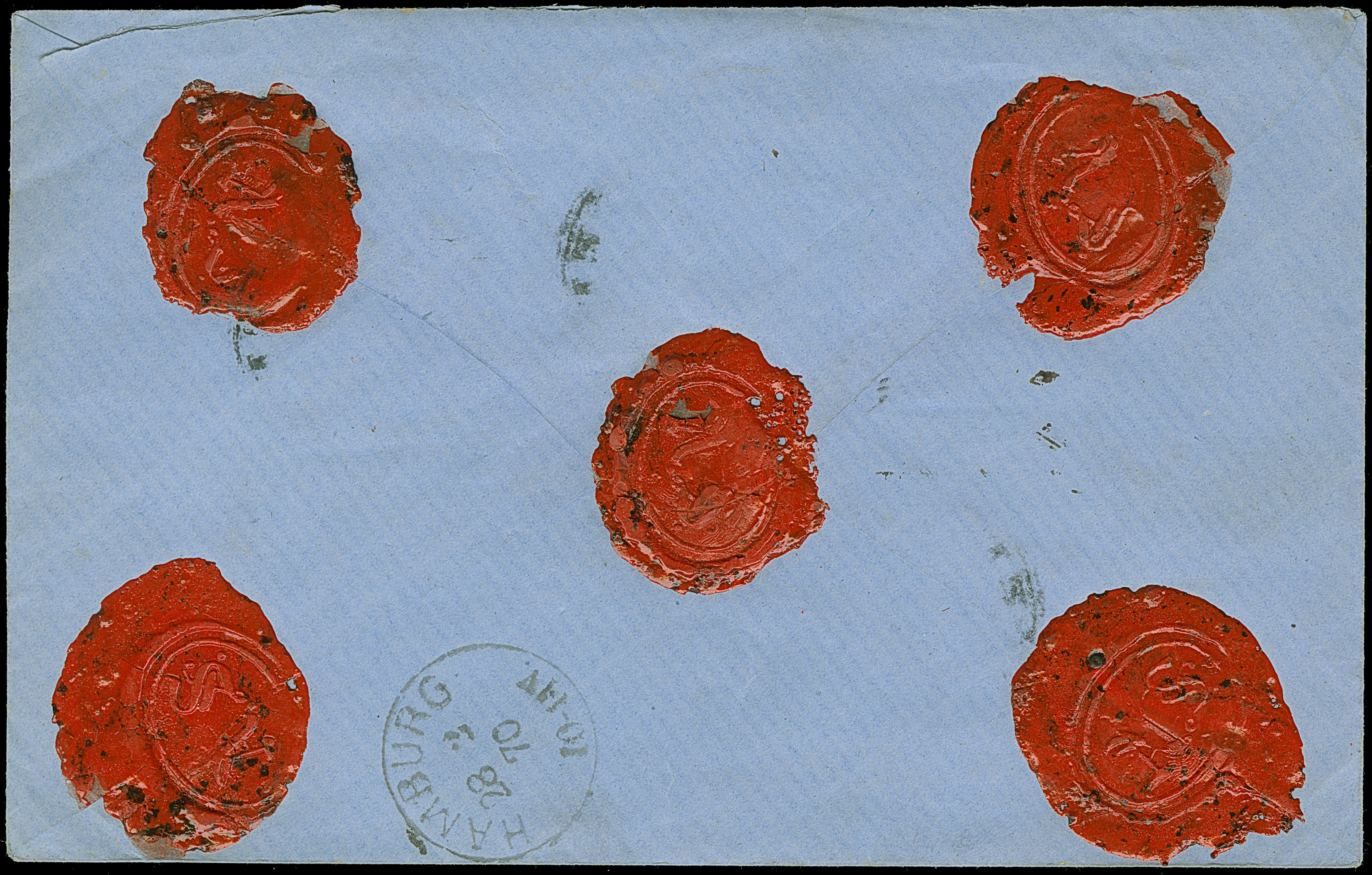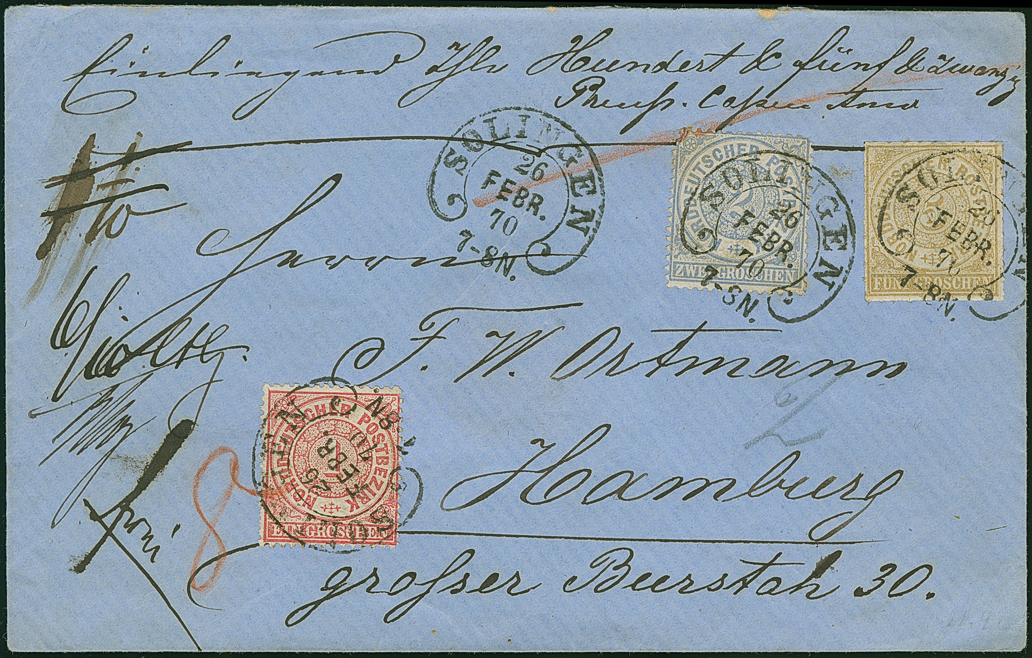 “SOLINGEN 26.FEBR.70” (Spalink 34-2) mehrfach klar auf Norddeutscher Postbezirk 5 Gr. durchstochen sowie 1 Gr. und 2 Gr. gezähnt auf Wertbriefkuvert über 125 Thaler nach Hamburg mit Ankunftsstempel. Die farbfrischen Marken sind bis auf einen kleinen Eckfehler bei der 2 Gr. durch den Rotstift wie der Umschlag in einwandfreier Erhaltung, rückseitig mit fünf kompletten Lacksiegeln. Ein dekorativer Wertbrief mit Fotobefund Mehlmann BPP (2019)