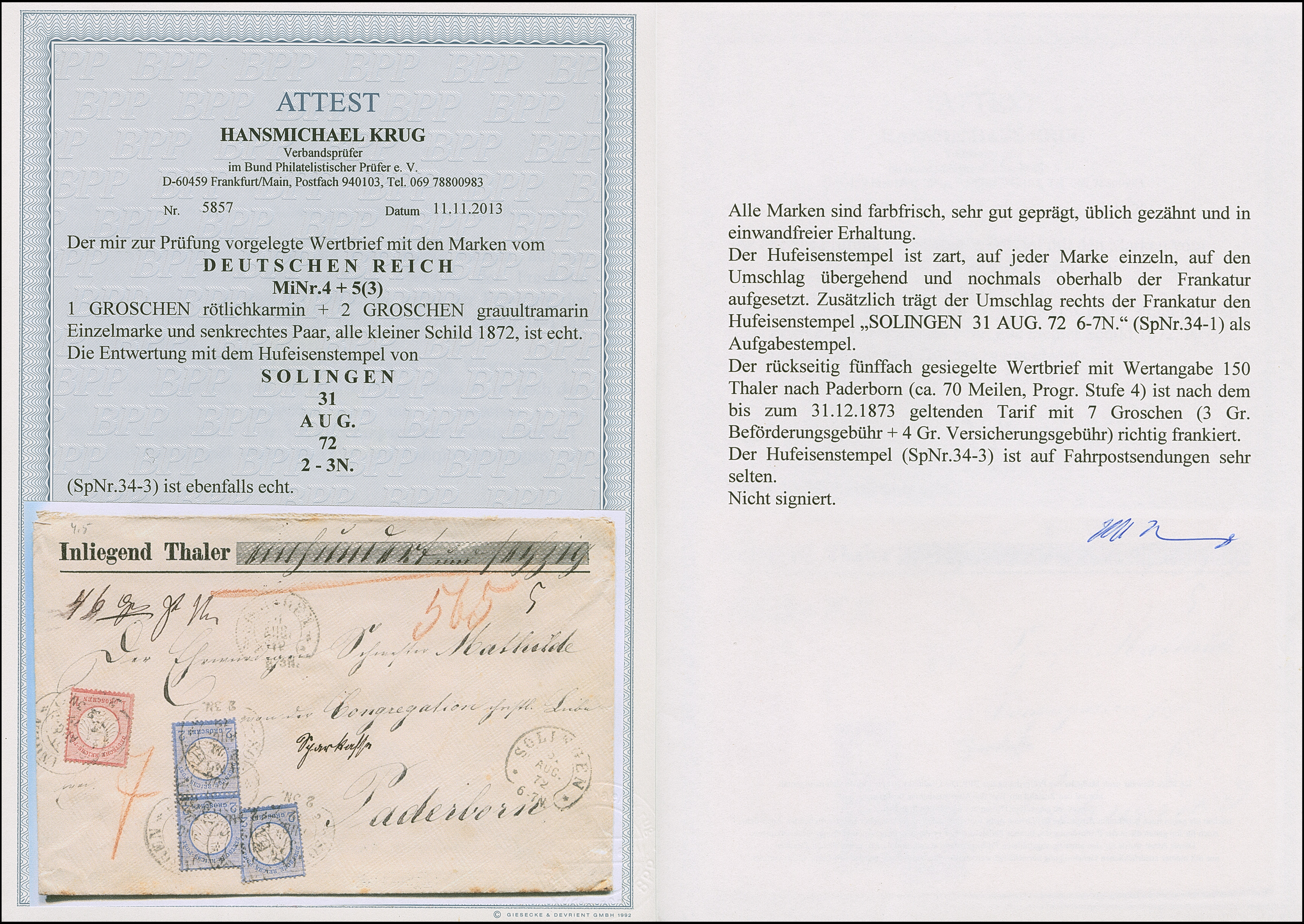 “SOLINGEN 31.AUG.72” (Spalink 34-3) mehrfach recht klar auf kleiner Schild 1 Gr. karmin sowie senkrechtem Paar und Einzelmarke 2 Sgr. grauultramarin als tarifgerechte Frankatur auf Wert-Briefkuvert über 150 Thaler mit zusätzlichem Hufeisenstempel “SOLINGEN 31.AUG.72” (Spalink 34-1) nach Paderborn mit Ausgabestempel. Die farbfrischen Marken sind sehr gut geprägt, üblich gezähnt und in einwandfreier Erhaltung, der Umschlag mit leichten Beförderungsspuren. Ein dekorativer Wertbrief mit auf Fahrpost-Sendungen sehr seltenem Hufeisenstempel, Fotoattest Krug BPP (2013)